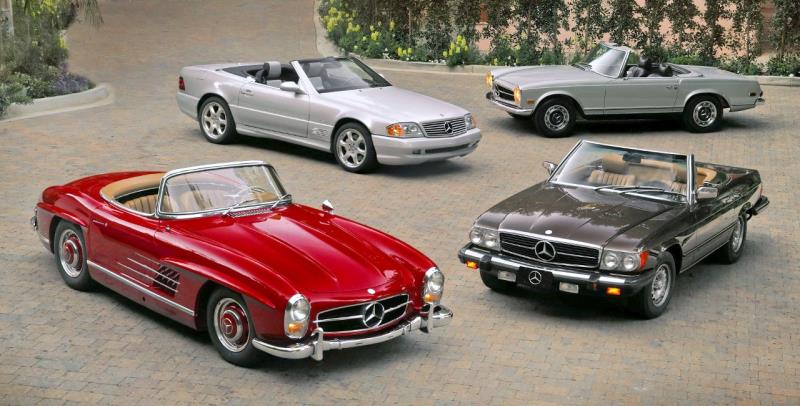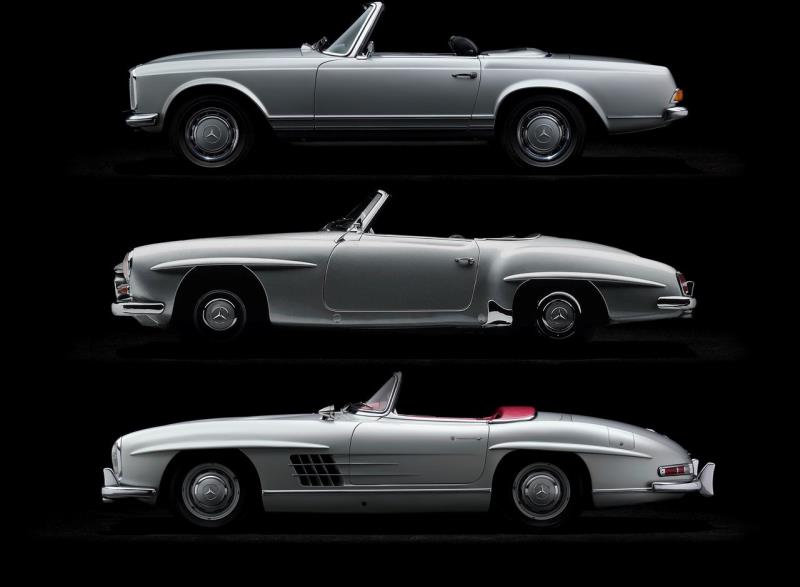 L’aventure SL roadster avec toit en toile a débuté au milieu des années cinquante avec la découvrable du modèle à portes “papillon”, le succès est au rendez-vous pour ses 1858 versions produites qui aujourd’hui se négocient à prix d’or (près d’un million d’euros, une folie)…, tout comme celle de la 190 SL à moteur quatre cylindres, la petite sœur avec un moteur sans doute increvable mais un peu anémique.