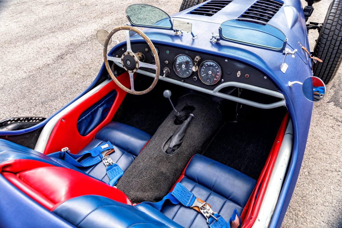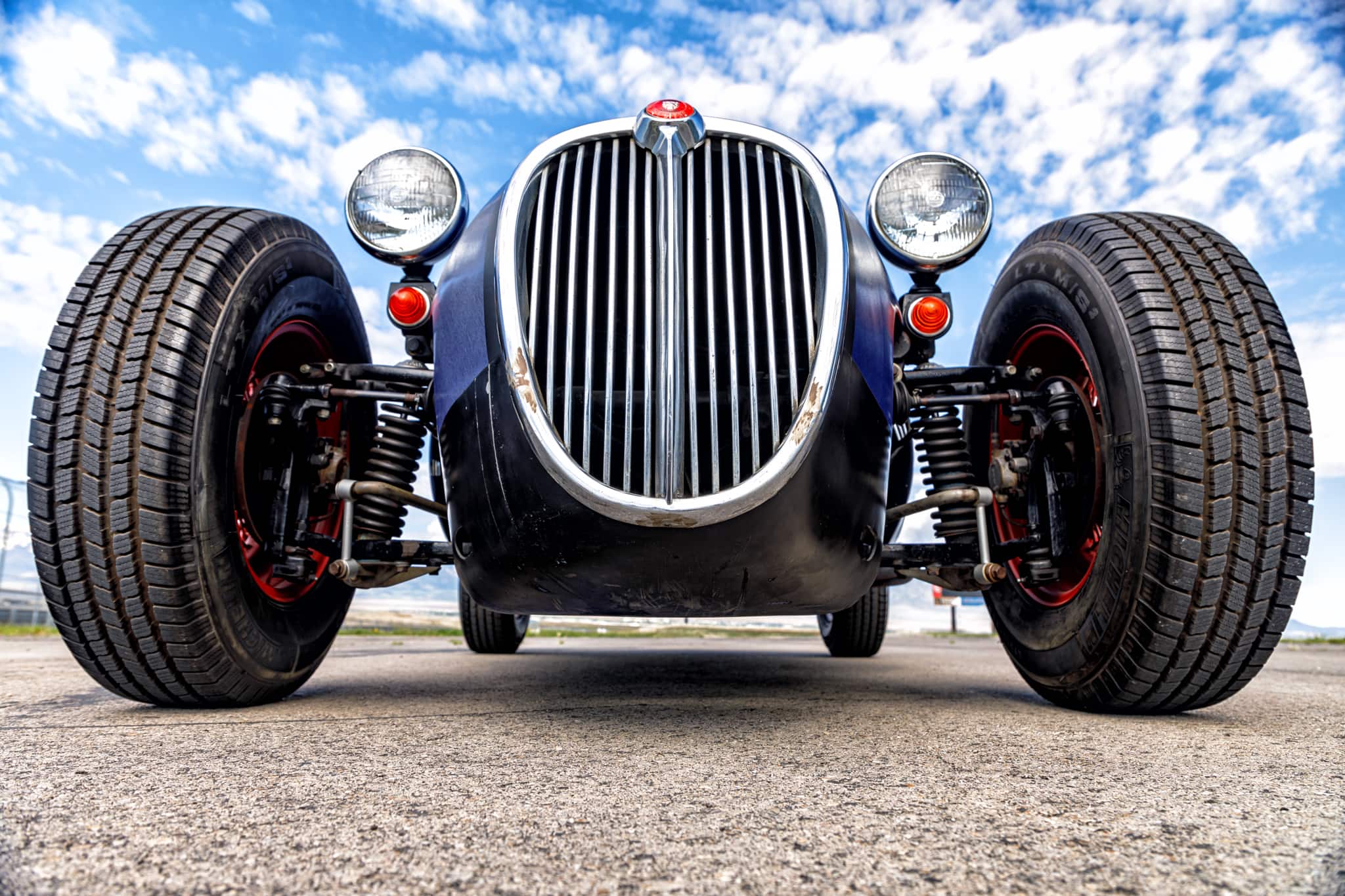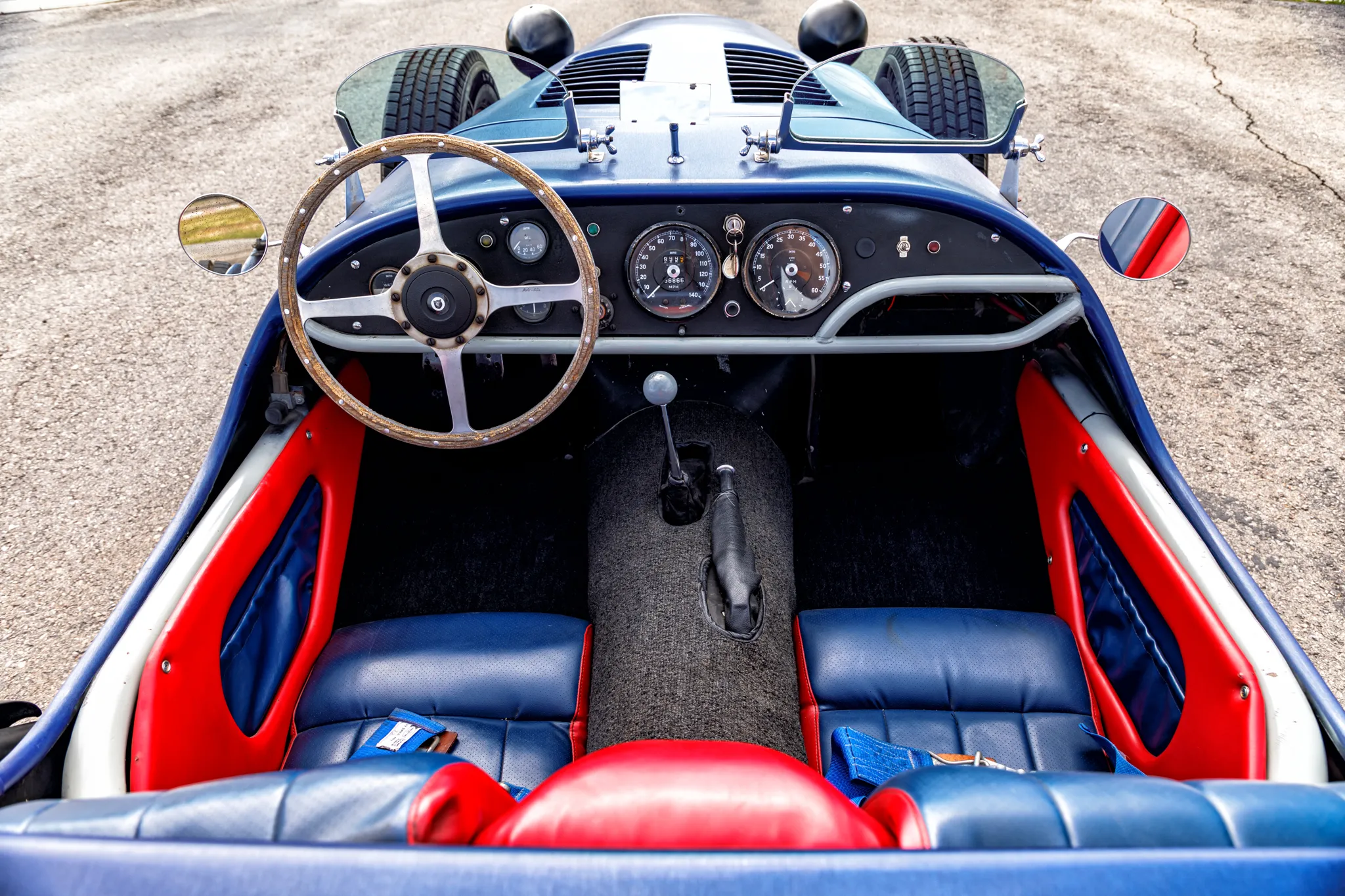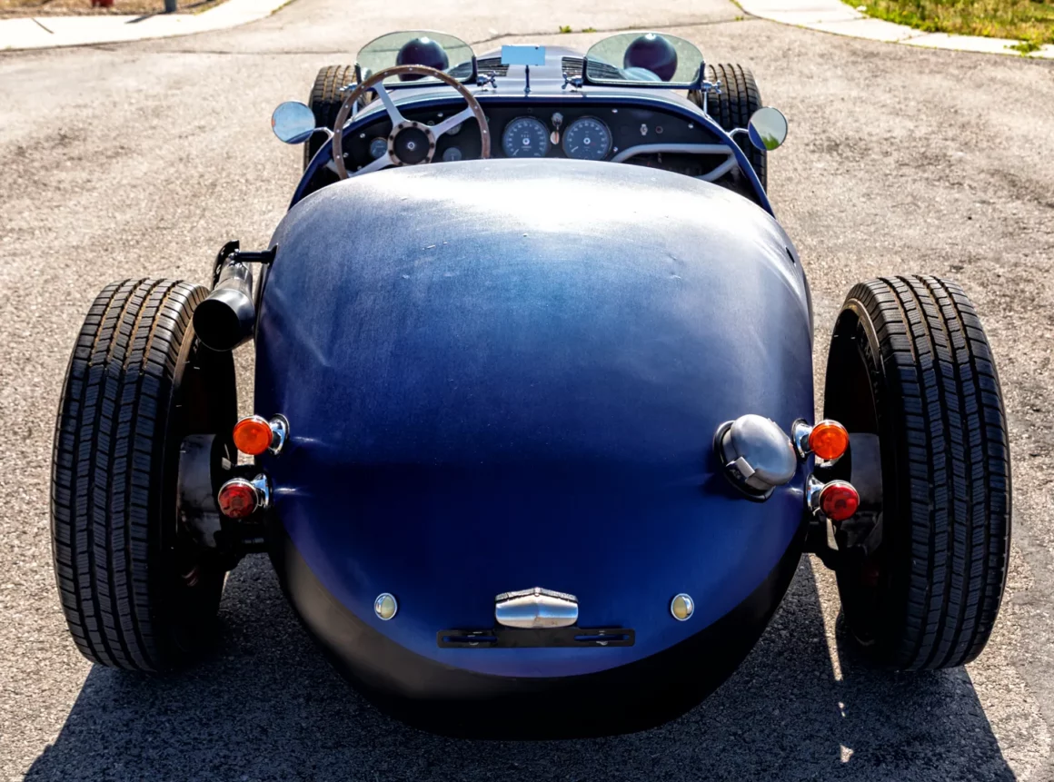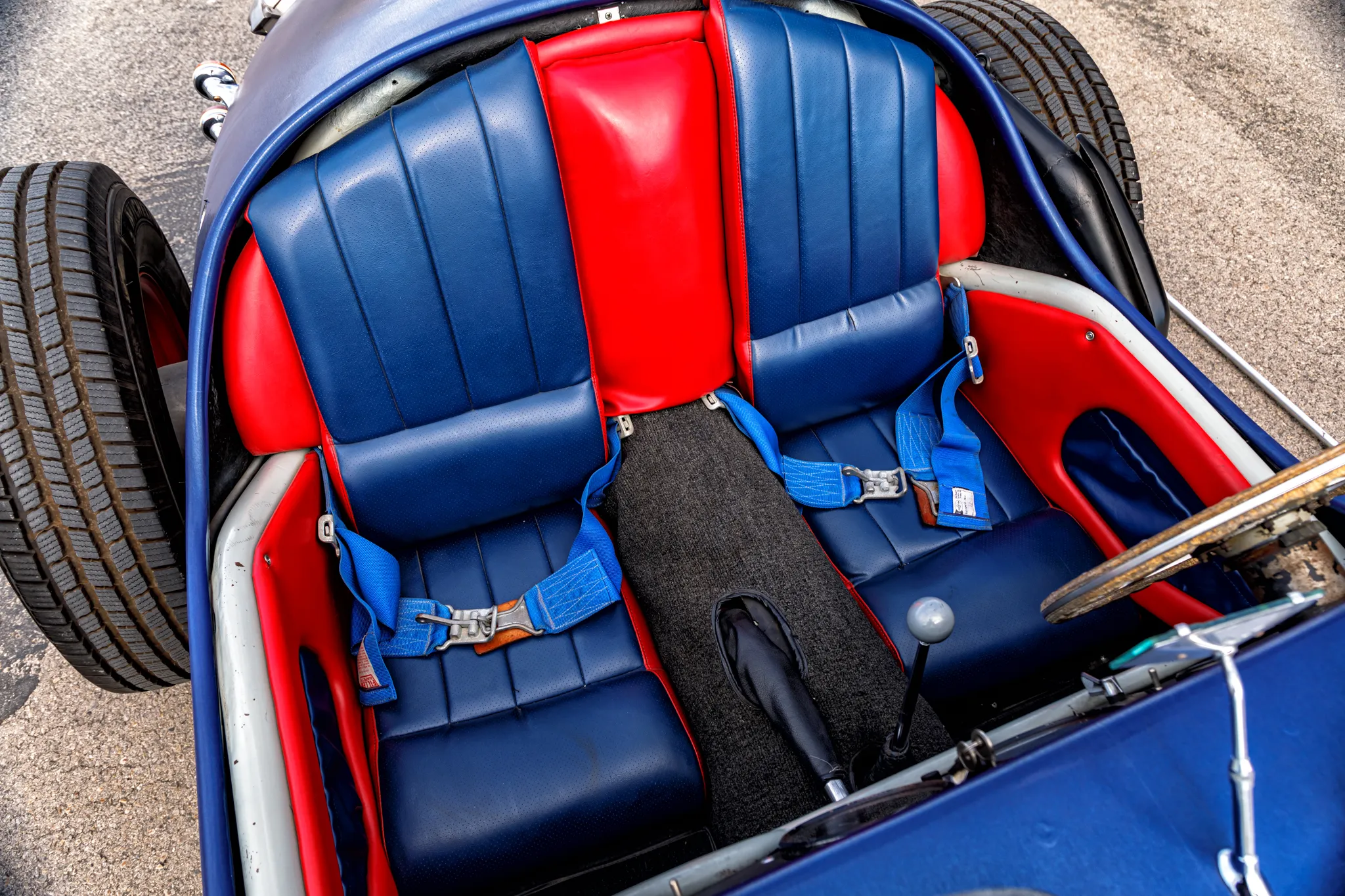 Sous l’arrière bulbeux, se trouve un réservoir d’essence rempli de mousse anti-explosion et il reste de la place pour emmener une roue de secours (mais aucune fixation n’est prévue). Il faisait un moche temps, ce jour-là., c’était sympathique, mais la température était sub-antarctique et un méchant crachin de pluie tombait par intermittence. “Chouette”, me suis-je dit avec humour. C’était le temps idéal pour tester un roadster sans capote ni pare-brise. Évidemment, j’avais le chauffage pour me tenir les jambes au chaud, les sièges étaient bien confortables et si je conduisais assez vite, je ne serais même pas mouillé… Pour les commandes c’est simple : “La pédale de droite, c’est l’accélérateur, celle du milieu c’est…Pfffffff !” ! Le reste étant “Pouet-Pouet c’est Moa que vlà”… Installé dans mon siège et en dépit de ma taille de géant, je n’ai rien dû ajuster pour atteindre les pédales ou le volant.