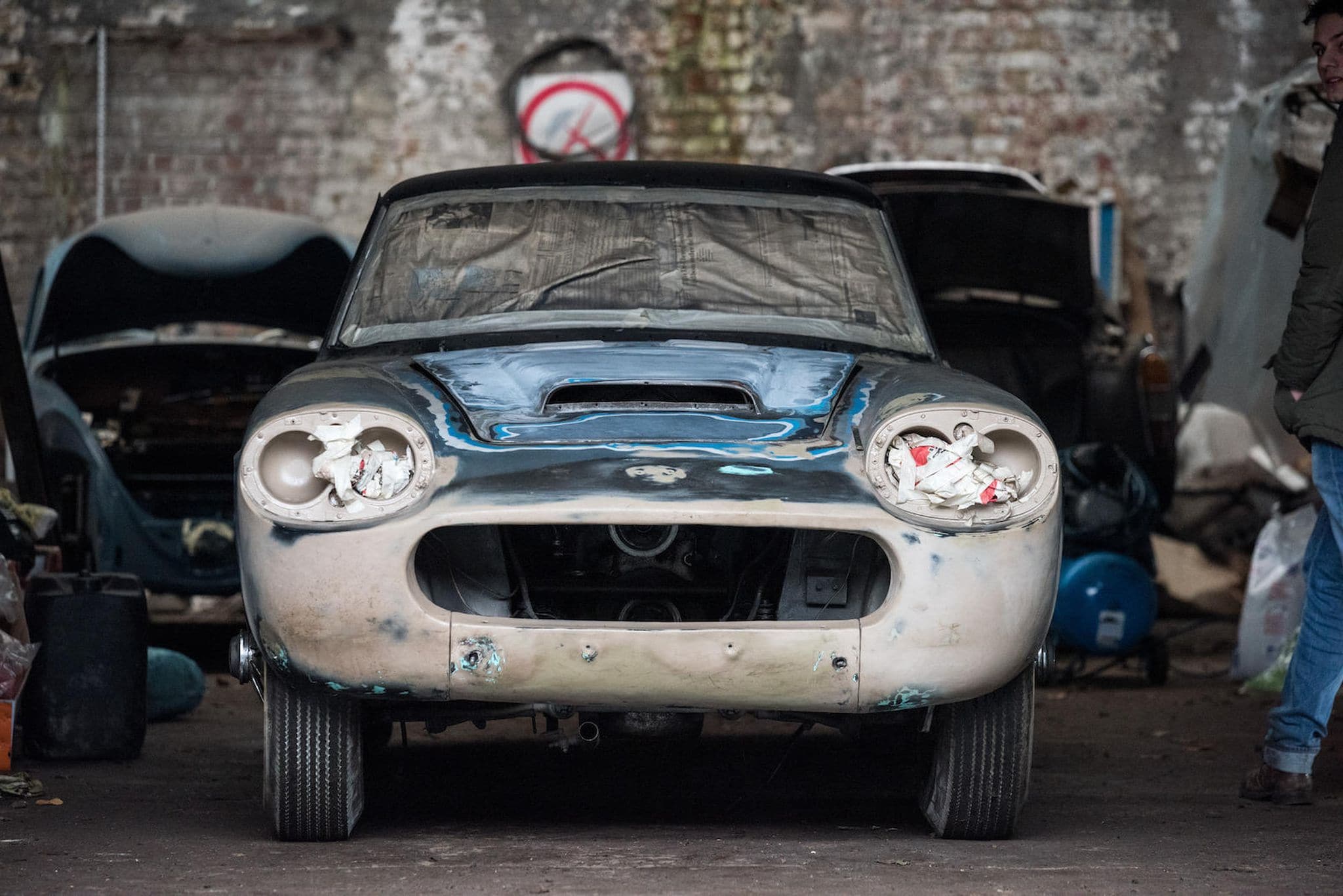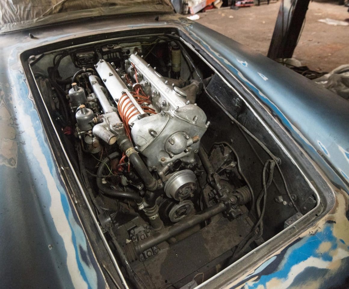 Dans des conditions qui ne sont pas clairement établies, (un inconnu a acheté l’épave au casseur pour compte du carrossier italien Michelotti qui voulait créer une Jaguar Spéciale) celui-ci hérite de l’épave, dont il n’a besoin que des “papiers”…, le châssis et le moteur proviennent d’une Jaguar XK 140 “coursifiée”) qui a fait un tonneau.