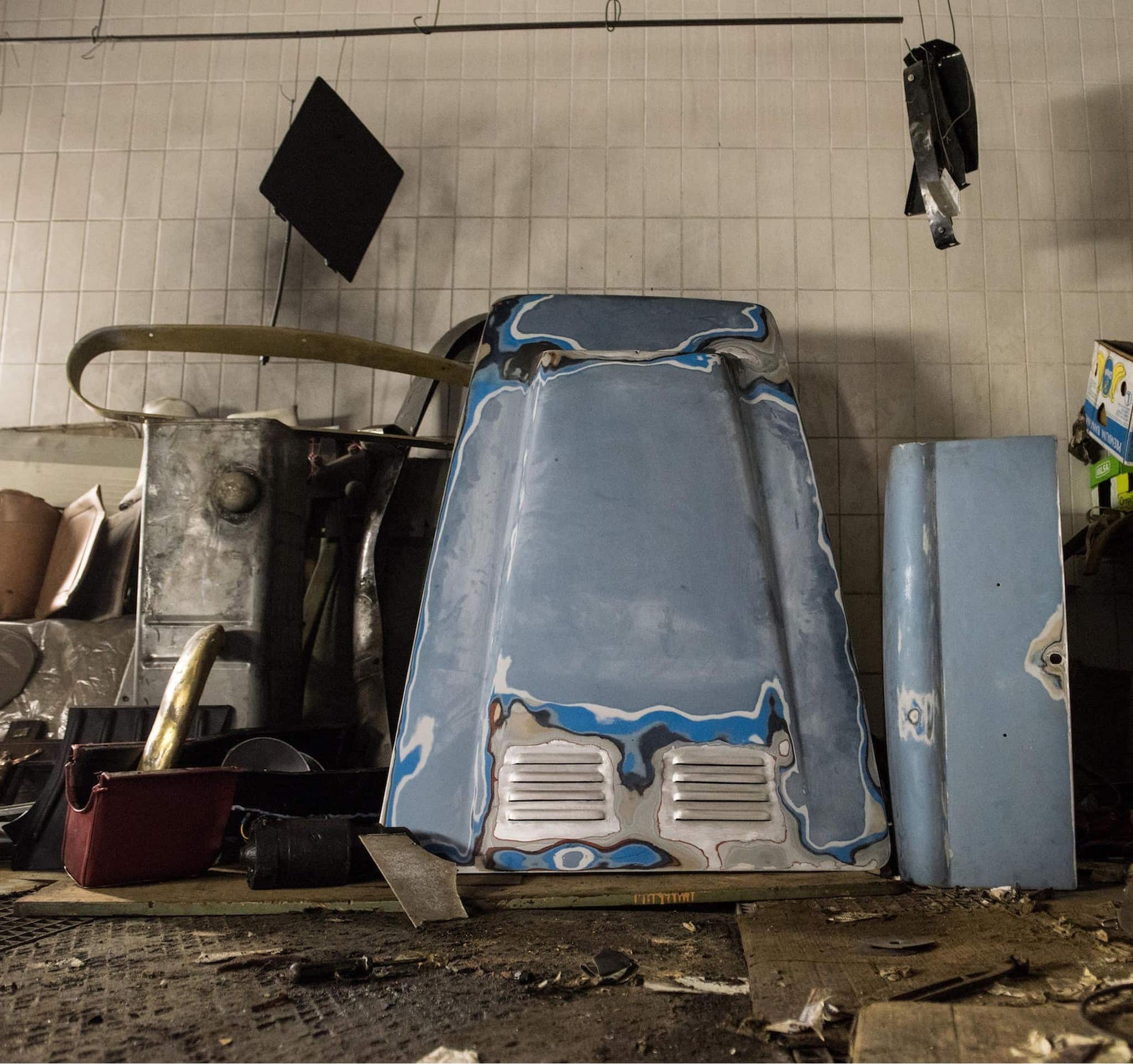 – D’abord, examinons le réel, cette voiture n’est pas pourrie, mais nécessite une restauration complète, elle était bleue lorsqu’elle a été photographiée par un magazine, en 1999, et M. Schepens y a beaucoup travaillé pour établir l’état du métal en dessous de la peinture. Les sièges ont été refaits en rouge, et, à voir “l’épave” c’était la preuve que ce travail avait commencé…
