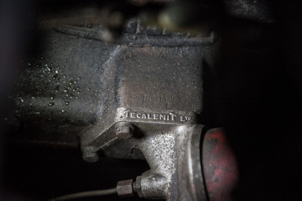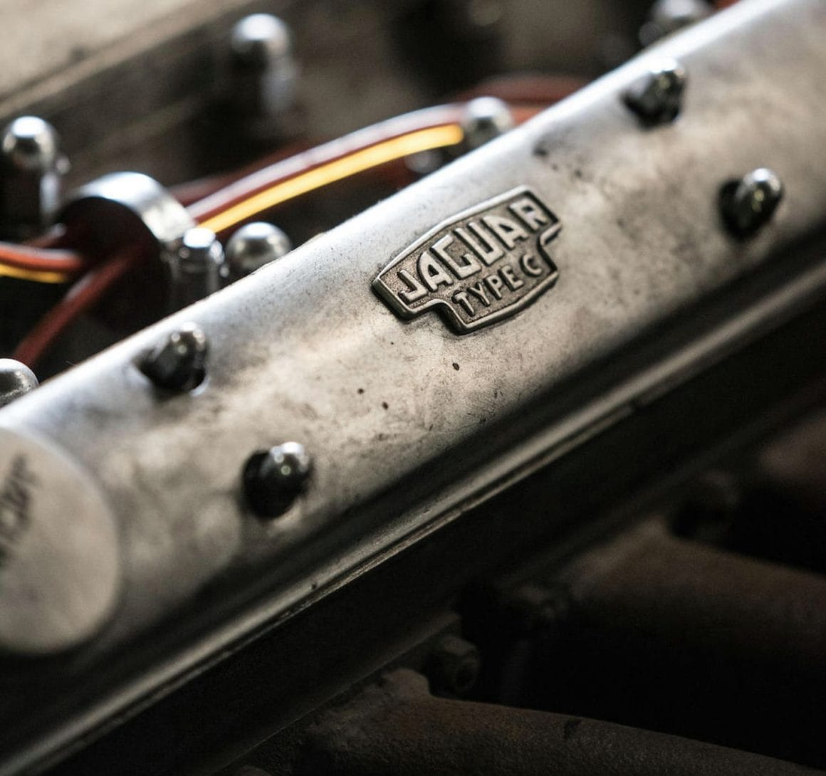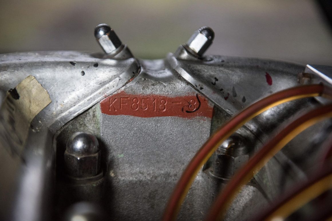 – Le badge “Jaguar Type C” sur un des caches-culbuteurs ne signifie pas que le moteur est un vrai C-type. Les photos d’époque de la XKC016 écrasée montrent que le moteur d’origine n’avait aucun badge sur ses caches. La tête de rechange est KF8518-8… et le type B qui est indiqué ne concerne que les 1957-59 3.4 Saloon…, le chiffre 8 indiquant le taux de compression. Le champ libre pour le marquage du bloc serait 8:1 aussi…, et je suis surpris que ce moteur même construit pour la concurrence ne serait qu’un 8:1…, le plus haut taux de compression disponible de l’usine était alors 9:1…