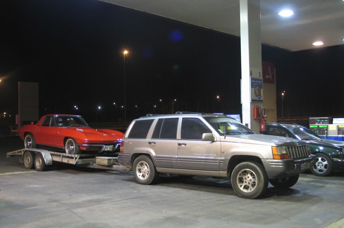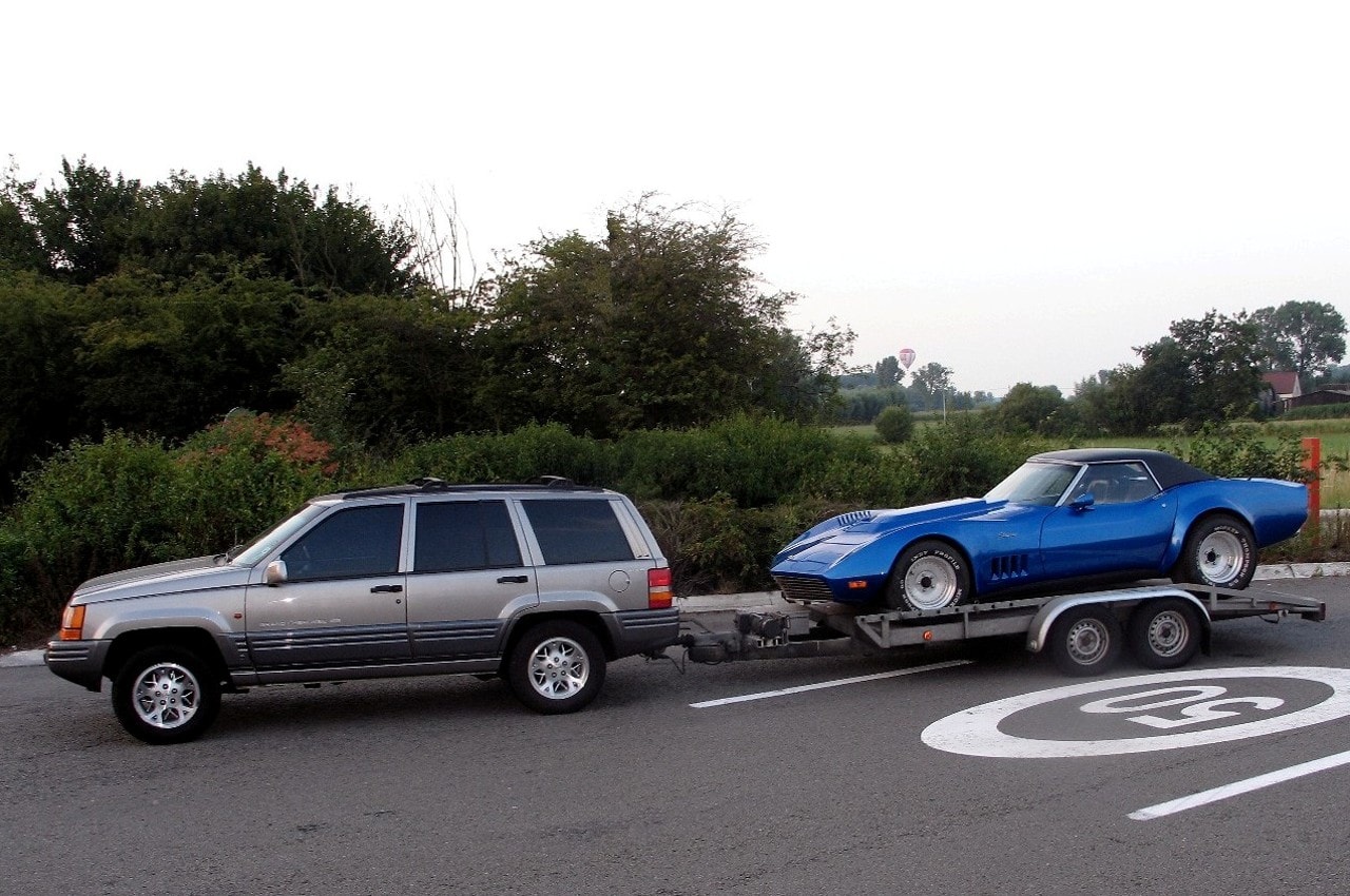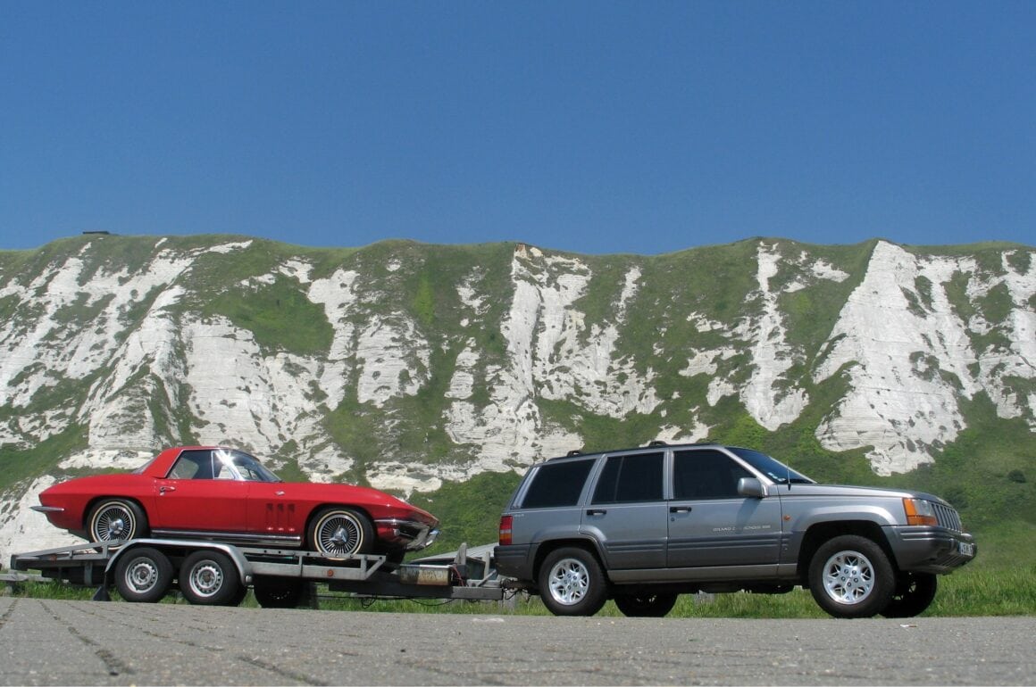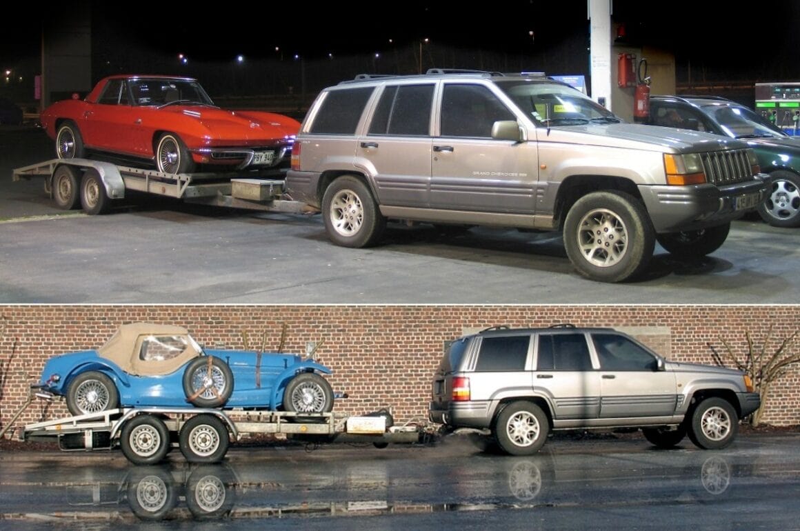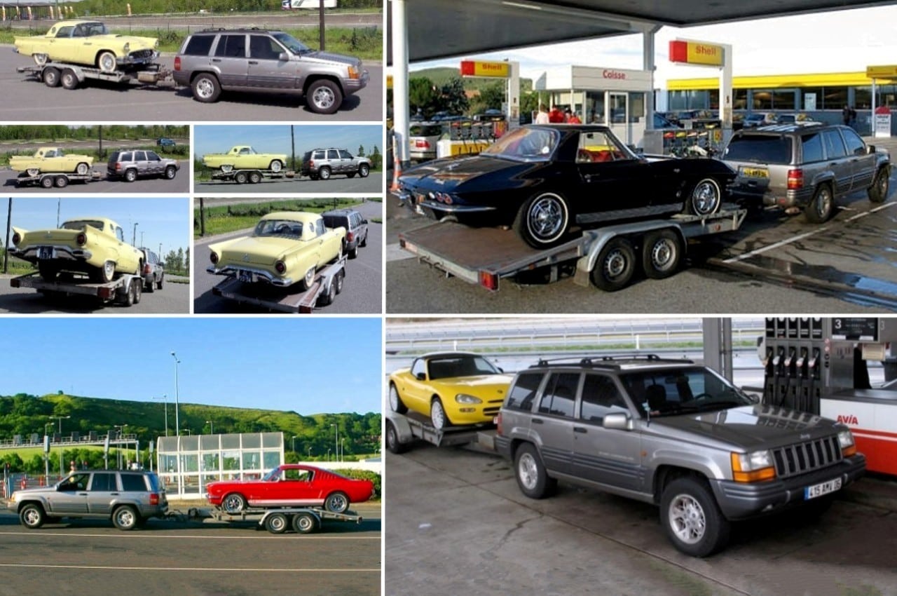 La Grand Cherokee était aussi proposée avec un tout nouveau moteur V8 essence de 5,2 litres de 215 chevaux qui portait la capacité de remorquage à 3 tonnes et rendait la Grand Cherokee idéale pour tracter une caravane Airstream ou une remorque porte-voiture… Pouvoir tracter une remorque porte-voiture et circuler dans le luxe et le confort, c’est ce qu’il me fallait… La nouvelle Grand Cherokee était assurément la bête avec laquelle je pourrais déplacer mes bagnoles de collection pour des ventes aux enchères (chacune son tour, bien sûr) sans plus devoir téléphoner à deux heures du matin à un dépanneur pour une Excalibur en panne… pour une Clénet en rideau… pour une Zimmer à l’agonie… pour un Hot-Rod en grève… Bref, pour n’importe laquelle de ces bêtises “roulables”… Pouvoir partir vers n’importe où (et en revenir) : Monaco, Saint-Tropez, Biarritz, Strasbourg, la Belgique, la Suisse, l’Allemangne, le Royaume-Uni d’Angleterre et même la Suède et l’Espagne… Plus de soucis pour les réunions, les ventes aux enchères, voire pour des achats, des échanges… Serein… Toujours…