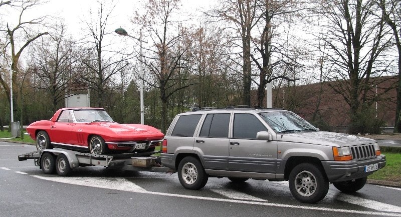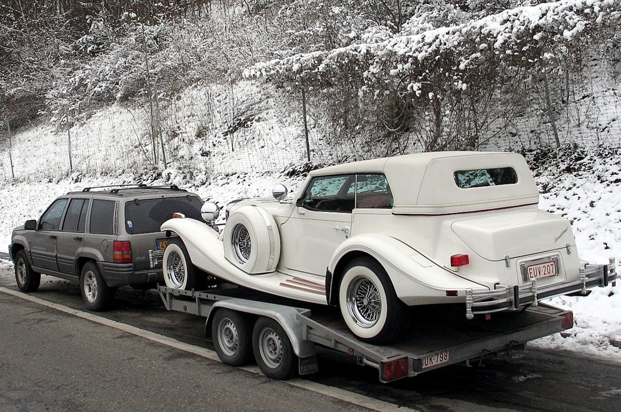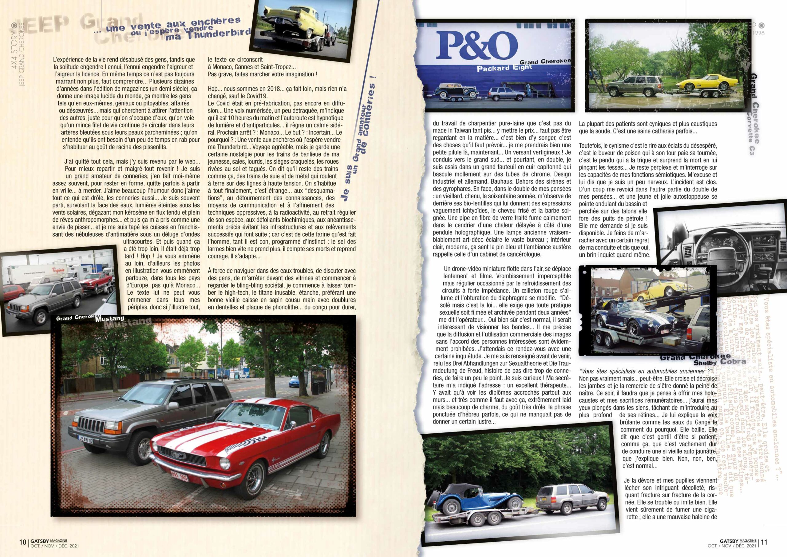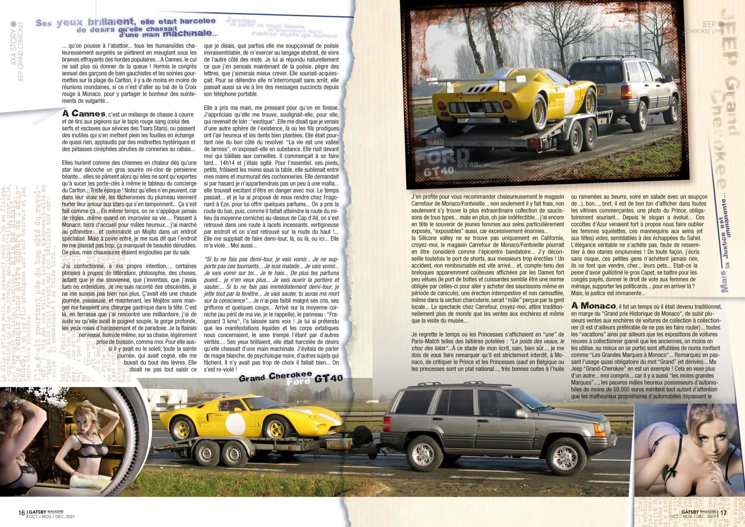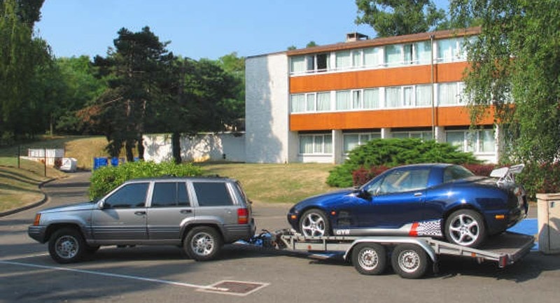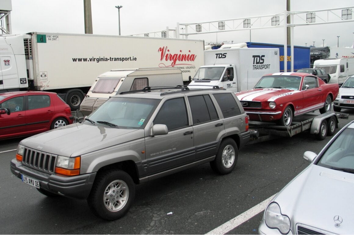 La Grand Cherokee était aussi proposée avec un tout nouveau moteur V8 essence de 5,2 litres de 215 chevaux qui portait la capacité de remorquage à 3 tonnes et rendait la Grand Cherokee idéale pour tracter une caravane Airstream ou une remorque porte-voiture… Pouvoir tracter une remorque porte-voiture et circuler dans le luxe et le confort, c’est ce qu’il me fallait… La nouvelle Grand Cherokee était assurément la bête avec laquelle je pourrais déplacer mes bagnoles de collection pour des ventes aux enchères (chacune son tour, bien sûr) sans plus devoir téléphoner à deux heures du matin à un dépanneur pour une Excalibur en panne… pour une Clénet en rideau… pour une Zimmer à l’agonie… pour un Hot-Rod en grève… Bref, pour n’importe laquelle de ces bêtises “roulables”… Pouvoir partir vers n’importe où (et en revenir) : Monaco, Saint-Tropez, Biarritz, Strasbourg, la Belgique, la Suisse, l’Allemangne, le Royaume-Uni d’Angleterre et même la Suède et l’Espagne… Plus de soucis pour les réunions, les ventes aux enchères, voire pour des achats, des échanges… Serein… Toujours…