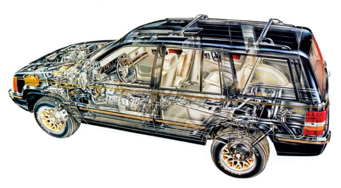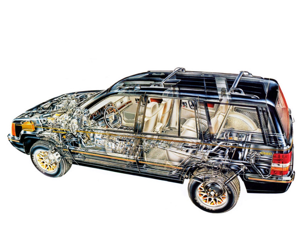 Avec le rachat par Chrysler, les équipes du français François Castaing avaient réorienté le projet initial vers un complément du Cherokee plutôt qu’en réalisant un successeur, car depuis le milieu des années ’80, AMC-Jeep, sous l’impulsion de Renault, s’était grandement modernisé et réorganisé, offrant sur un plateau à Chrysler un outil industriel de premier ordre et de nouvelles méthodes (logiciel de conception par ordinateur, systèmes de plate-forme) qui allait pleinement bénéficier à Jeep, mais aussi à la marque au Pentastar. Avec le Grand Cherokee, Jeep élargissait avec retard son offre en remplaçant le vieillissant Grand Wagoneer type SJ, lancé en 1962 !
