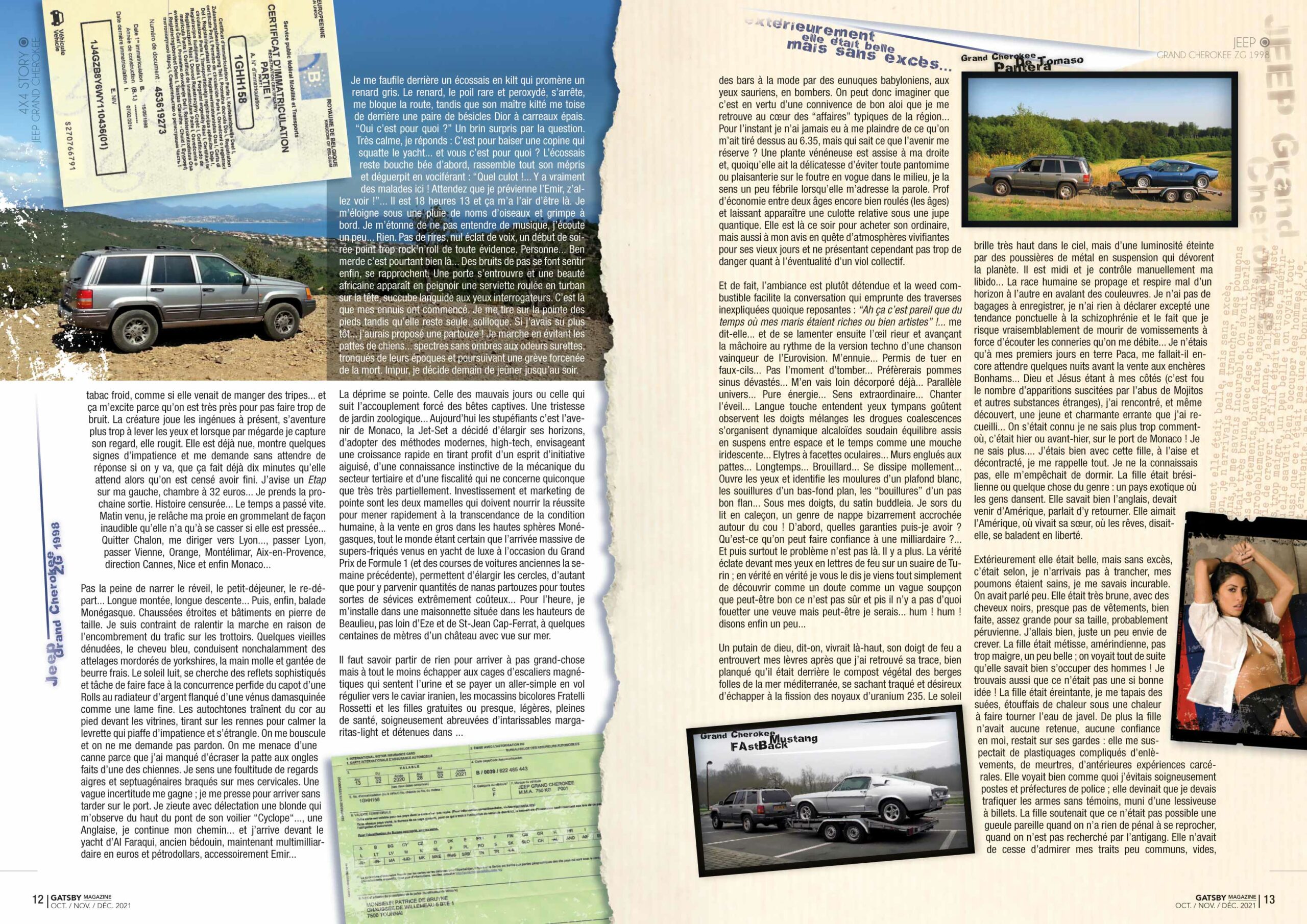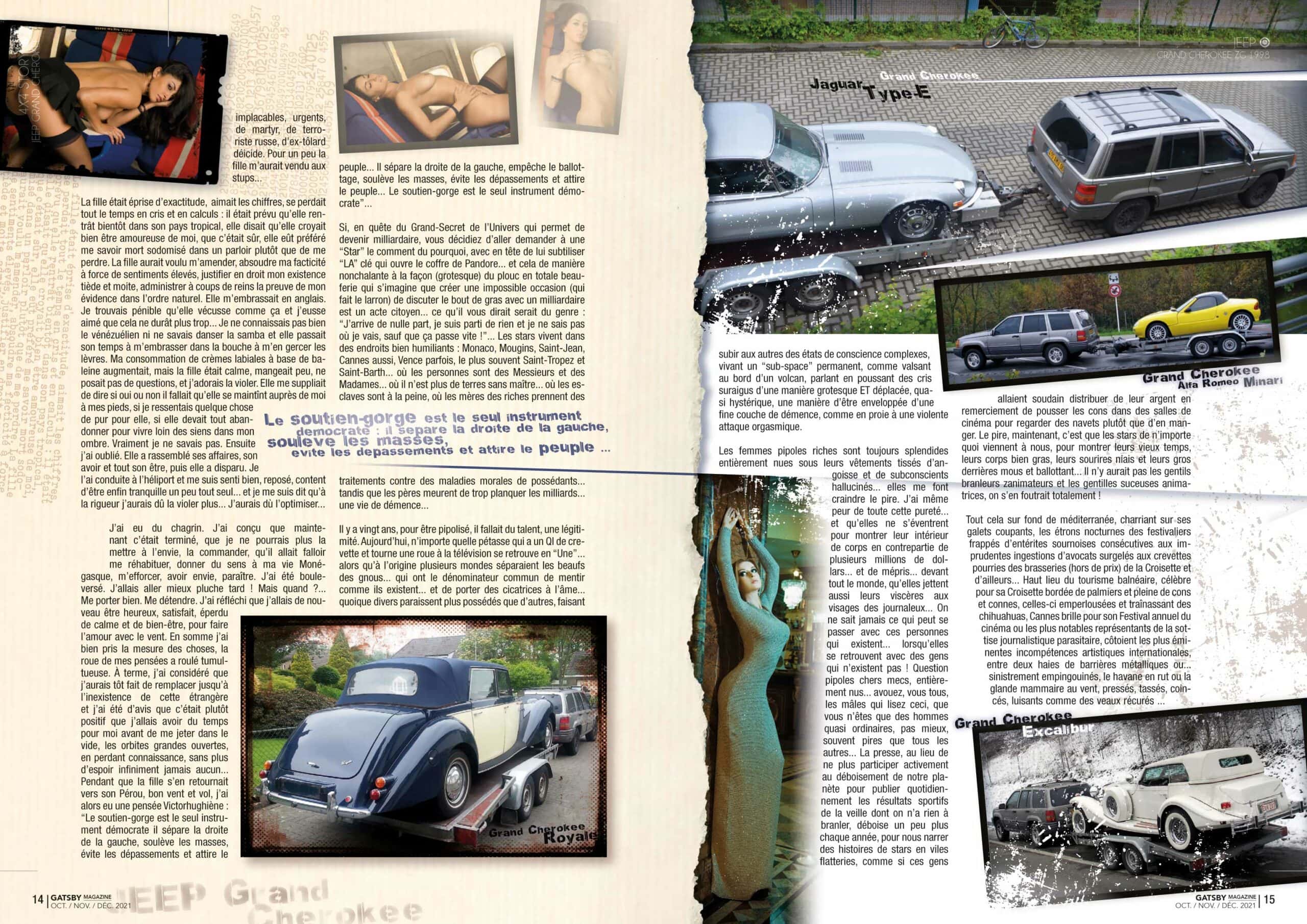 Mais comme me l’a susurré une amie : “Tout est relatif mon cher Patrice, un yacht “normal” se loue 180.000 euros la semaine, plus les frais, le champagne, le foie gras et le caviar, le gas-oil et mille autres petites choses et cadeaux pour moi. Tu me donnes 1000 euros en prime et tu peux me violer toute la journée“… On aura du mal à me trouver. Je pense vivre prochainement au bord du monde, dans des terres éloignées, juste au pied des montagnes, à égale distance du ciel et de l’enfer. Je braverai la neige, la famine et les loups plutôt que tuer le temps en terrasse d’un bar. Mon amour me dira : “Non, viens, allons marcher pour penser, baiser et parler”. On prendra ma voiture, une rustique Jeep. On roulera longtemps. On grimpera les hauteurs. Les routes sinueuses gêneront la progression. On finira par s’arrêter aux abords annoncés d’un parc naturel. C’est fréquent en montagne les parcs naturels, je dirai… “Ça fait vivre les pécores ! Drapeau à damiers… Envie de jouer aux dames… Fin de la course !”… https://www.GatsbyOnline.com