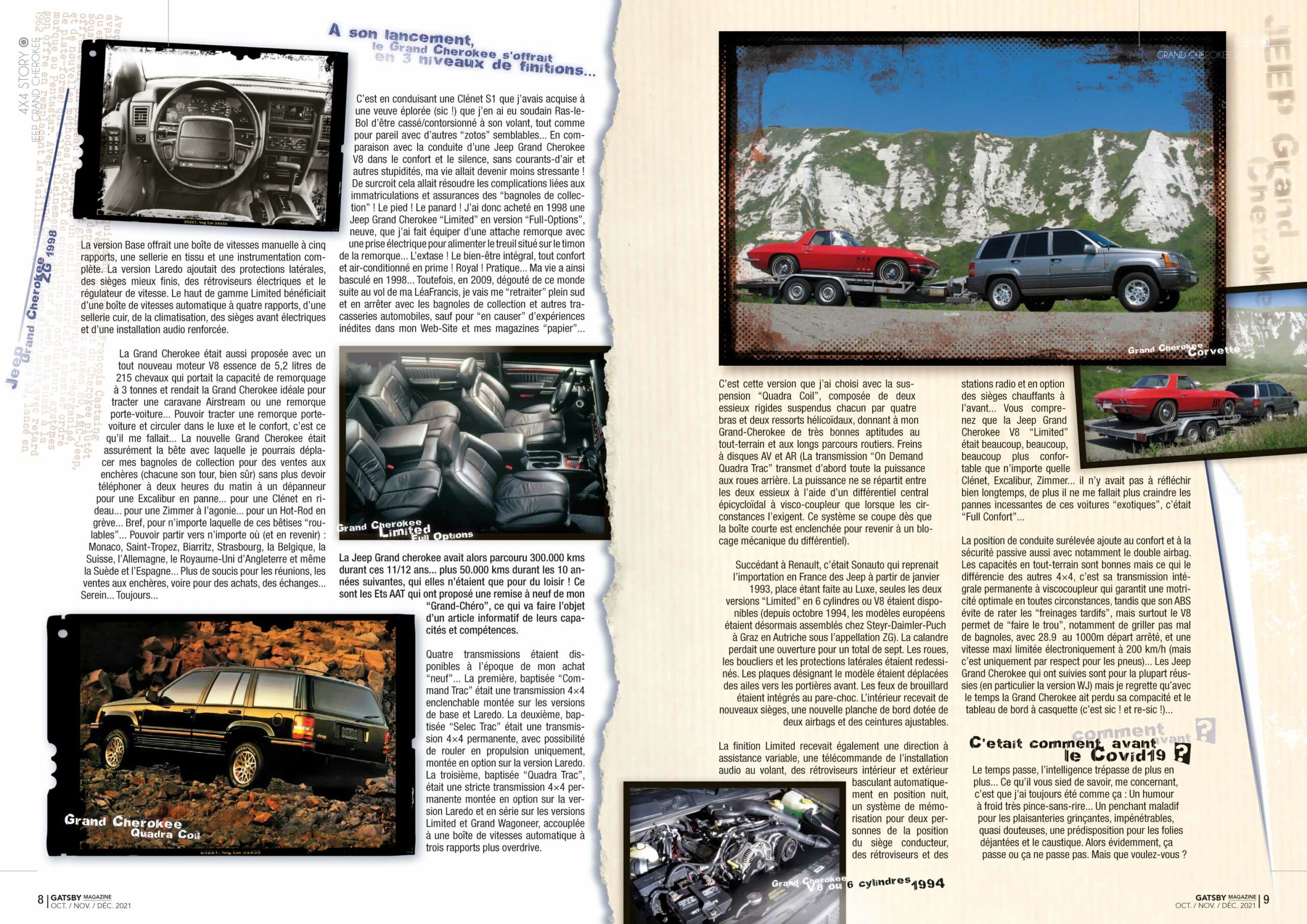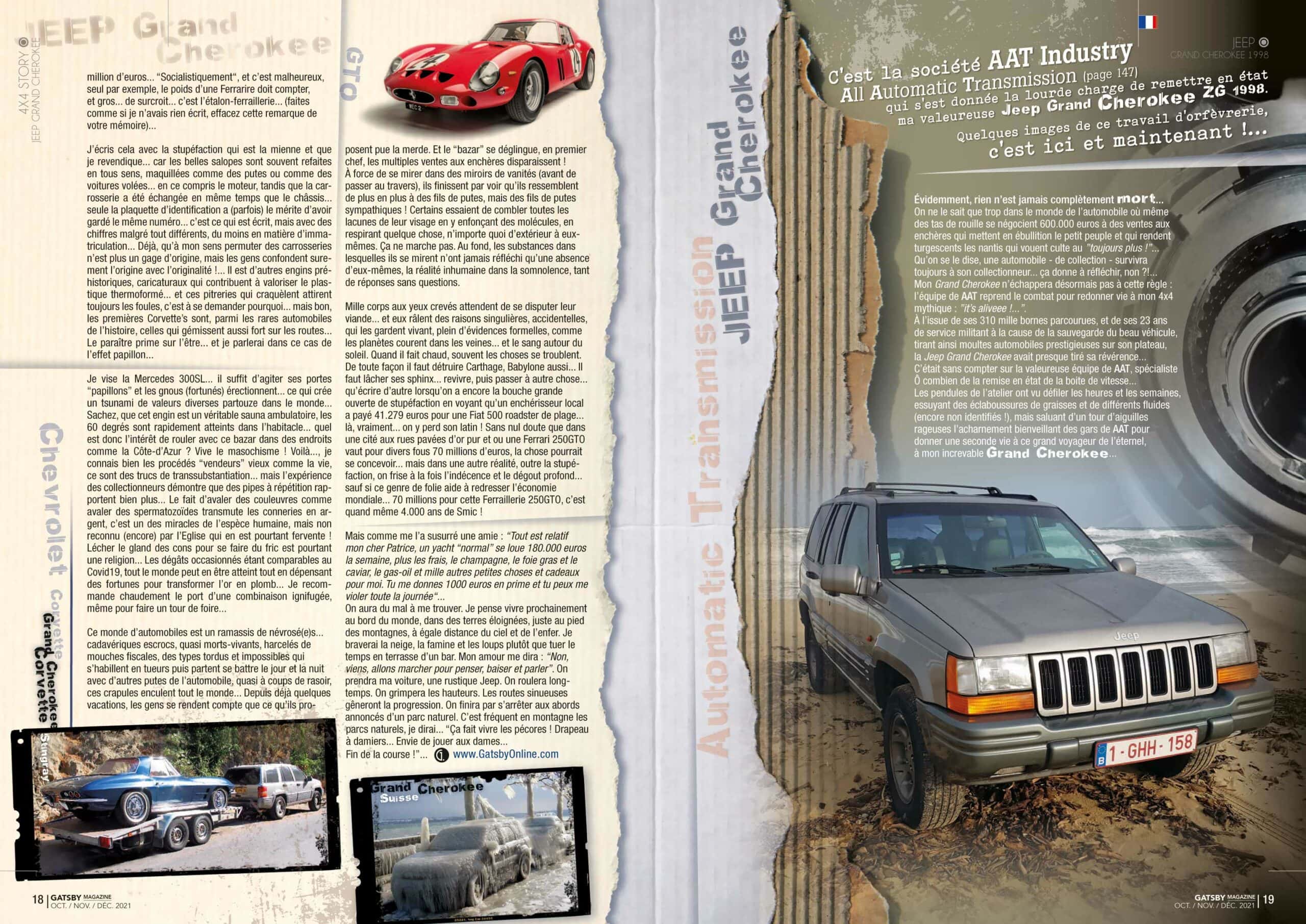 C’est en conduisant une Clénet S1 que j’avais acquise à une veuve éplorée (sic !) que j’en ai eu soudain Ras-le-Bol d’être cassé/contorsionné à son volant, tout comme pour pareil avec d’autres “zotos” semblables… En comparaison avec la conduite d’une Jeep Grand Cherokee V8 dans le confort et le silence, sans courants-d’air et autres stupidités, ma vie allait devenir moins stressante ! De surcroit cela allait résoudre les complications liées aux immatriculations et assurances des “bagnoles de collection” ! Le pied ! Le panard ! J’ai donc acheté en 1998 une Jeep Grand Cherokee “Limited” en version “Full-Options”, neuve, que j’ai fait équiper d’une attache remorque avec une prise électrique pour alimenter le treuil situé sur le timon de la remorque… L’extase ! Le bien-être intégral, tout confort et air-conditionné en prime ! Royal ! Pratique… Ma vie a ainsi basculé en 1998… Toutefois, en 2009, dégouté de ce monde suite au vol de ma LéaFrancis, je vais me “retraiter” plein sud et en arrêter avec les bagnoles de collection et autres tracasseries automobiles, sauf pour “en causer” d’expériences inédites dans mon Web-Site et mes magazines “papier”… La Jeep Grand cherokee avait alors parcouru 300.000 kms durant ces 11/12 ans… plus 50.000 kms durant les 10 années suivantes, qui elles n’étaient que pour du loisir ! Ce sont les Ets AAT qui ont proposé une remise à neuf de mon “Grand-Chéro”, ce qui va faire l’objet d’un article informatif de leurs capacités et compétences.