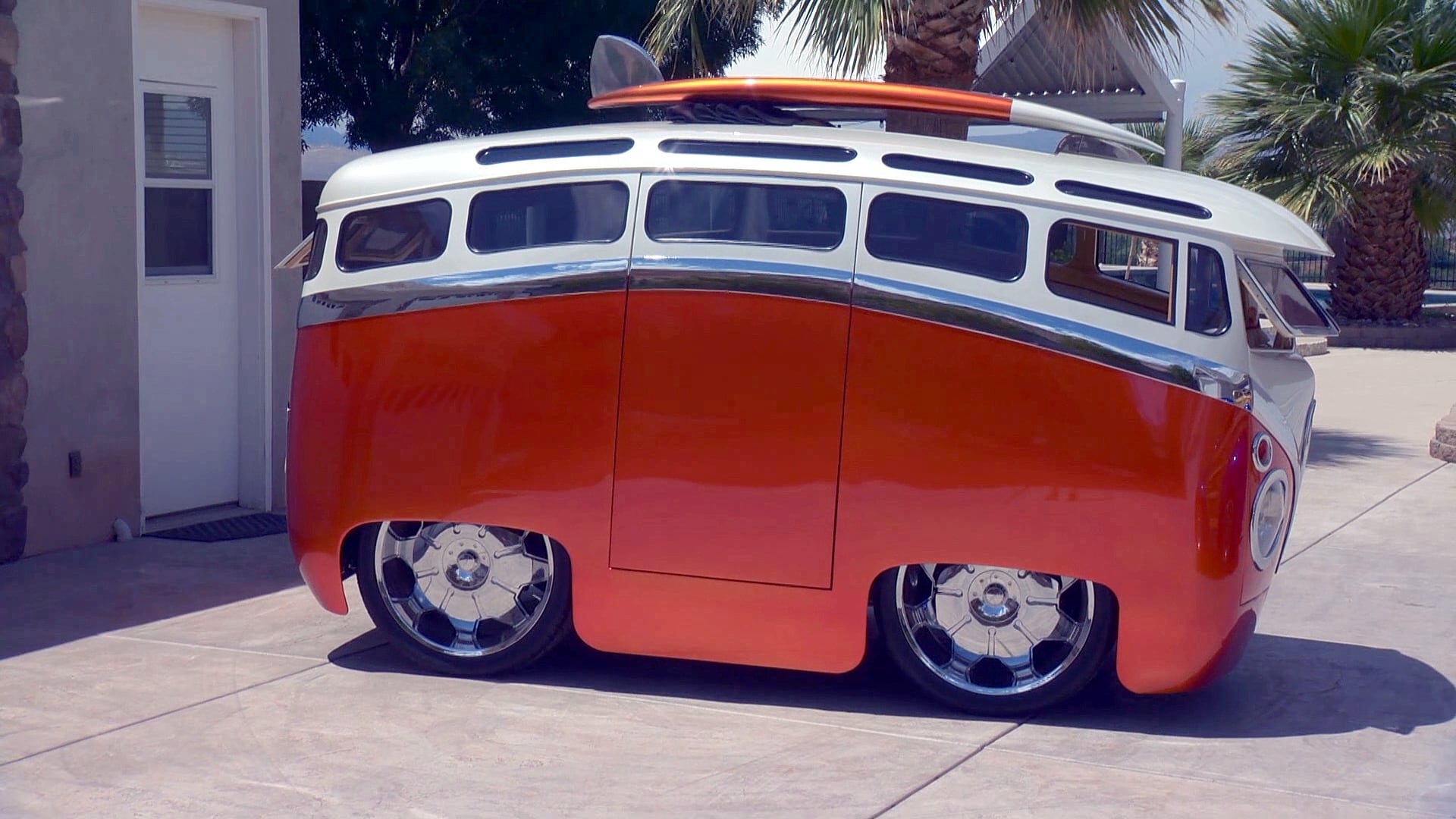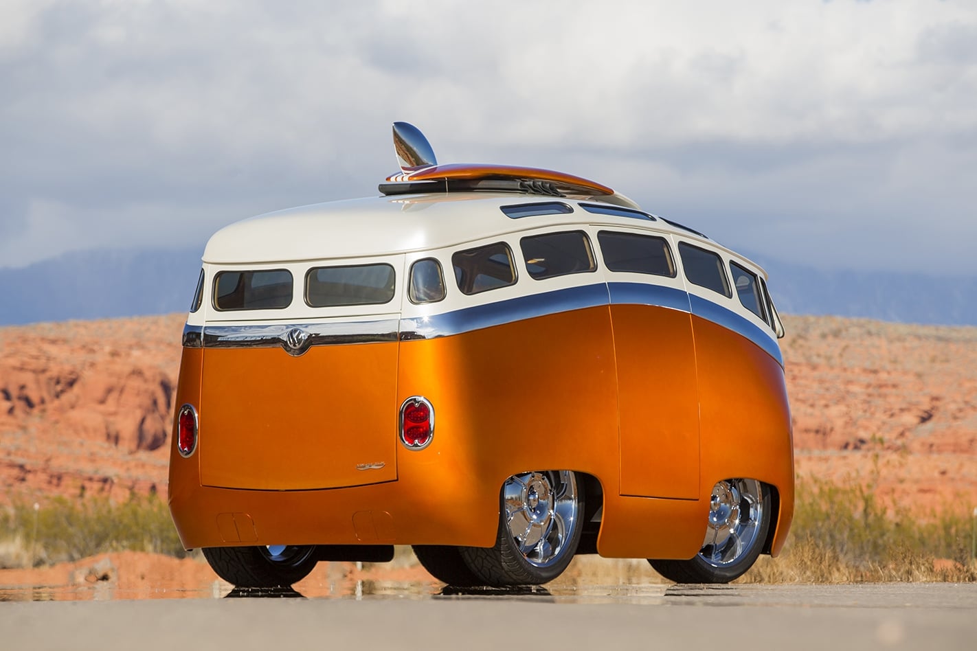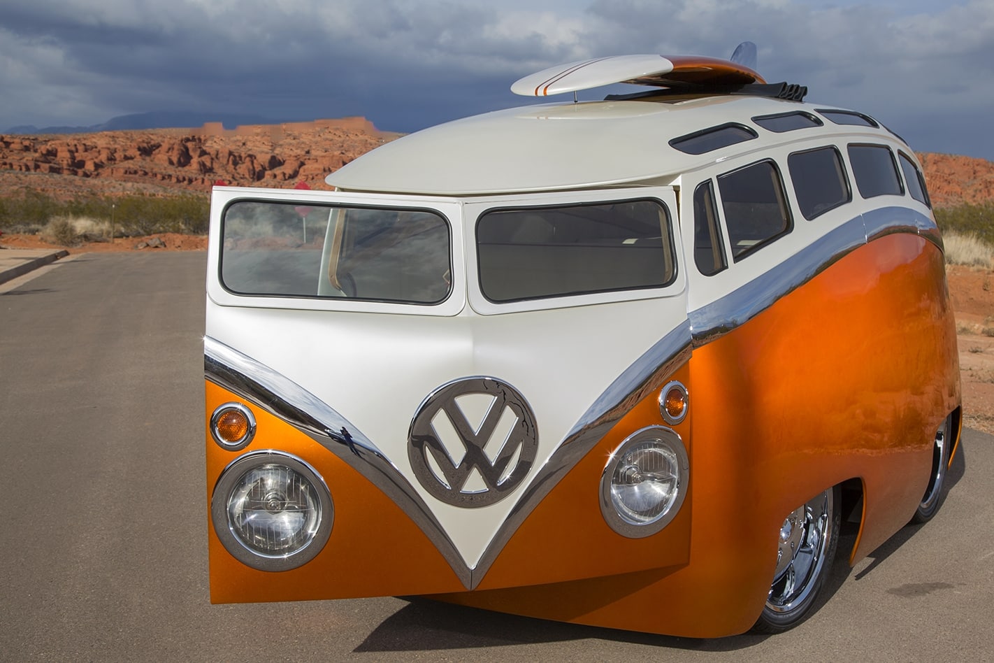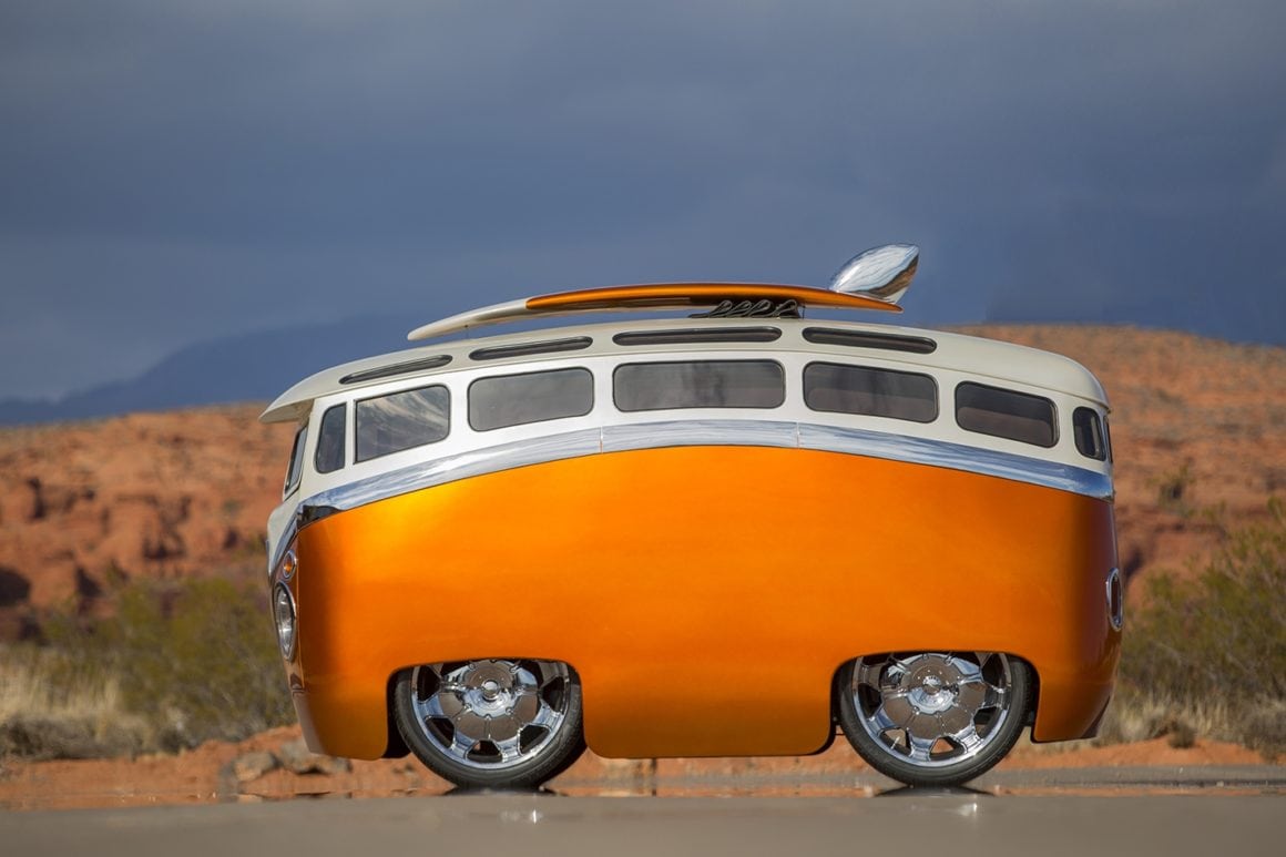 C’est à environ 600 km de la plage la plus proche, que crèche ce VW Samba en forme de saucisse de Frankfurt surnommé “Surf-Seeker”, de sorte que vous devez vous demander ce que fait cet engin réalisé à la gloire du Surf, dans un endroit du désert de l’Utah.