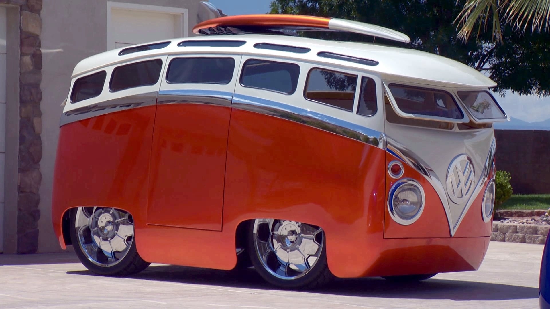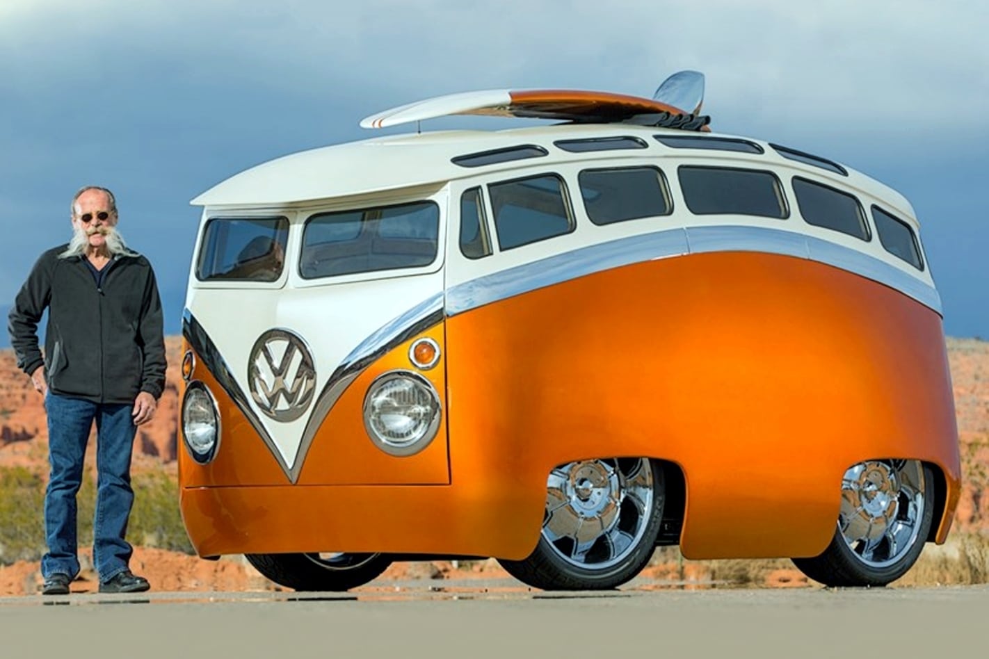 -“Je dessine d’abord le concept, puis je vais accrocher mes dessins sur un mur… et chaque fois que je passe devant, j’ajoute un ajustement et ça dure un mois, puis quand j’ai enfin le concept qui me convient : proportions et conception, je redessine tout en détail et à l’échelle 1/1. Ensuite, avec le plan finalisé, à la fois sur le papier et dans ma tête, je fais ce que tous les bons customiseurs font…, je commence à couper ce qui dépasse. Pour le “Surf Seeker”, c’était un Kombi’65, j’ai récupéré le châssis et l’ai découpé…, les suspensions avant et arrière ont été changées, pour l’avant j’ai conservé les tubes de torsion, mais j’ai modifié les freins à disque d’une Camaro pour les adapter. En raison de la petite taille et du faible poids du bus, j’étais inquiet qu’il allait tanguer dans de terribles roulis de carrosserie, mais j’ai eu de la chance, je n’ai eu aucun problème de tenue de route par la suite”.