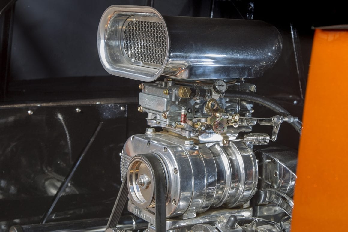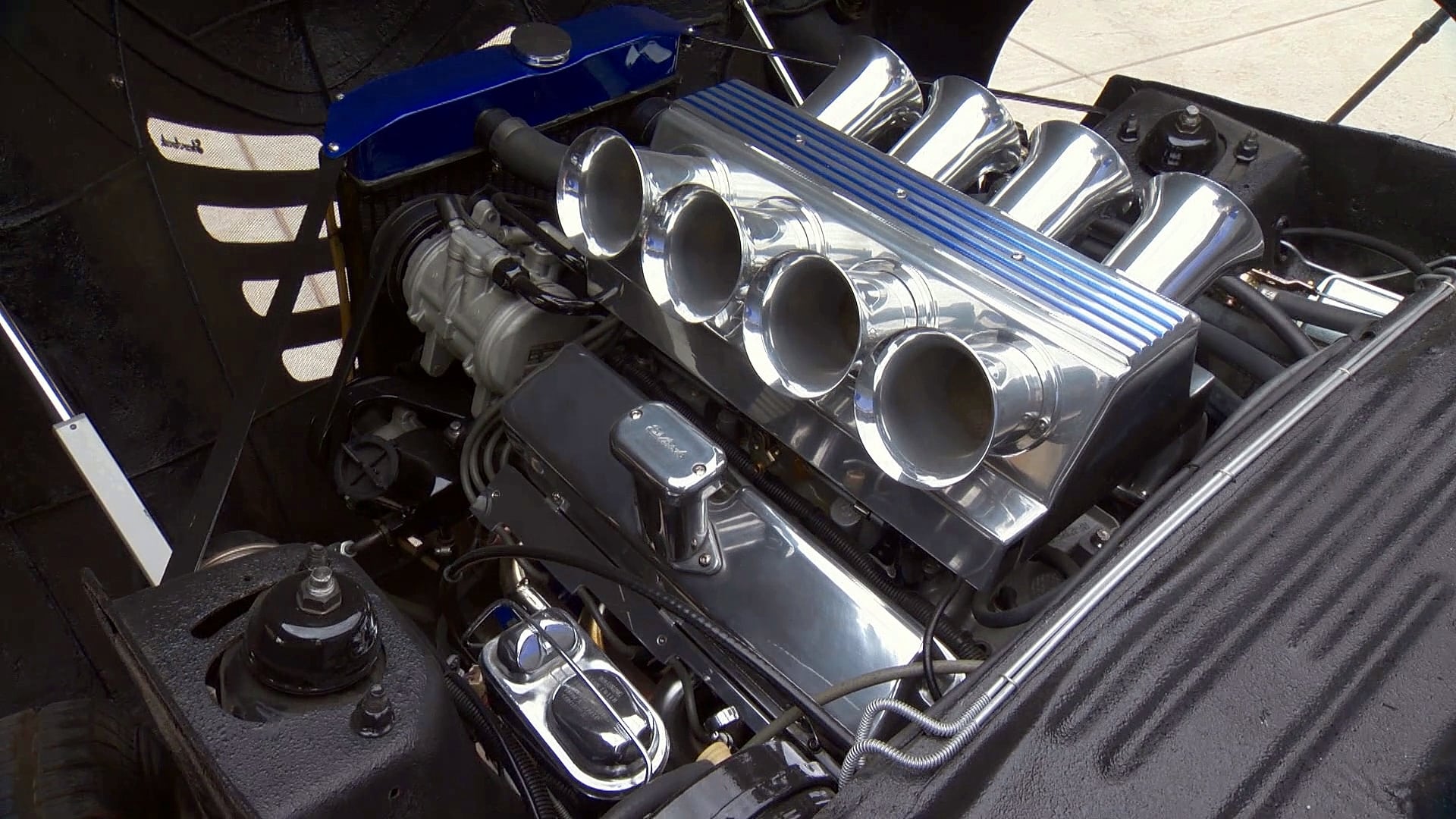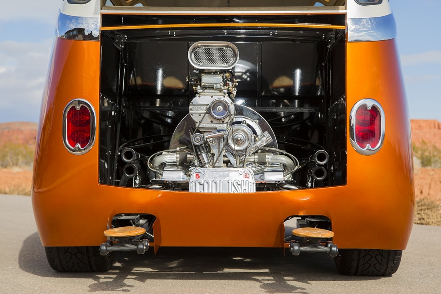 Une fois le tout terminé, étant un Hot Rodder dans l’âme, Ron s’est dit qu’il ne pouvait pas laisser le moteur d’origine asthmatique en place… car il avait besoin de vivre la route avec un peu de vertige…, il a eu l’idée d’utiliser un moteur Subaru…, mais Ron a finalement décidé de ne pas s’en tenir non plus au 4cyl VW d’origine, ni même complètement retravaillé…, il a tout redémonté pour adapter un bloc 2275cc délivrant 209 chevaux via un compresseur B&M équipé d’un carburateur 600 Holley peaufiné par Dick Landy.