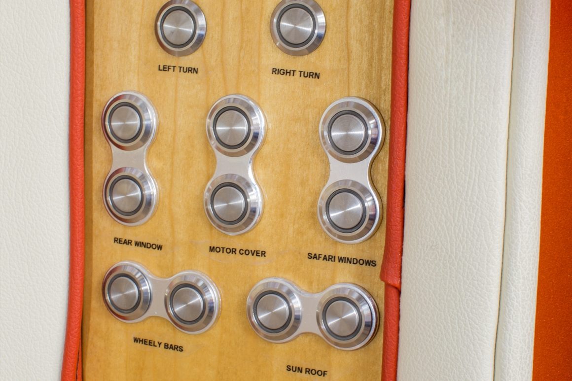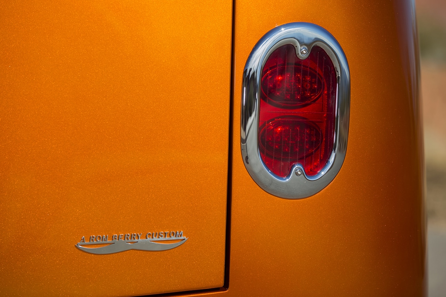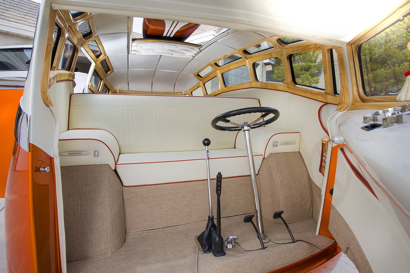 La carrosserie terminée, Ron a également fabriqué tous les panneaux intérieurs et les sièges dans un vinyle crème avec inserts orange…, le “Job” s’est terminé avec une peinture PPG Radiant Orange Glow et White Pearl appliquée par par SKJ Customs.