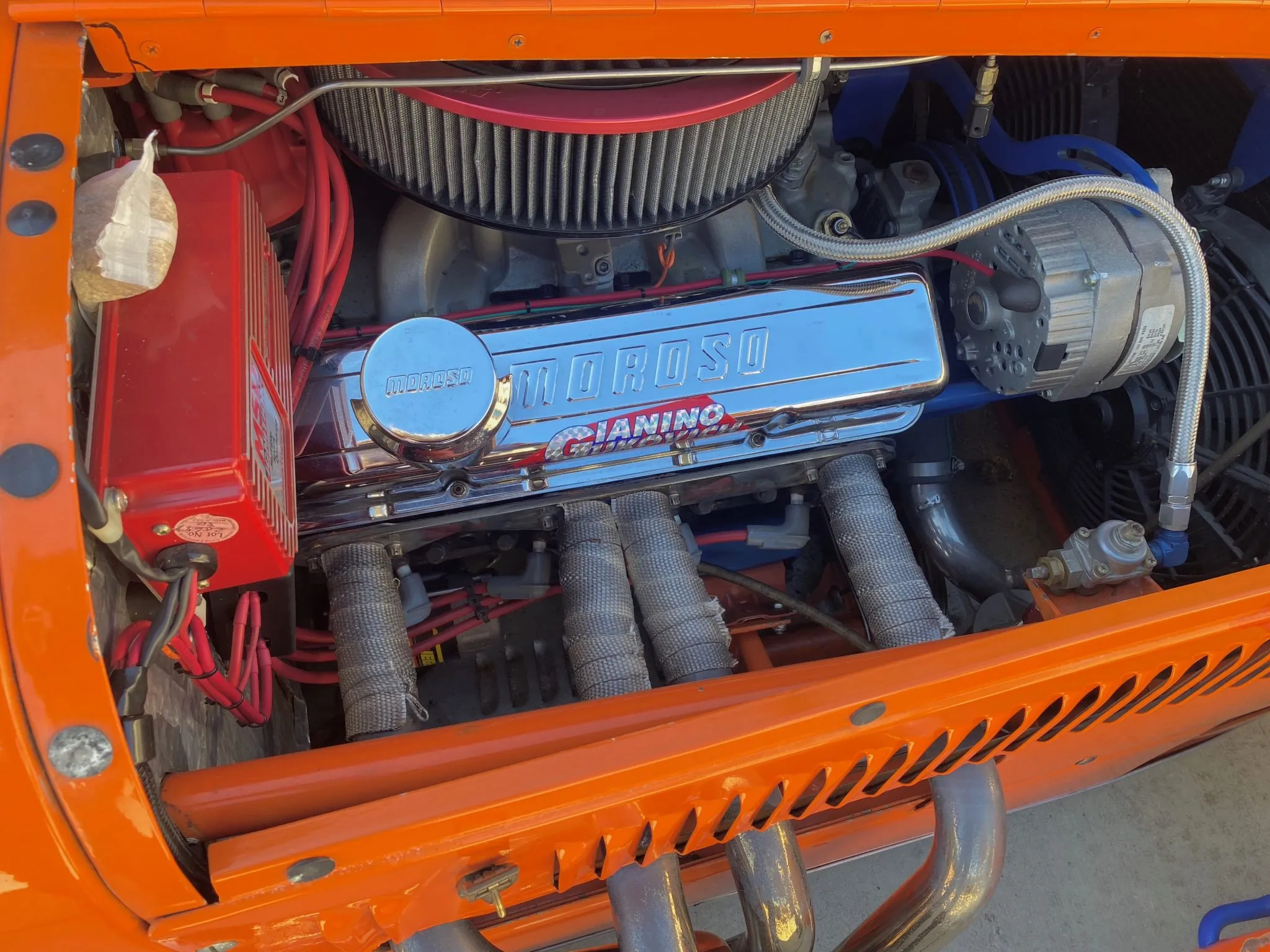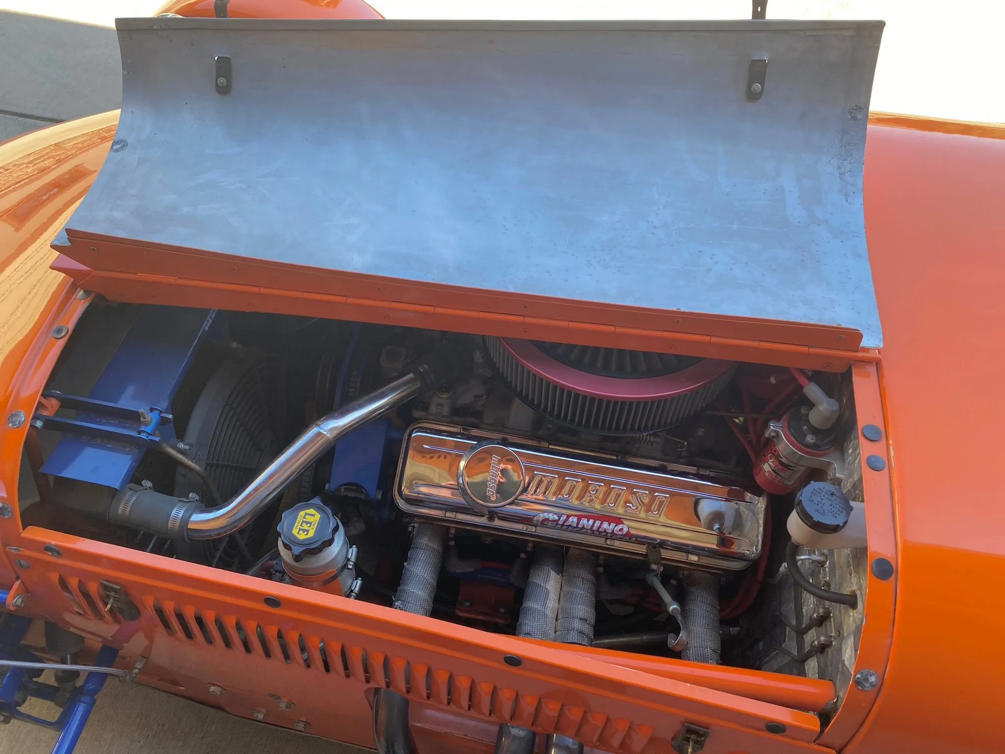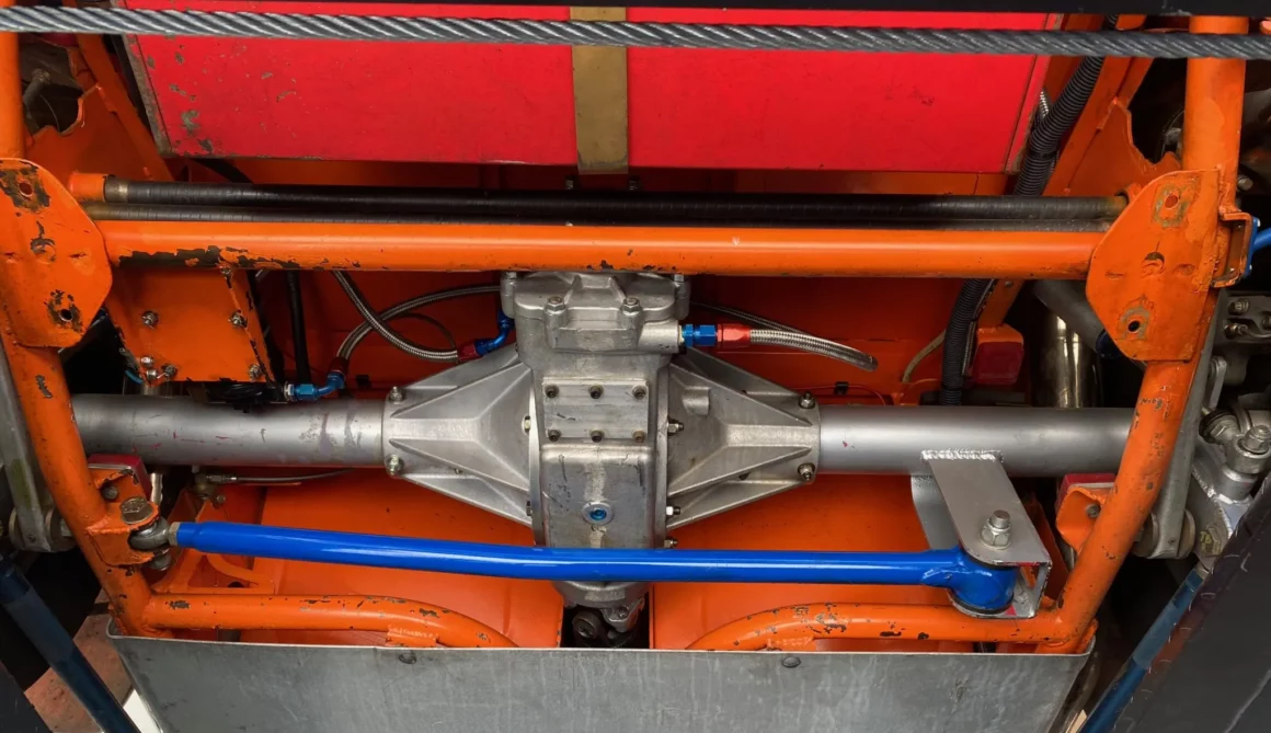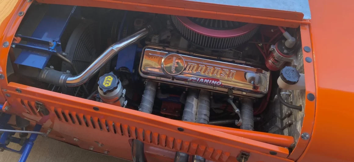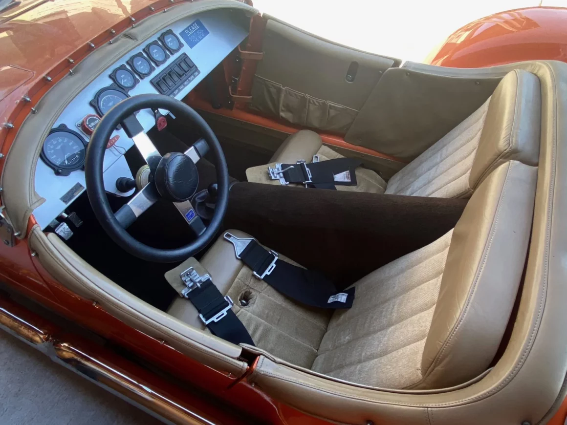 Une transmission manuelle Keisler RS500 à cinq vitesses, un arbre de transmission de remplacement, un différentiel SuperMax Speedway Engineering, une batterie qui tient sa charge et un arceau de sécurité chromé récupéré d’une autre réplique accidentée dans le même course. La carrosserie en fibre de verre a été “arrangée” et repeinte en orange sur une sellerie beige, le moteur en récupération vient d’une Corvette C3 volée au Brésil, un vieux V8 Chevy 350ci. L’équipement supplémentaire comprend un carburateur Rochester Quadrajet, un allumage électronique MSD, et un radiateur en aluminium.