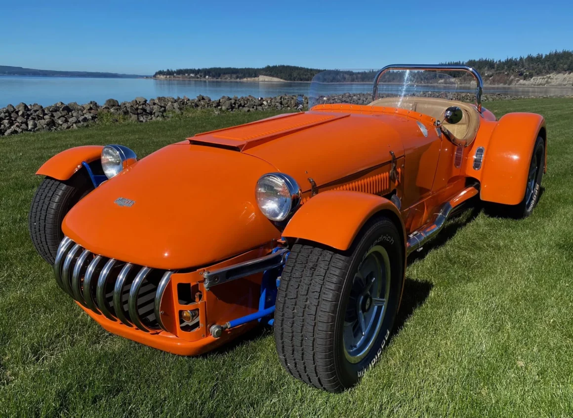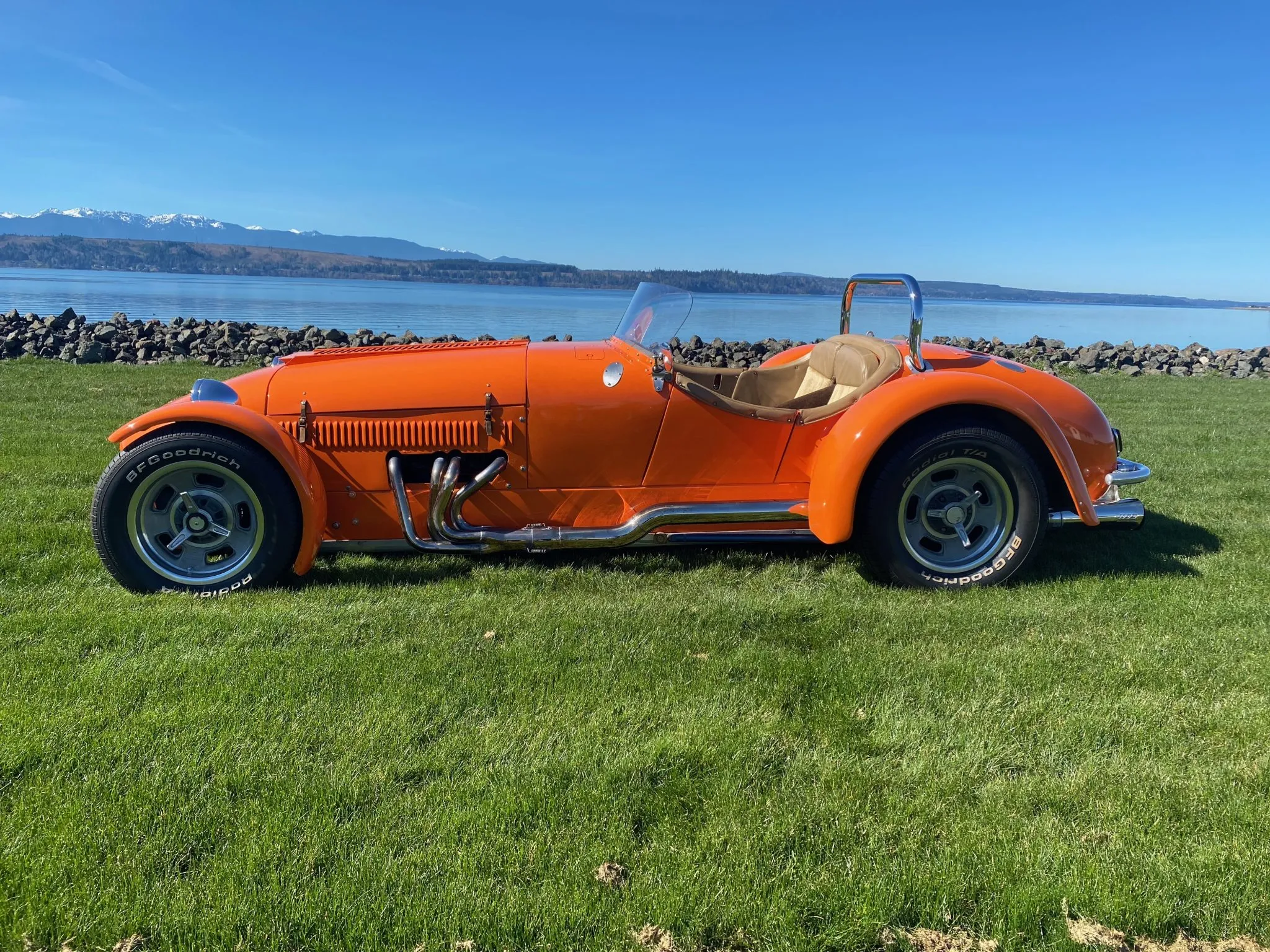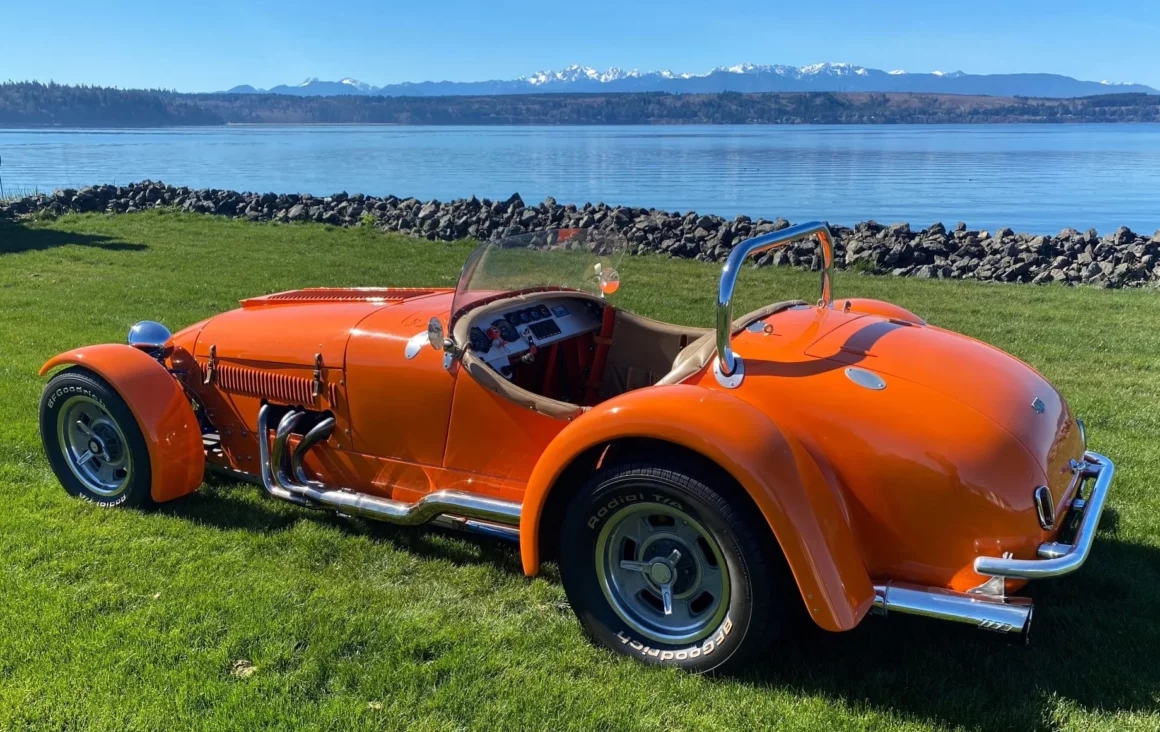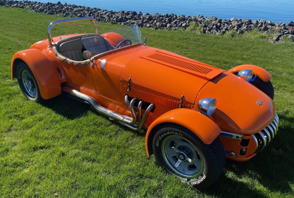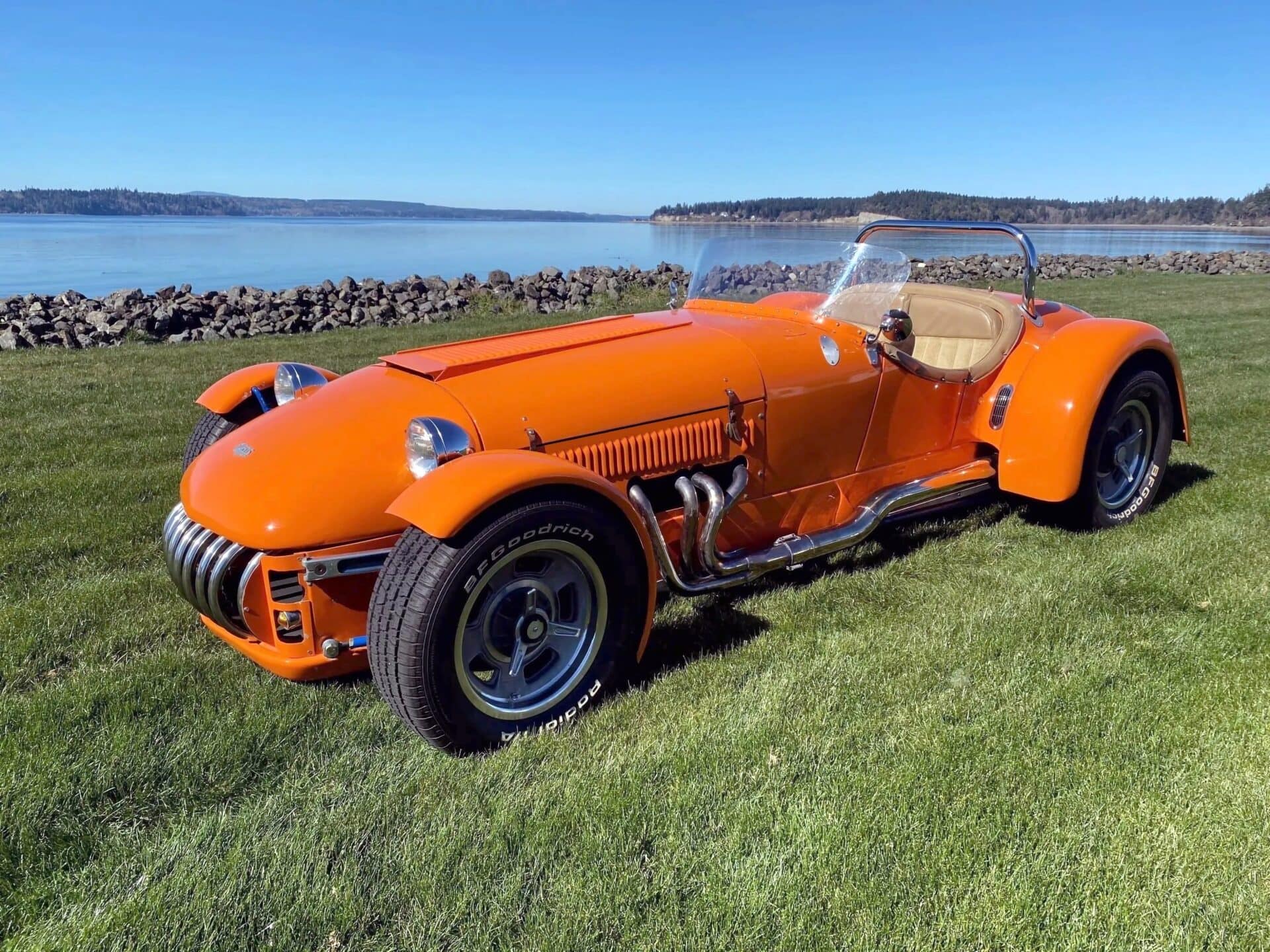 Une transmission manuelle Keisler RS500 à cinq vitesses, un arbre de transmission de remplacement, un différentiel SuperMax Speedway Engineering, une batterie qui tient sa charge et un arceau de sécurité chromé récupéré d’une autre réplique accidentée dans le même course. La carrosserie en fibre de verre a été “arrangée” et repeinte en orange sur une sellerie beige, le moteur en récupération vient d’une Corvette C3 volée au Brésil, un vieux V8 Chevy 350ci. L’équipement supplémentaire comprend un carburateur Rochester Quadrajet, un allumage électronique MSD, et un radiateur en aluminium.