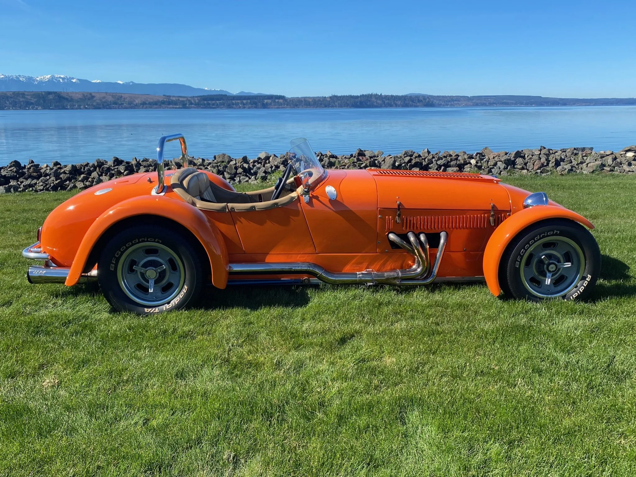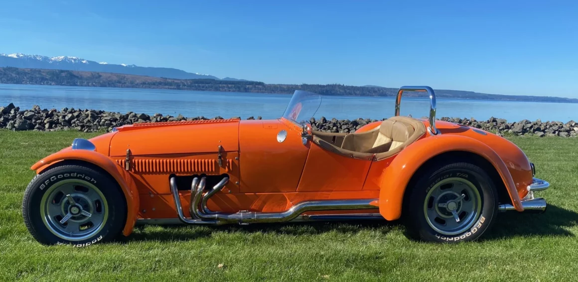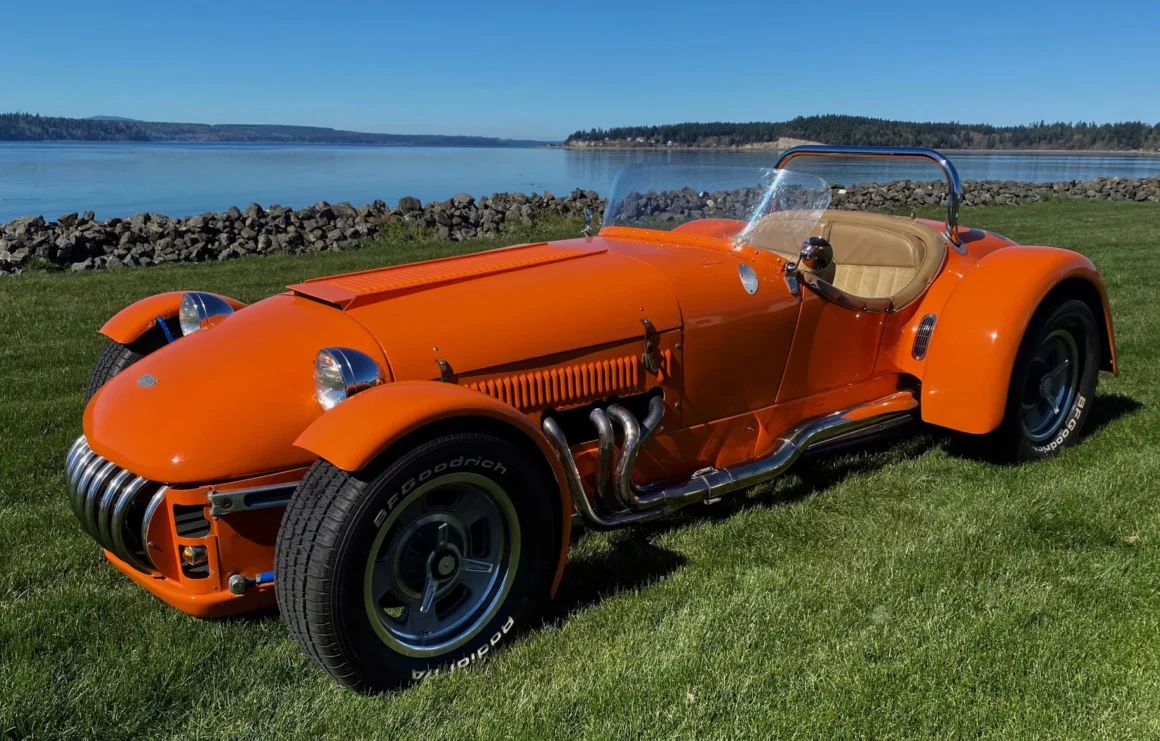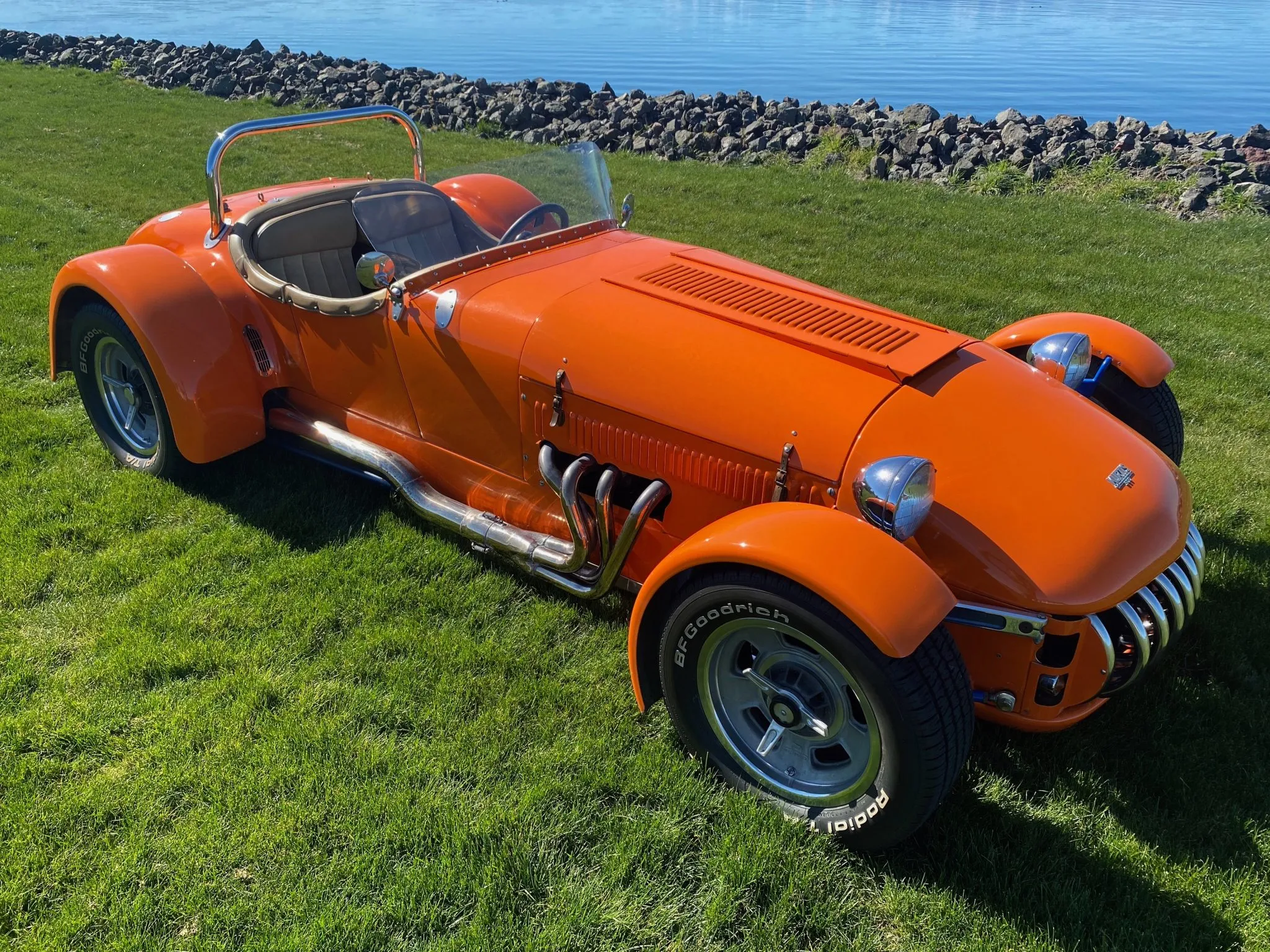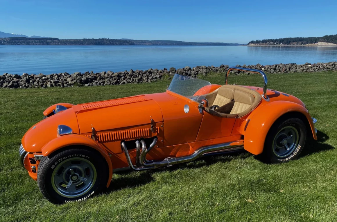 Une transmission manuelle Keisler RS500 à cinq vitesses, un arbre de transmission de remplacement, un différentiel SuperMax Speedway Engineering, une batterie qui tient sa charge et un arceau de sécurité chromé récupéré d’une autre réplique accidentée dans le même course. La carrosserie en fibre de verre a été “arrangée” et repeinte en orange sur une sellerie beige, le moteur en récupération vient d’une Corvette C3 volée au Brésil, un vieux V8 Chevy 350ci. L’équipement supplémentaire comprend un carburateur Rochester Quadrajet, un allumage électronique MSD, et un radiateur en aluminium.