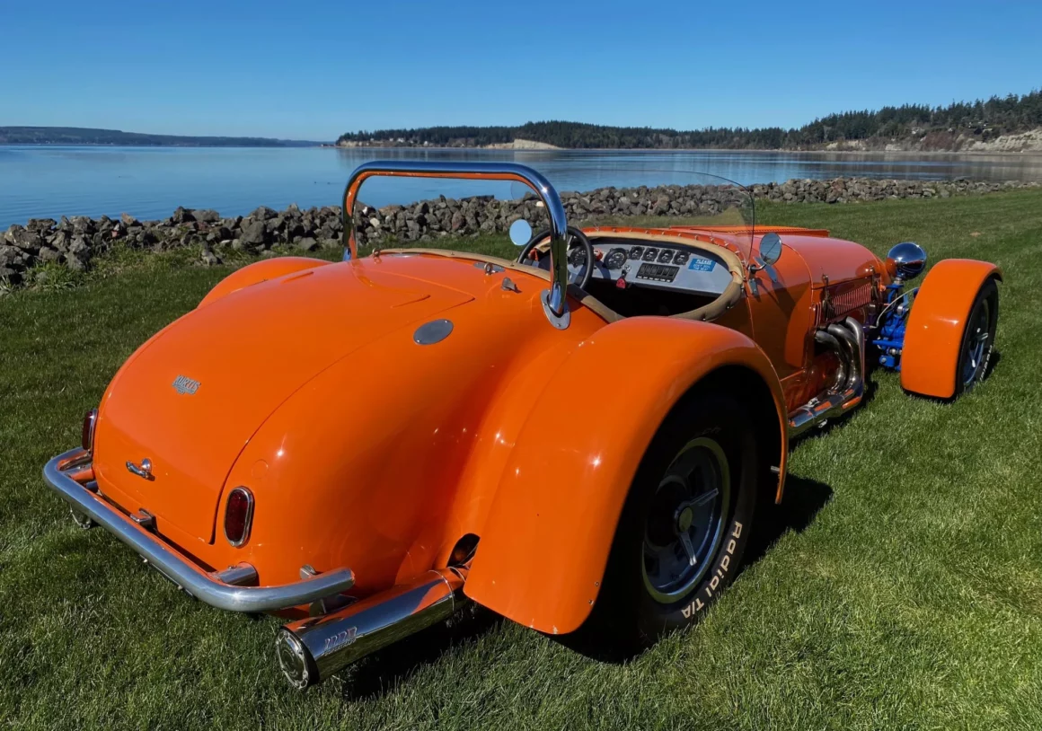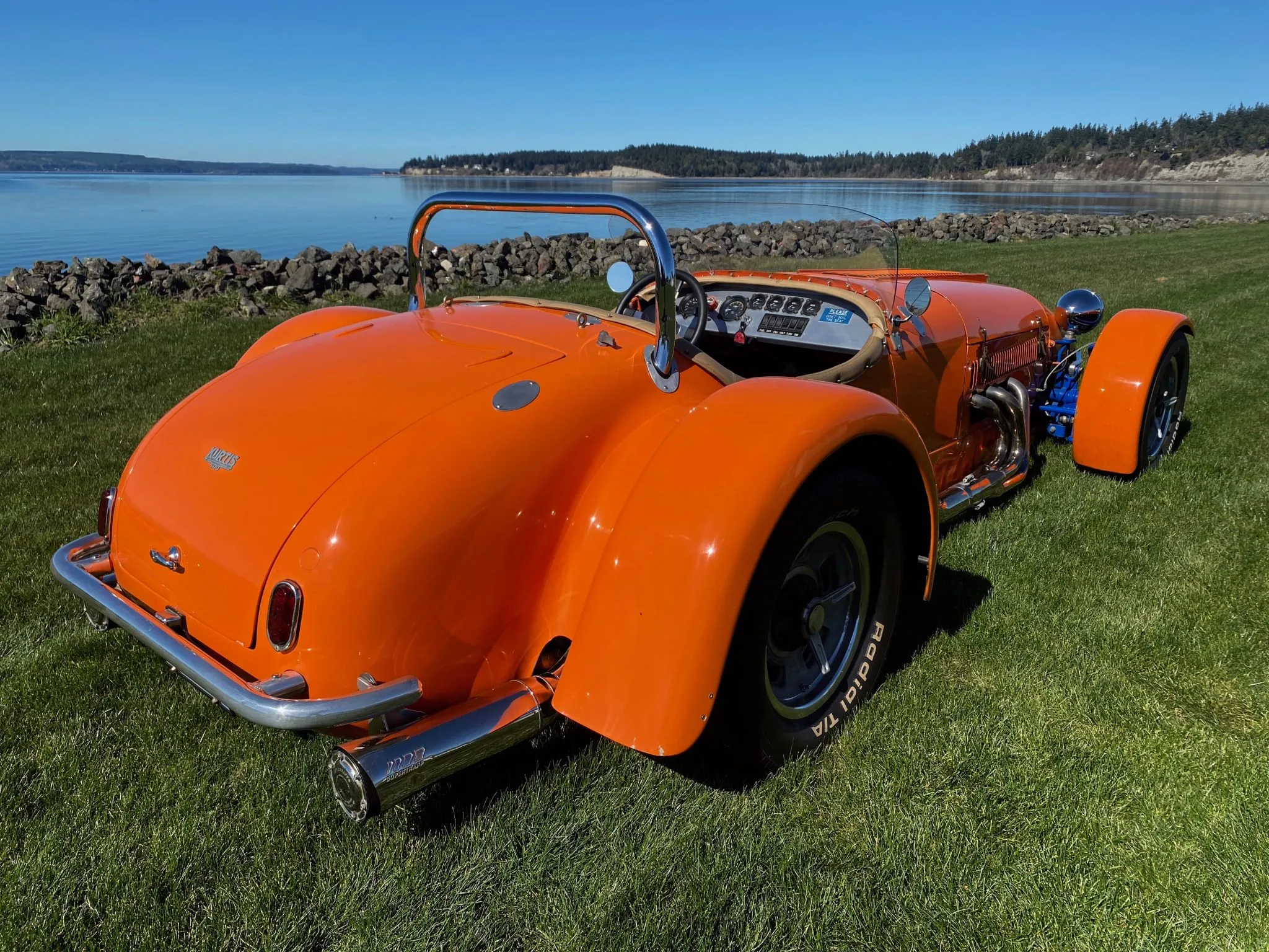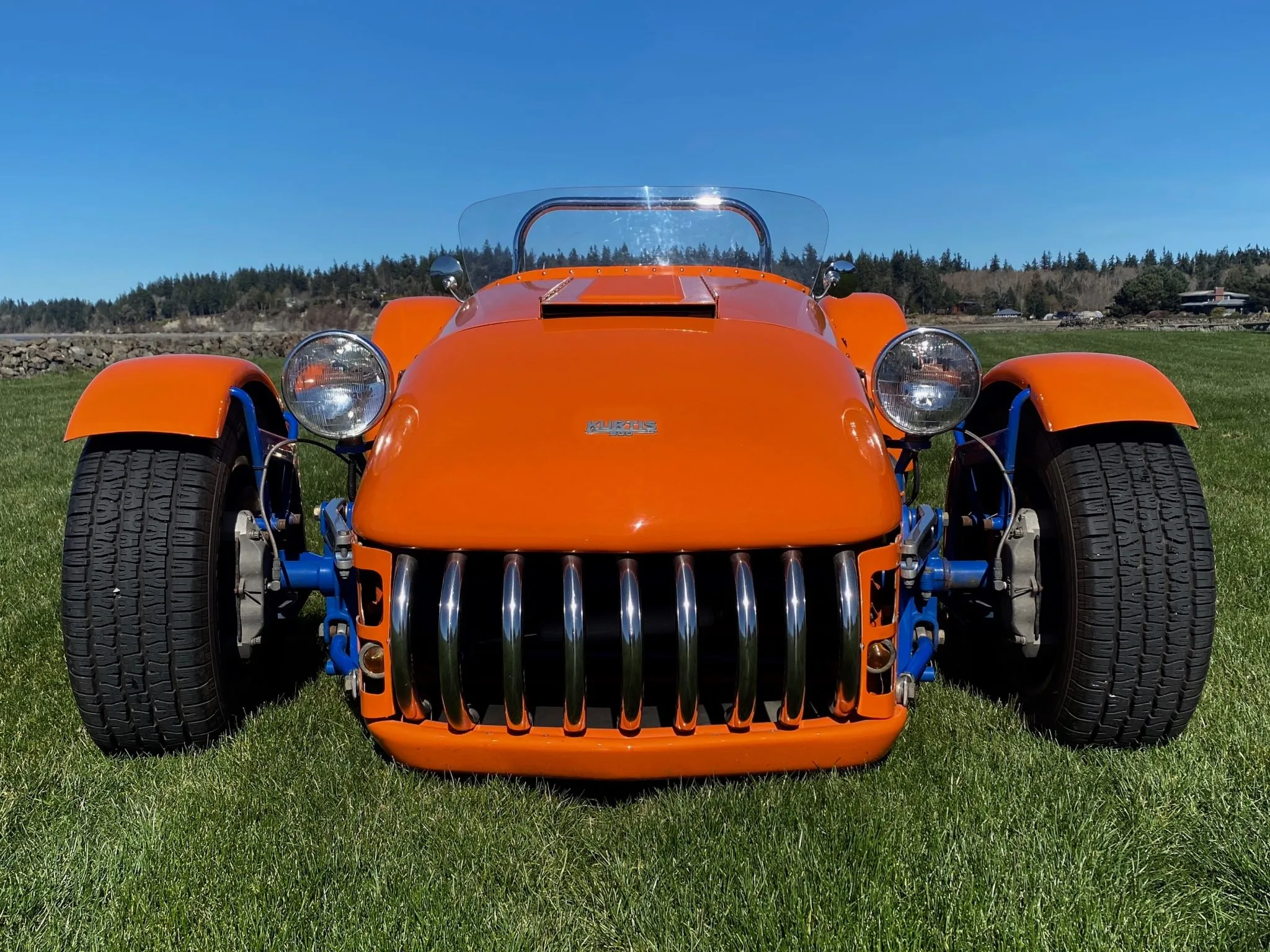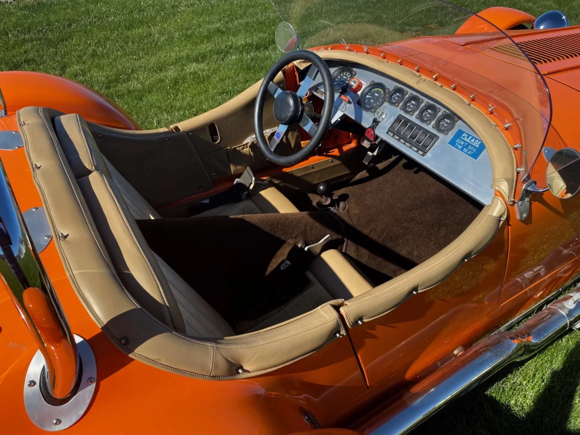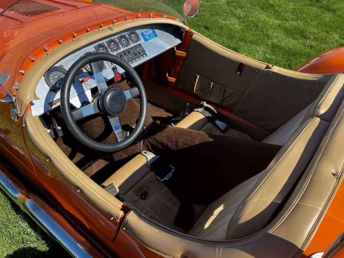 Cet exemplaire est doté d’une carrosserie en fibre de verre ainsi que d’un capot à persiennes en aluminium et d’ailes avant finies en orange. L’équipement comprend des phares Dietz avec baquets chromés, des clignotants, des sangles d’arrimage en cuir pour le capot, des échappements latéraux doubles avec embouts SuperTrapp, un pare-brise en plexiglas, deux feux arrière, un interrupteur de coupure électrique et un pare-chocs arrière tubulaire. Un arceau de sécurité chromé a été installé sous le propriétaire actuel.