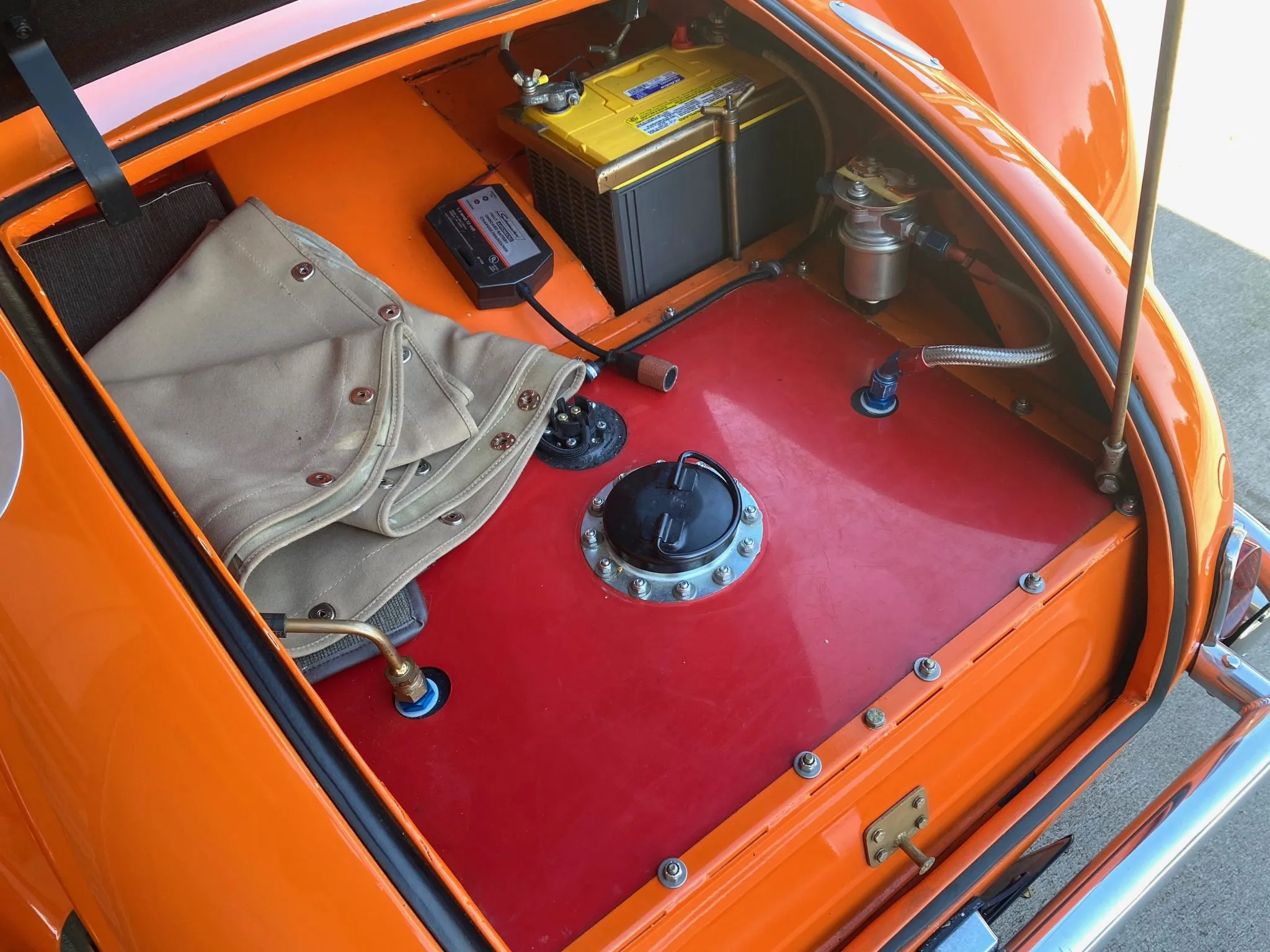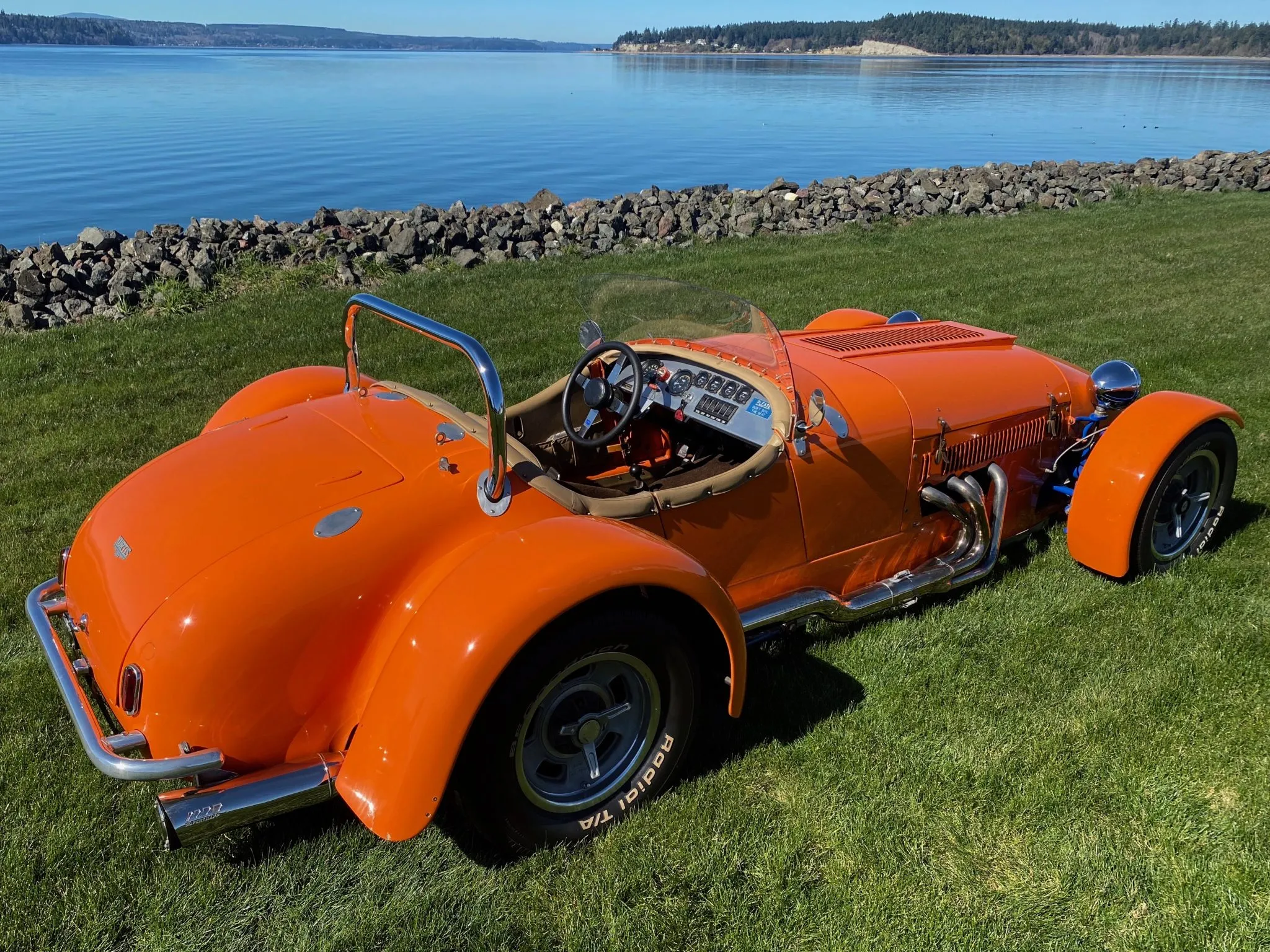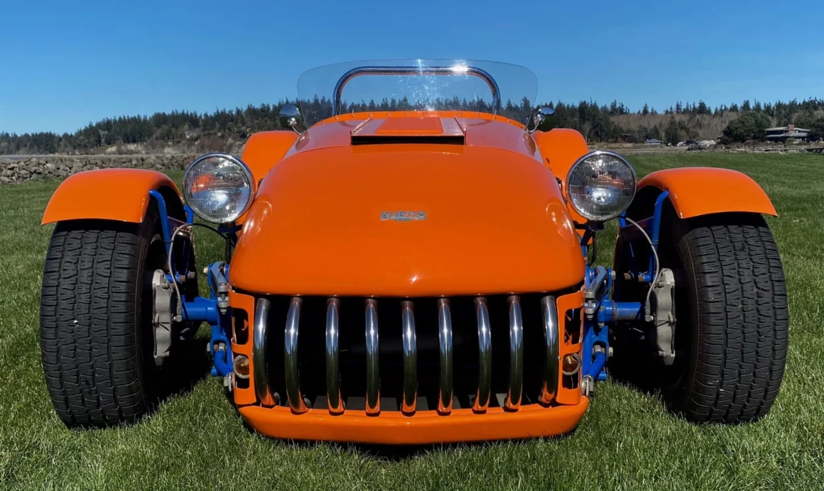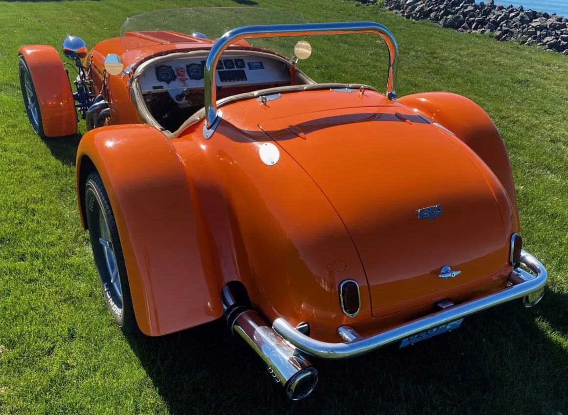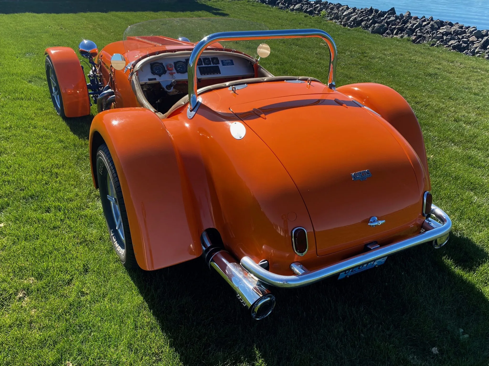 Cet exemplaire est doté d’une carrosserie en fibre de verre ainsi que d’un capot à persiennes en aluminium et d’ailes avant finies en orange. L’équipement comprend des phares Dietz avec baquets chromés, des clignotants, des sangles d’arrimage en cuir pour le capot, des échappements latéraux doubles avec embouts SuperTrapp, un pare-brise en plexiglas, deux feux arrière, un interrupteur de coupure électrique et un pare-chocs arrière tubulaire. Un arceau de sécurité chromé a été installé sous le propriétaire actuel.