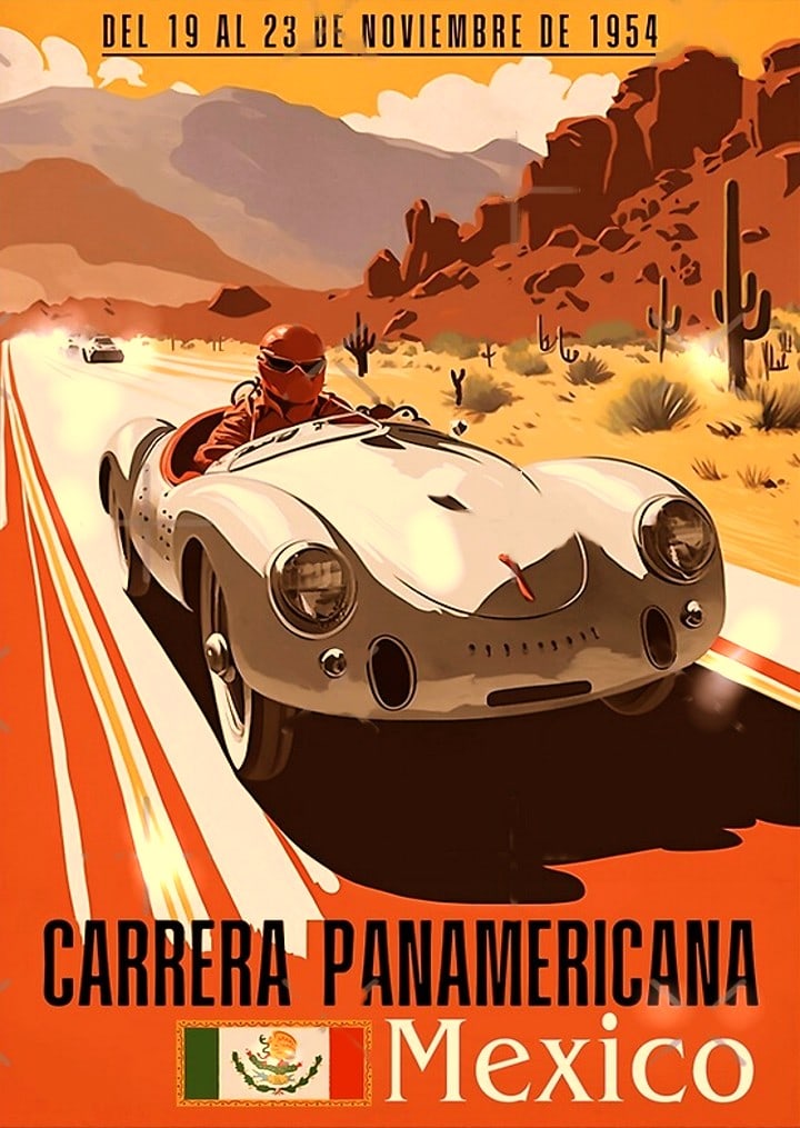 Cette réplique/voiture hommage, sans lien avec l’originale, a participé à la “nouvelle” course de La Carrera Panamericana en 1995, qui était un “hommage” de presque 30 ans (nous sommes en 2024) à la vraie course qui remonte donc à deux générations précédentes !… Là aussi il s’agit d’un business de foireux…. La réplique a été vendue pour une croute de pain a un garagiste local Péruvien qui l’a “retapée” façon “remise à neuf locale” et elle a été achetée par un américain ahuri et baba-cool en 2011. Les travaux subséquents comprenaient l’installation d’une foule de pièce de récupération “modernes”…