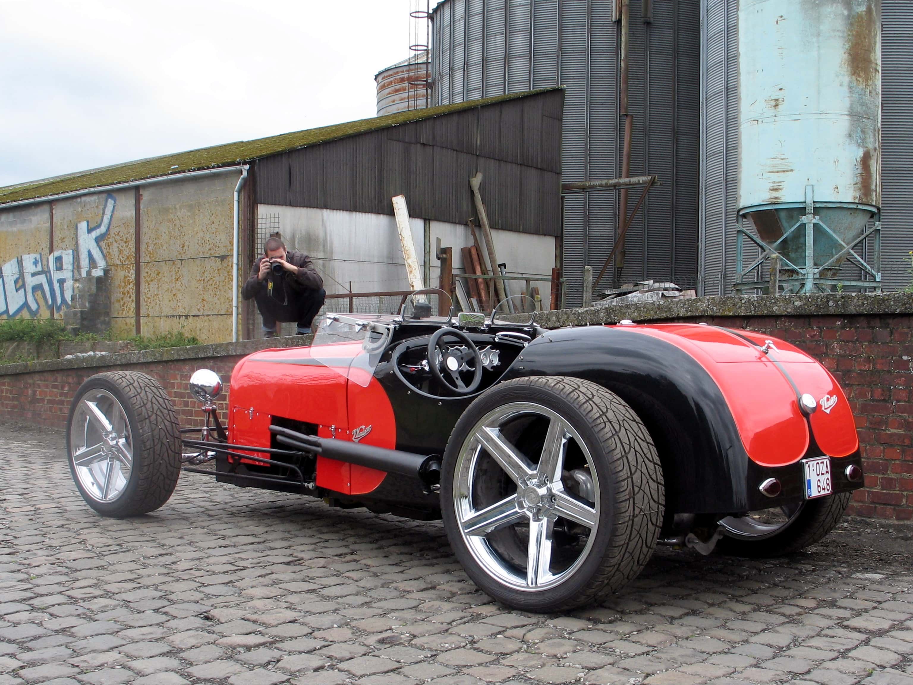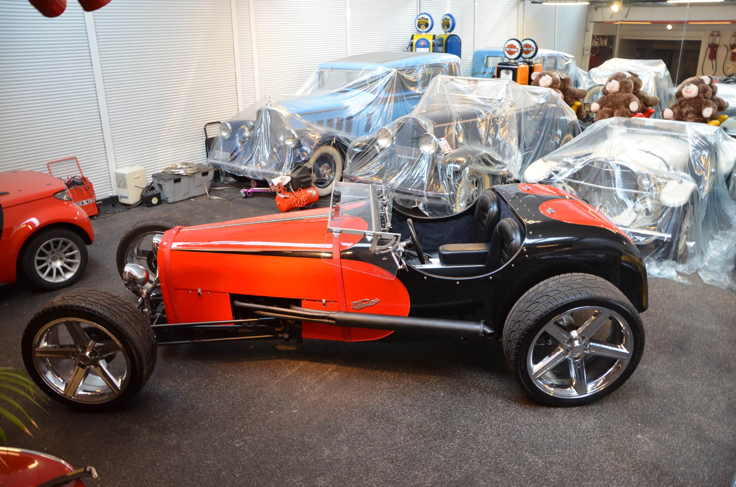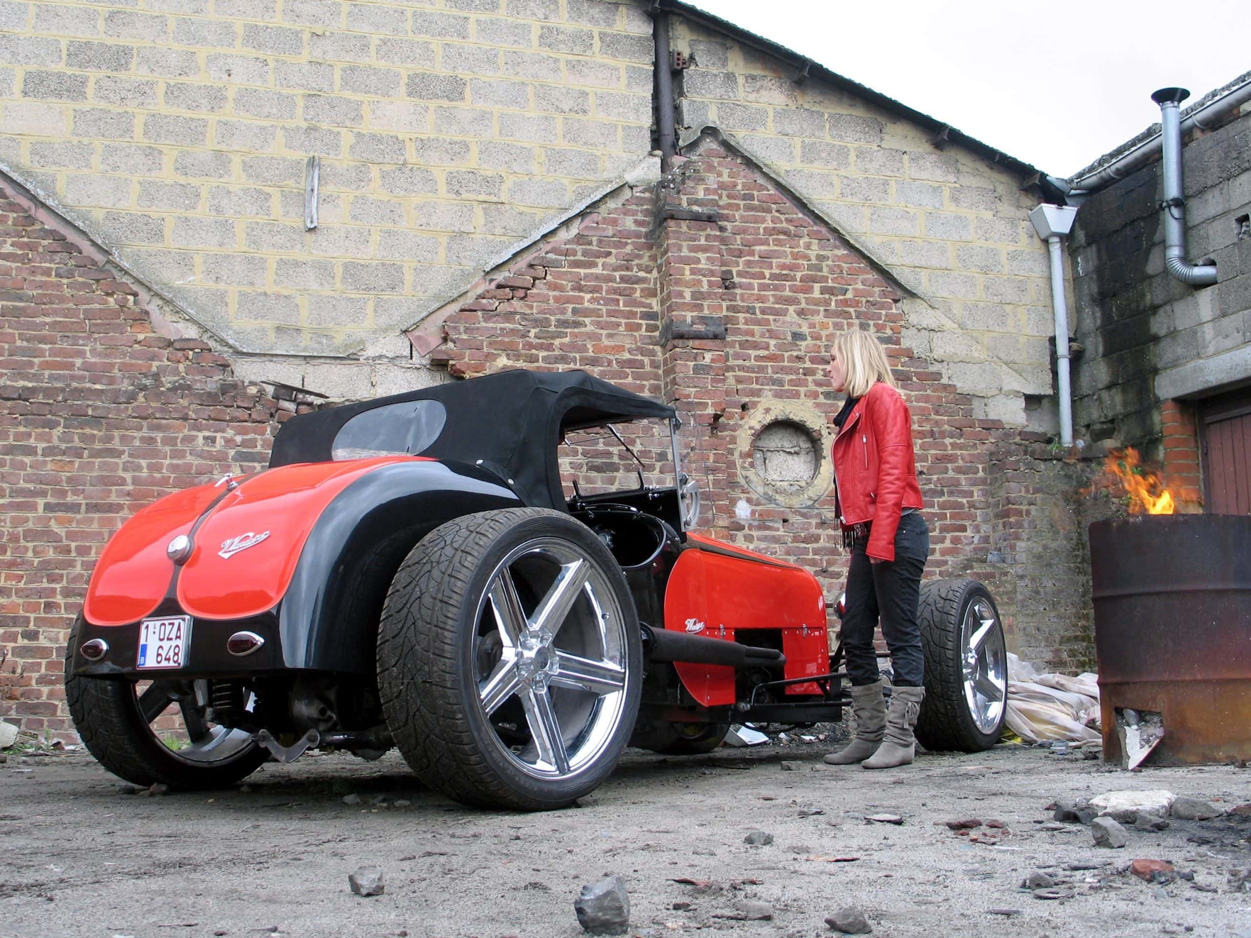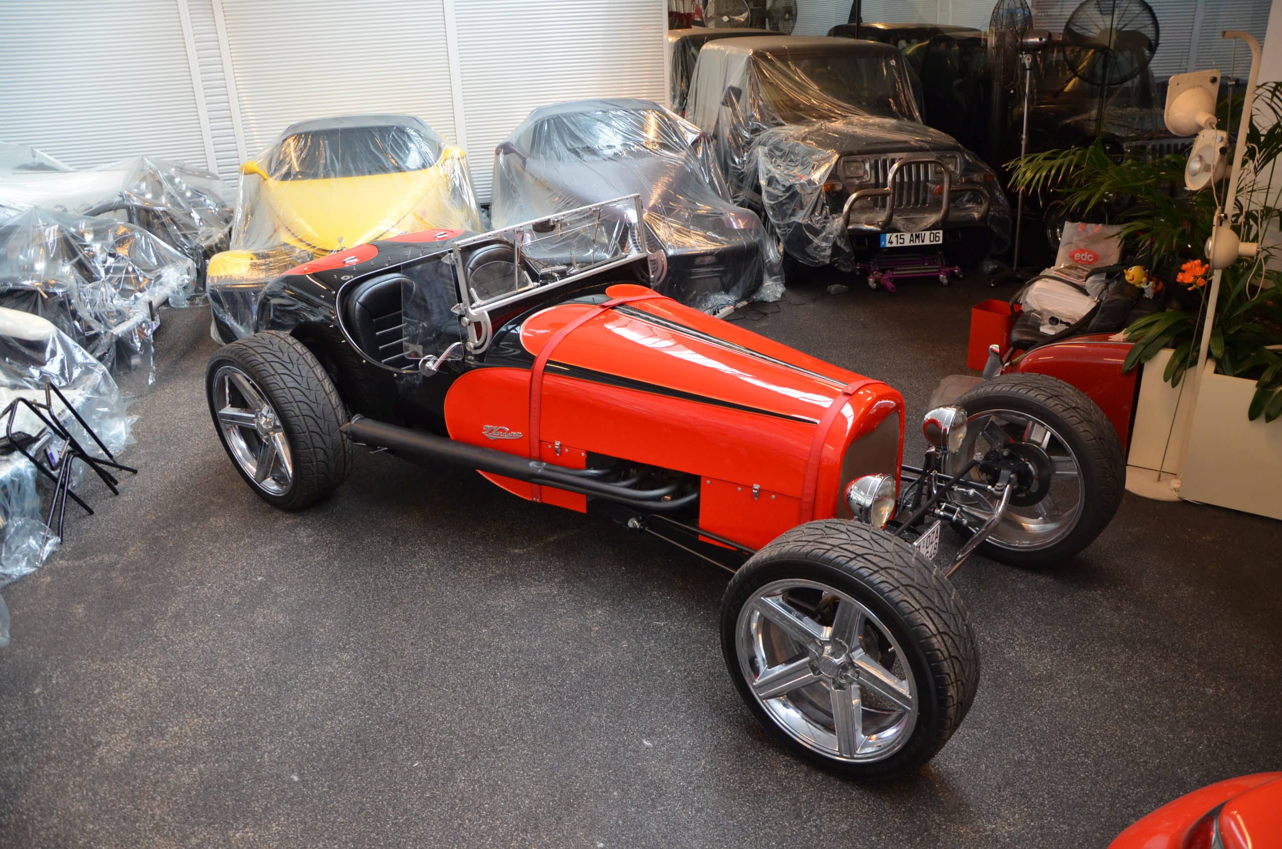 Charlie, suite à notre conversation téléphonique de ce jeudi 6 octobre 2011 11h30, je vous transmets quelques photos d’un de mes Hot-Rods, en finitions. La base est un châssis Jaego de 1980 type “T”, moteur Buick V8 3L5, carrosserie Roadster avec pare-brise rabattable + capote. Jantes 22 et 24 pouces, train AV rigide type “T”, train AR Jaguar XJ6, freins à disques-servo 4 roues. Accessoires et accastillage, compteurs, rétros et divers : Harley.