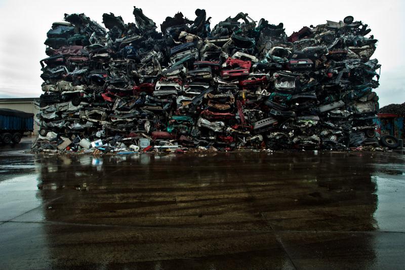 A l’extrémité Est de la ville, tout au bout d’une voie ferrée semblant mener nulle part, se dresse une monumentale montagne de voitures imbriquées les unes dans les autres, digne des compressions qui ont fait son succès.
