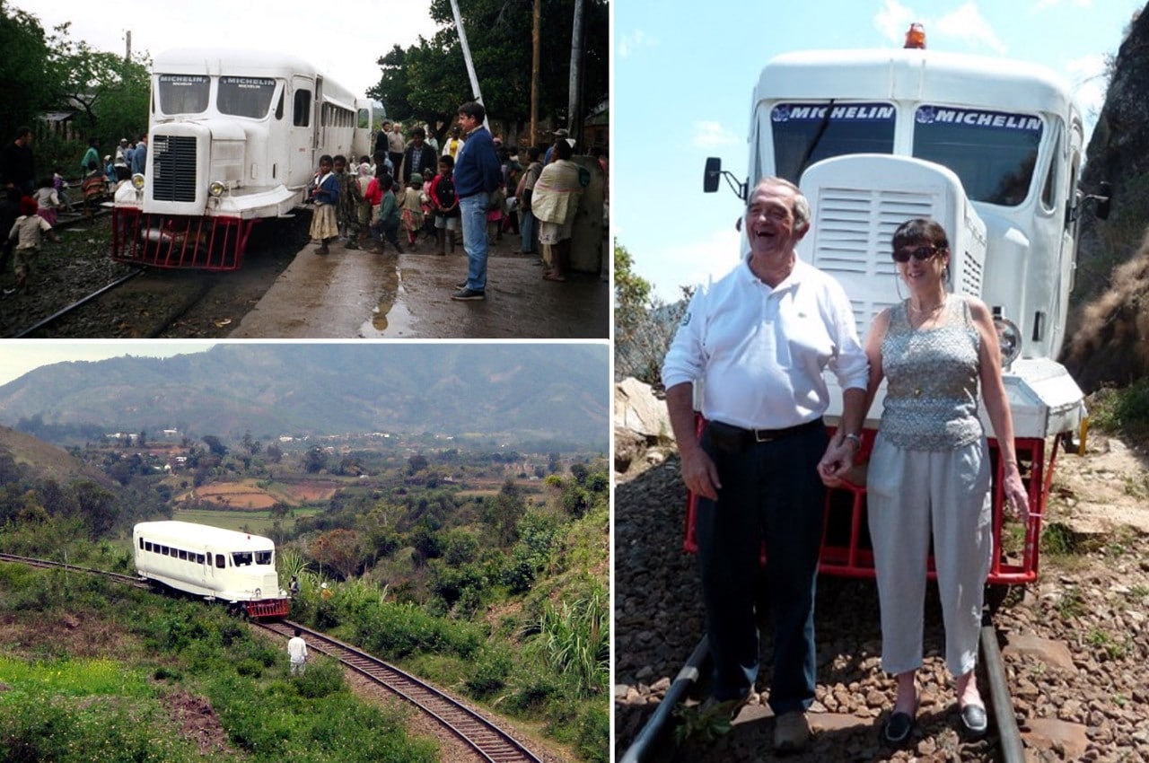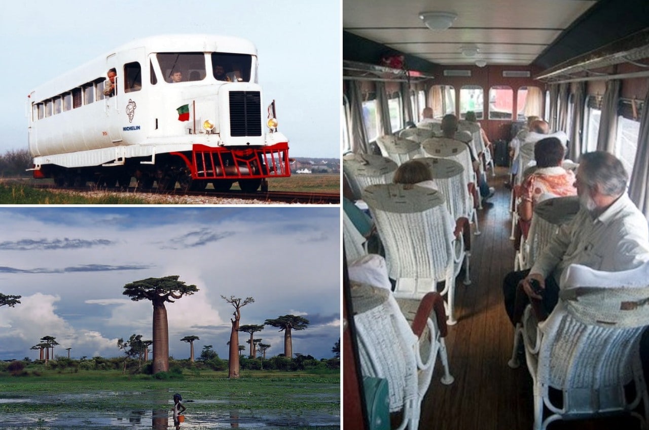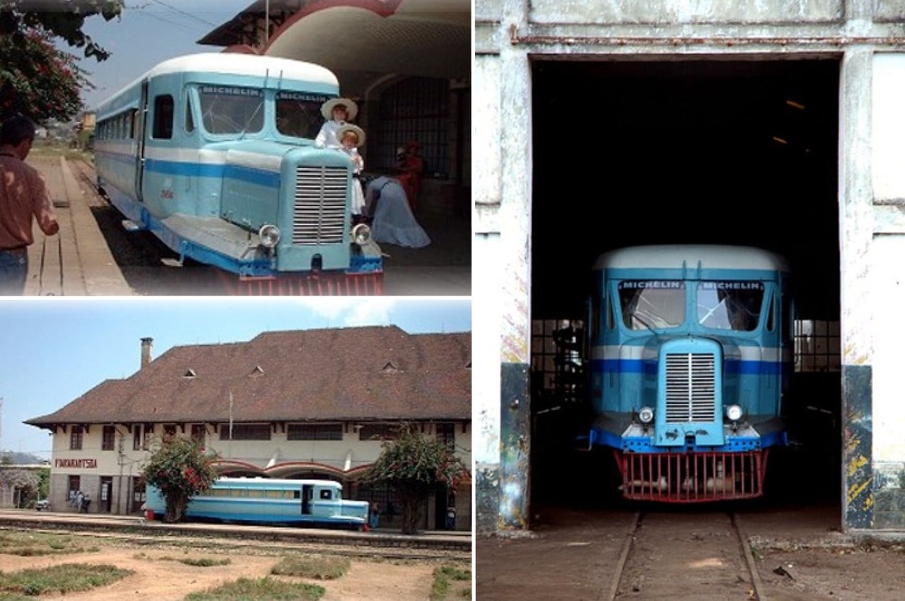 – “Bugatti, si, si, très bon moteur pour autorail…, très rapide. Mes Micheline’s de Madagascar mettent trois heures et demi pour franchir les 148 kilomètres qui séparent la capitale de la petite ville d’Andasibe aux portes de l’une des grandes forêts primaires du pays. A bord, pour assurer la bonne conduite il faut un conducteur, deux mécaniciens car les pneus pourraient crever, un électricien et deux hôtesses très ouvertes au sexe qui assurent le service avec panier repas et boissons. Sur demande des musiciens peuvent accompagner les visiteurs. C’est un vrai travail d’équipe. La voie gravit des dénivelés surprenants pour ensuite longer des rizières en terrasse, passer dans les villages des hauts plateaux, traverser la forêt primaire orientale. Et si vous comptez, vous dénombrerez 17 gares, 6 ponts, 17 tunnels… Départ régulier de Tana une fois par semaine, le samedi de la gare de Soarano à destination d’Antisarebe ou Andasibe”….