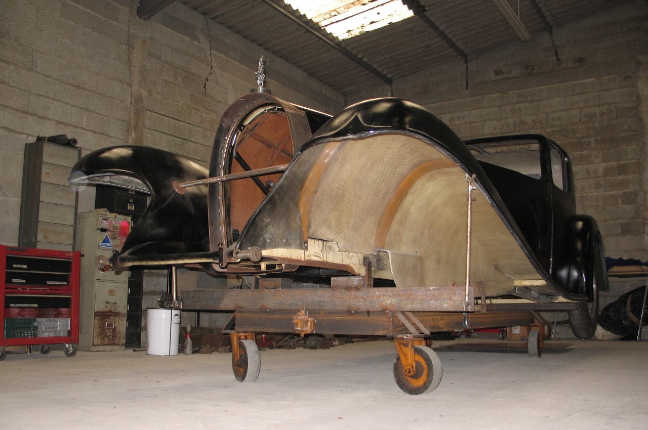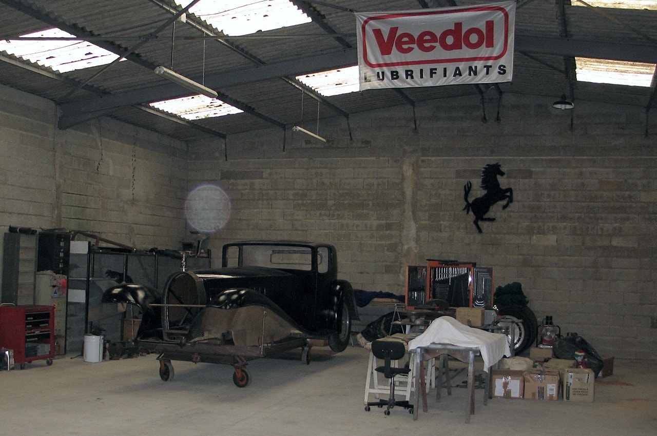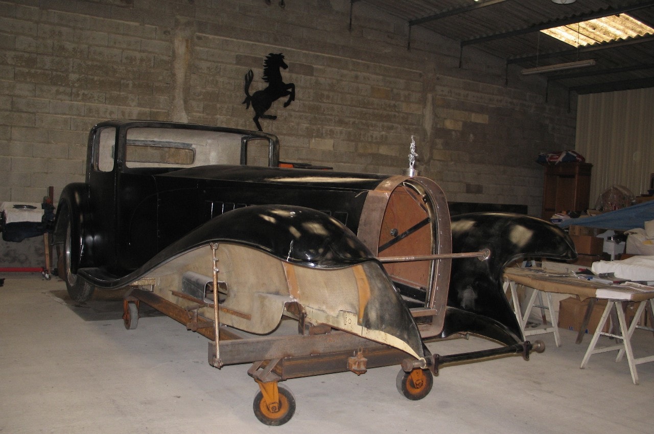 Arrivé sur place dans l’après-midi, je découvre une grosse bâtisse austère baptisée “manoir” et qui semble inhabitée, ainsi qu’un peu en retrait, un très grand hangar bondé de ferrailles, de carcasses de motos, de 4 voitures anciennes restaurées et de 4 autres en cours de restauration… et tout au fond… une coque de Bugatti Royale Type 41 Coupé Napoléon posée sur un bâti rouillé pourvu de 4 roulettes…