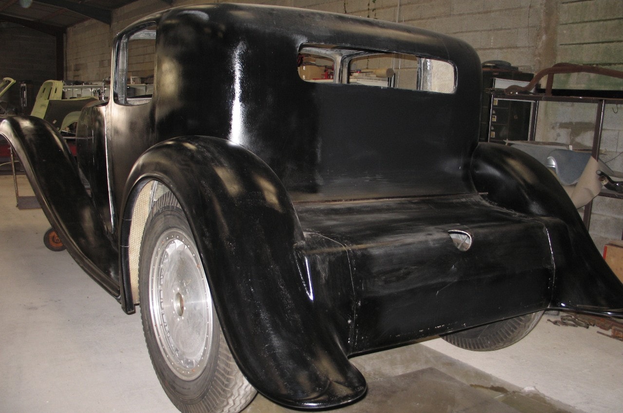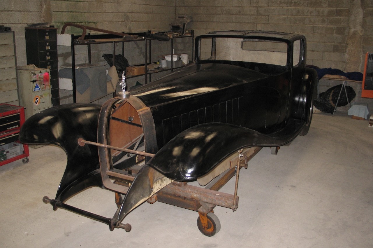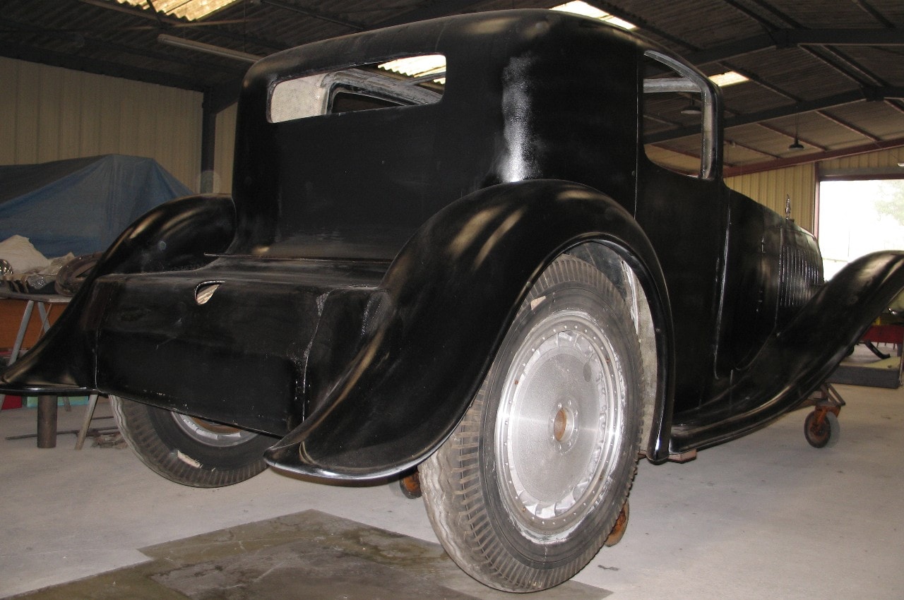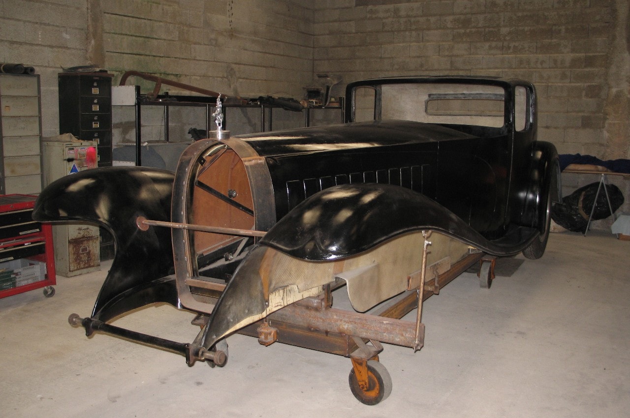 Arrivé sur place dans l’après-midi, je découvre une grosse bâtisse austère baptisée “manoir” et qui semble inhabitée, ainsi qu’un peu en retrait, un très grand hangar bondé de ferrailles, de carcasses de motos, de 4 voitures anciennes restaurées et de 4 autres en cours de restauration… et tout au fond… une coque de Bugatti Royale Type 41 Coupé Napoléon posée sur un bâti rouillé pourvu de 4 roulettes…