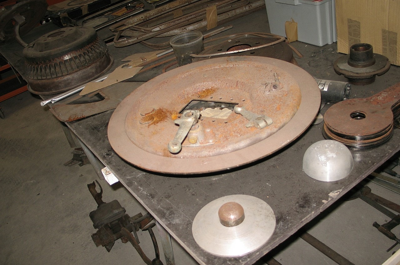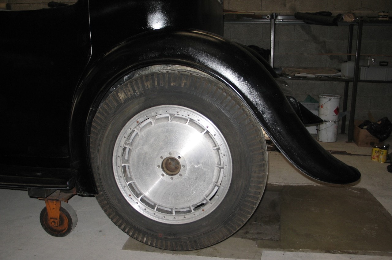 Les phares sont quasi déchromés d’usure, la glace est floutée/usée, les entourages de vitres n’ont rien à voir avec la Bugatti, ils sont tout pourris/rouillés et viennent d’une épave de Traction avant Citroën… quant aux tambours, ils sont dans ce même état et n’ont manifestement jamais été adaptés à l’essieu ni aux jantes de 24 pouces Bugatti qui sont les seules “pièces authentiques” de ce bitza…