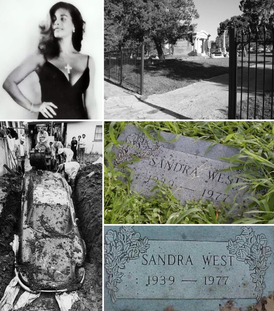 En mai 1977, Sandra Ilène West, seulement vêtue d’une chemise de nuit transparente comportant des dentelles de Brugge, assise au volant de sa Ferrari 330 America 1964, bleue layette métallisé, a été enterrée dans un mausolée en béton, selon les instructions de son testament…, cette (jeune, 37 ans, née en 1940, décédée en 1977) veuve d’un pétrolier texan, était morte d’une surdose “accidentelle” de médicaments, à son domicile de Beverly Hills.