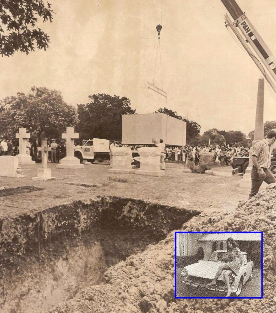 La boîte contenant Mme West (habillée selon ses instructions et le siège ajusté en conséquence) et sa bien-aimée Ferrari 330 America ont été descendues dans la longue fosse, puis recouvertes de ciment…, le directeur des funérailles indiquant que le ciment avait été ajouté parce que le cimetière se trouvait dans une zone de criminalité élevée et qu’il craignait que la voiture ne soit de retour dans la rue en un jour !