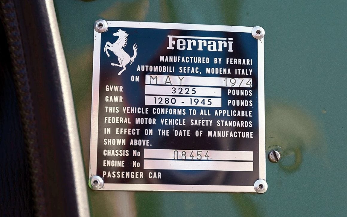 – La plaque d’identification de la Dino 246 GTS châssis #08454 (photo ci-après) est “trop neuve pour être honnête”… et les chiffres “gravés” (MAY 1974) sont différents des chiffres gravés du numéro de châssis (08454), cela se remarque avec le chiffre “4”… tout cela n’est manifestement pas un travail “d’usine”…, de même que la frappe “faite main” (chiffre après chiffre de manière irrégulière) au marteau…
