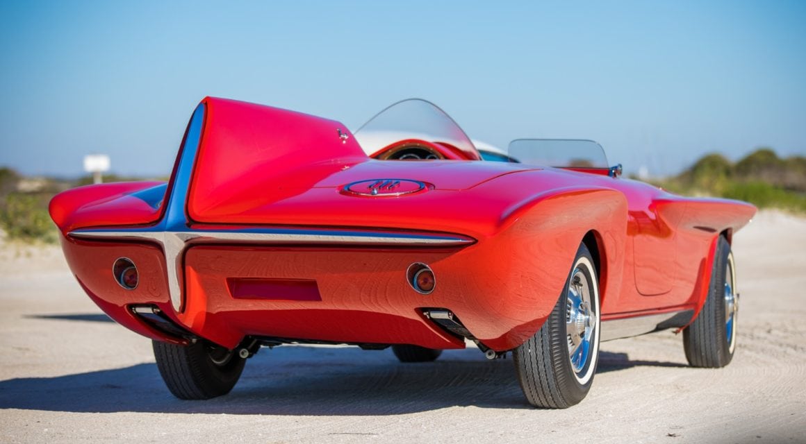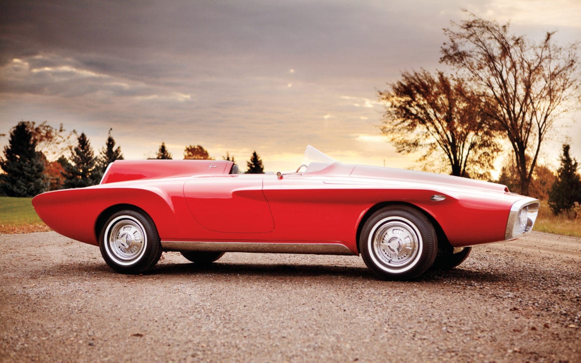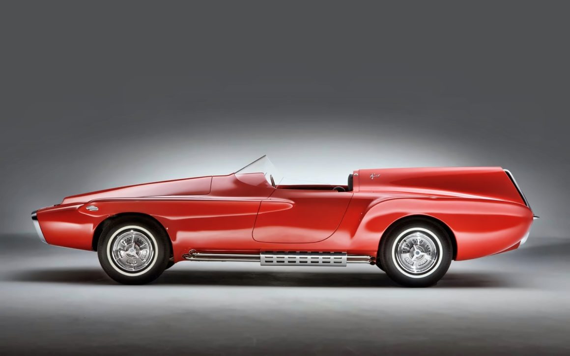 Exner avait été tout simplement inspiré par la 1930 Studebaker bicéphale Indy car qu’il avait réalisé lorsqu’il travaillait à South Bend… et dont il voulait réaliser une version moderne, le moteur de la Valiant (un slant-six) paraissait être le moteur idéal pour cette application qui s’inspirait de la Jaguar D’Type.