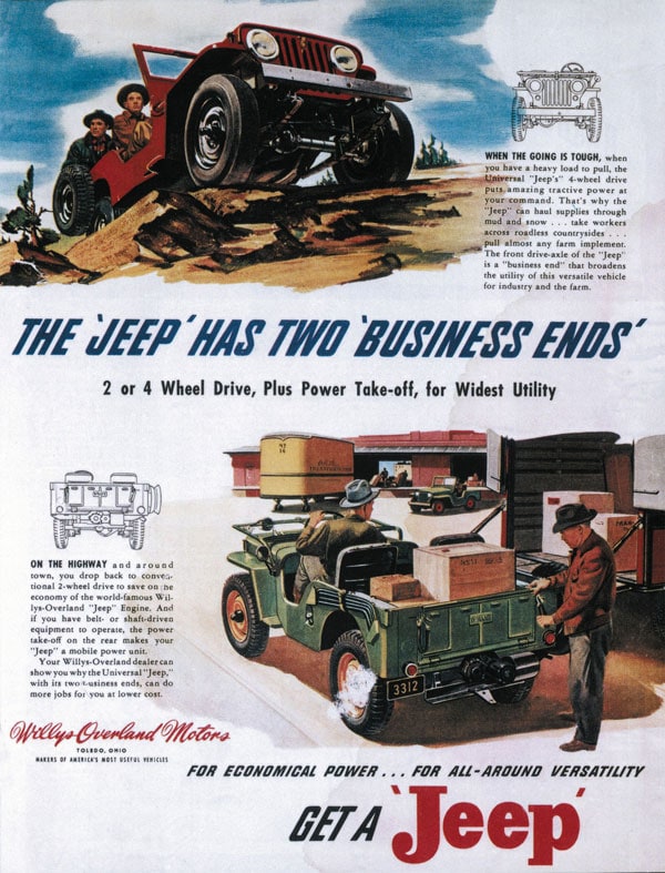 Jeep CJ-2A et CJ-3A : La première Jeep grand public, la CJ-2A, a été fabriquée en 1945… les publicités de Willys en faisaient la promotion à titre de véhicule de travail pour les fermiers et les ouvriers du bâtiment… elle était équipée d’un hayon, d’une roue de secours fixée sur le flanc, de phares plus volumineux, d’un bouchon à essence externe et de nombreux autres éléments dont ses prédécesseurs militaires n’étaient pas dotés. La Jeep CJ-2A est fabriquée pendant quatre ans et 1948 est l’année du lancement de la CJ-3A, très semblable au modèle précédent mais présentant un pare-brise d’un seul tenant tout en conservant le moteur à quatre cylindres en L d’origine… elle sera reactualisée en 1953 pour devenir la CJ-3B.