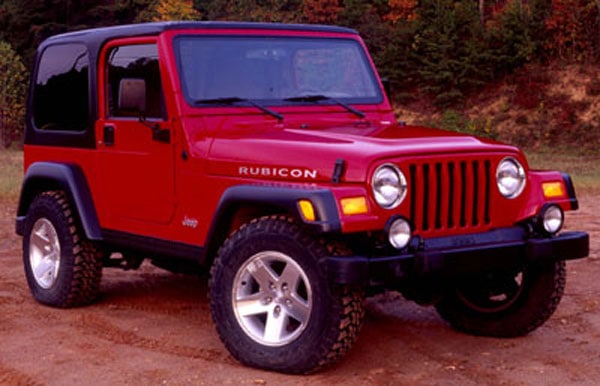 Jeep Wrangler Type TJ : Pour marquer son achat, pour 1988 Chrysler change la face avant de la Wrangler YJ, les phares rectangulaires font place à des phares ronds, la Jeep Wrangler Type TJ récupère ainsi beaucoup de l’ancienne CJ-7… son look “rétro” est tout à fait délibéré mais du point de vue mécanique elle est aussi très différente… presque 80% des pièces du véhicule sont de conception inédite. Terminés les essieux rigides, la TJ est équipée d’une suspension à quatre points d’encrage, semblable à celle de la nouvelle Jeep Grand Cherokee et elle affiche un aménagement intérieur différent, avec des airbags conducteur et passager… elle a toutefois conservé plusieurs caractéristiques emblématiques de la Jeep YJ, telles que les phares ronds, le pare-brise rabattable (inauguré en 1940) et les portières amovibles, ainsi qu’une gamme de capotes ou de toits rigides escamotables. En 2003 apparaît la Jeep la mieux équipée jamais encore commercialisée, la Wrangler Rubicon équipée de suspensions avant et arrière type Dana 44 à système de verrouillage à déclenchement par bouton poussoir, d’une boîte de transfert à rapport de vitesse en gamme basse de 4:1, de pneus spéciaux de grand diamètre et de nombreuses autres options qui n’étaient disponibles sur aucune autre série de Jeep auparavant.