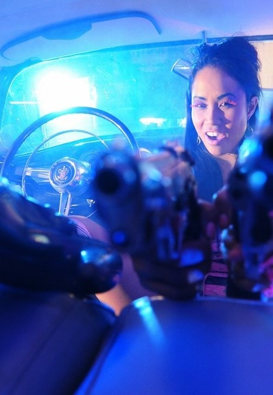 Deux occurrences s’animent alors : d’une part, on s’aperçoit dans cette prémisse narrative, qu’est donné une importance forte à l’automobile, question d’époque puisqu’il s’agit d’une Buick Spécial Eight 1957…, peut-être, de mode dramaturgique aussi puisque la jeune femme est chinoise et brandit un révolver et un pistolet (mais pourquoi ?)…, d’autre part, à cause de l’ambiance créée par des fumigènes et des éclairages multicolores…, force vous est d’accepter l’automobile dont on ne voit rien d’autre que des éléments illustratifs…, comme symbole fort d’une existence sociale misérable qu’on espère améliorer, la jeune femme des photos n’ayant absolument pas le profil imagé d’une bourgeoise en devenir au volant d’une Rolls-Royce…