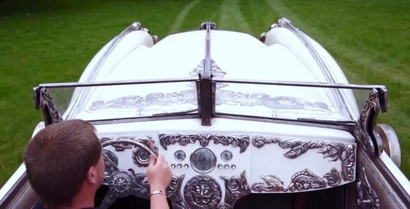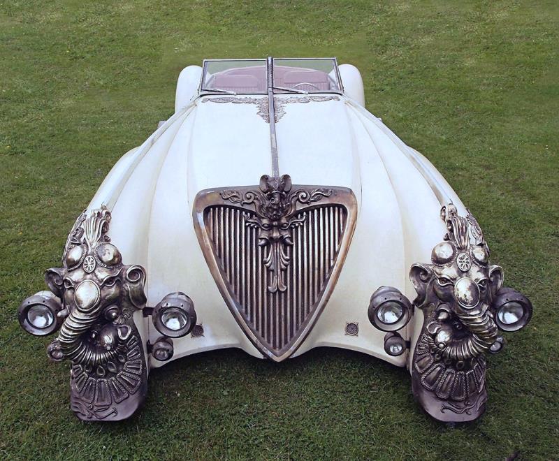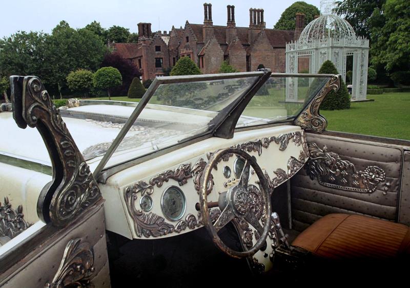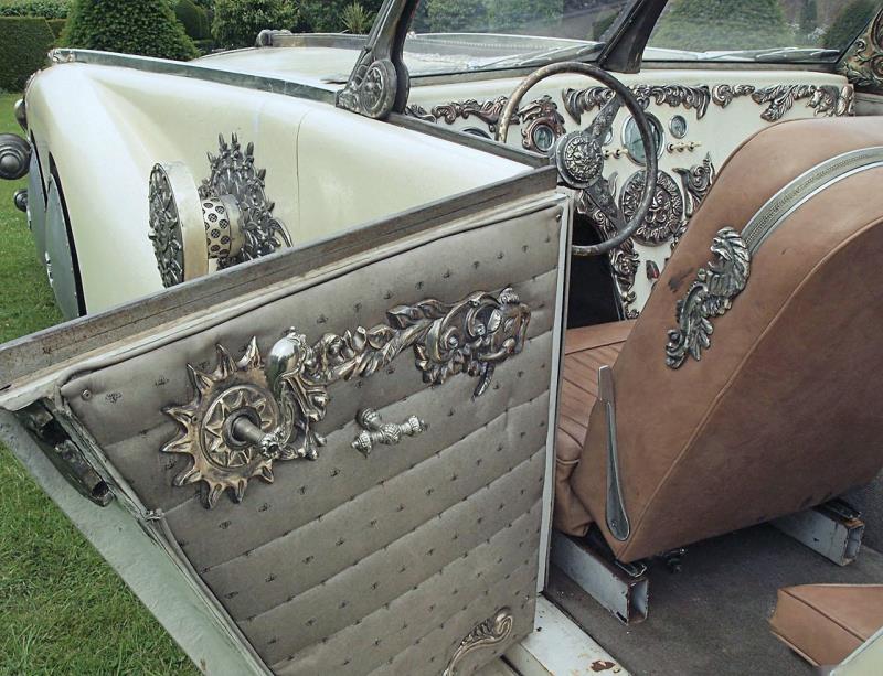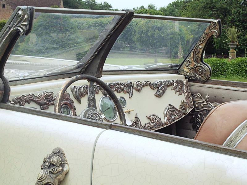 À l’avant, de chaque côté de la calandre, ornant la grande grille de radiateur, se trouvent deux représentations de Ganesh, le dieu hindou…, le motif de l’éléphant est répété sur les poignées de porte, tandis que sur divers autres éléments de la carrosserie se trouvent des sculptures représentant divers autres dieux et symboles…, ces fioritures spectaculaires sont finis dans une couleur imitant l’or semblant âgé et patiné…, le même niveau d’attention dans les détails décoratifs continue dans “le poste de pilotage” (sic !), avec des moulures complexes fixées un peu partout, tandis que la sellerie est réalisée en faux cuir marron clair avec une bande argentée.