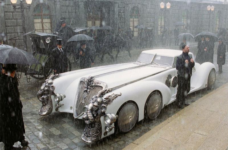 Le travail de peinture blanc cassé semblant écaillé et fissuré a été peaufiné via quelques fausses réparations mineures et des changements volontaires de couleur qui parsèment la carrosserie, pour donner l’illusion que la voiture est régulièrement utilisée par le capitaine Nemo et qu’elle a subi diverses réparations en cause de ses aventures déjantées (le hard top d’origine a été perdu et n’est plus présent sur cette voiture). Il n’y a eu que deux voitures construites pour le film, celle-ci est la seule version complète qui roule et fonctionnement comme une vraie voiture (sic !)…, l’autre n’était qu’une carcasse batie sur un échafaudage fixé en permanence autour des sièges pour accueillir les caméras pour des gros plans sur les acteurs.