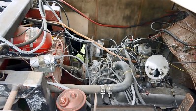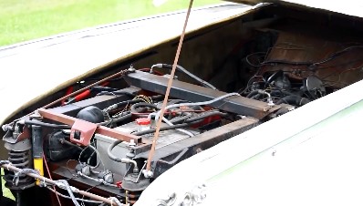 Elle est “consolidée” par un sous-cadre en acier dans le compartiment moteur pour accueillir un moteur Range Rover V8 tout pourrave… et deux trains avant directionnels (faits de brics et de brocs) selon les plans de la fameuse Panther-Six (les 6 roues sont des 28 pouces (72 cm) de diamètre)…, notez encore que l’ensemble de la voiture se soulève et s’abaisse de façon spectaculaire grâce à un système hydraulique récupéré d’une Buick Low-Ridder.