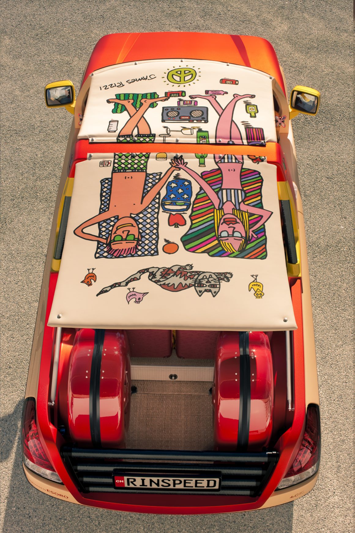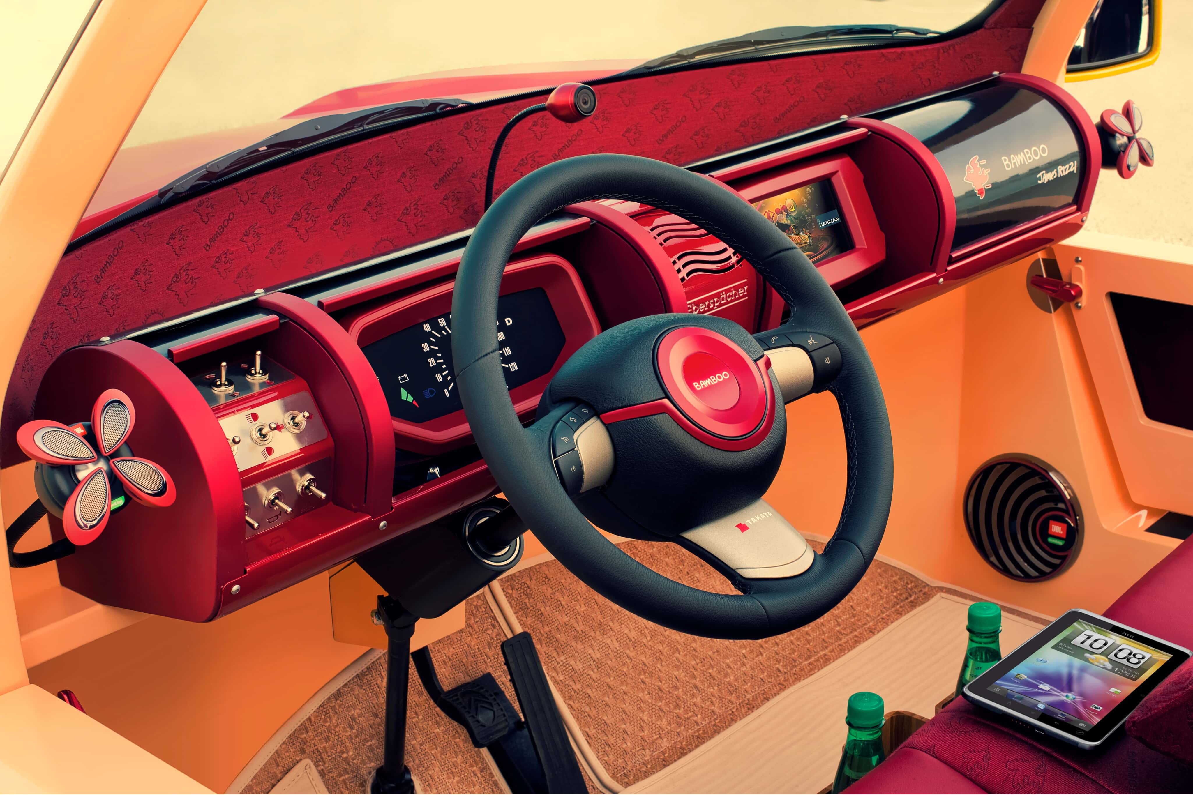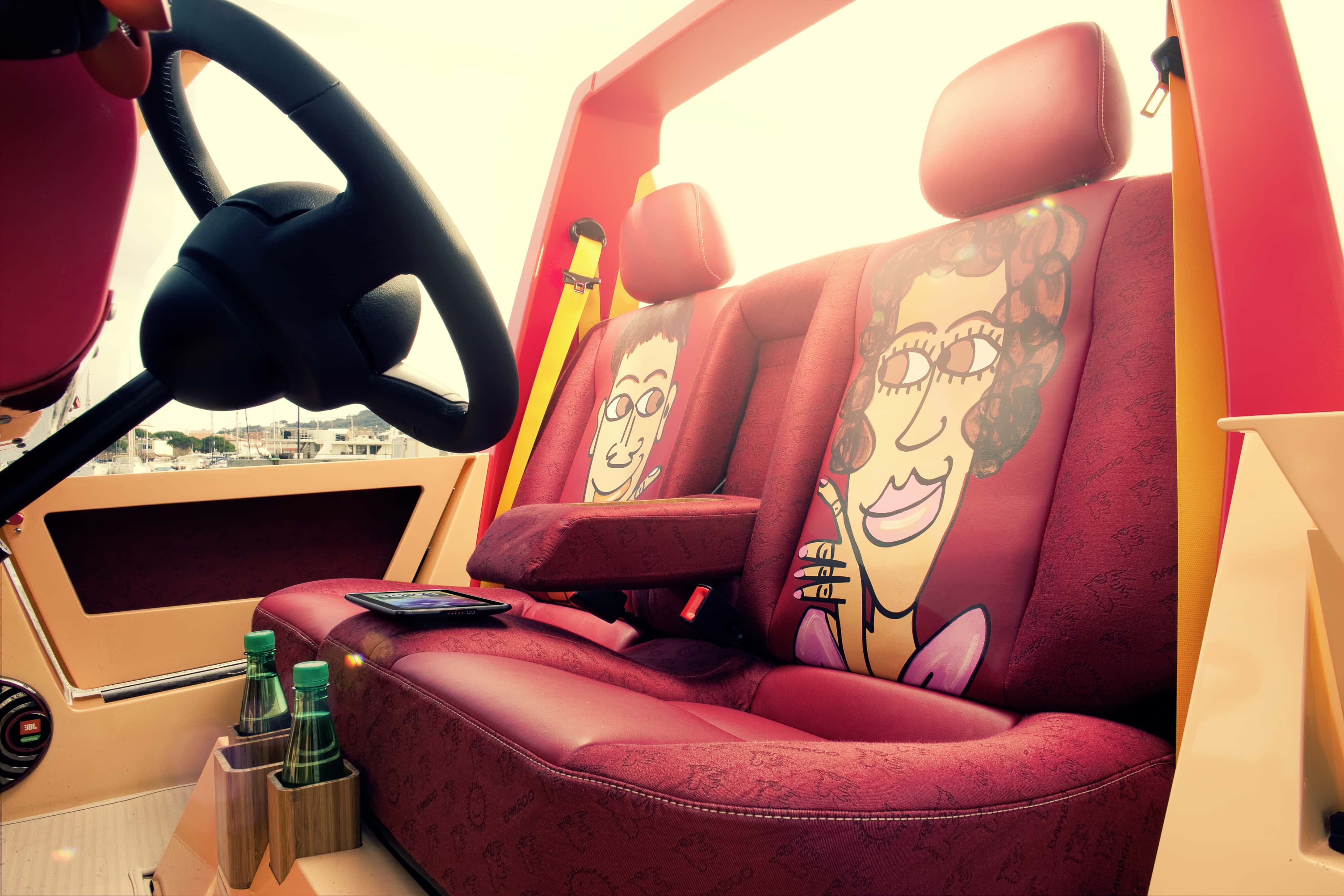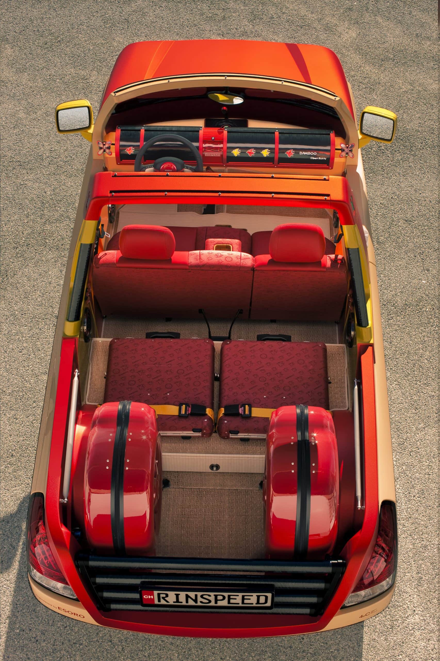 Bénéficiant d’une décoration du plus pur genre “pop” signée par l’artiste new-yorkais James Rizzi, fortement inspiré des années ’70…, la Rinspeed Bamboo suggérait l’image de… Brigitte Bardot et de son ex-playboy Gunther Sachs débarquant (au grand plaisir des paparazzi) à St-Tropez…