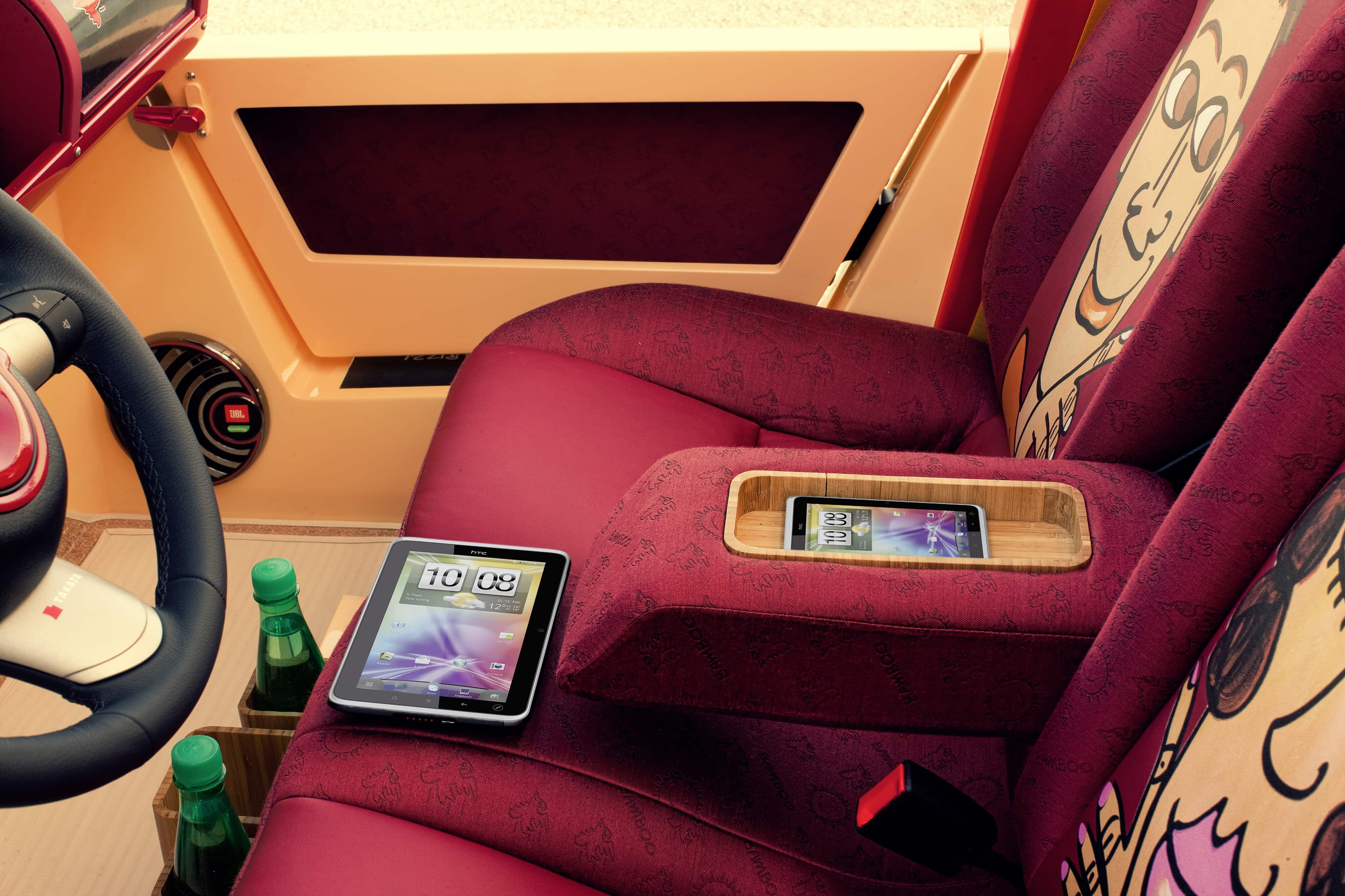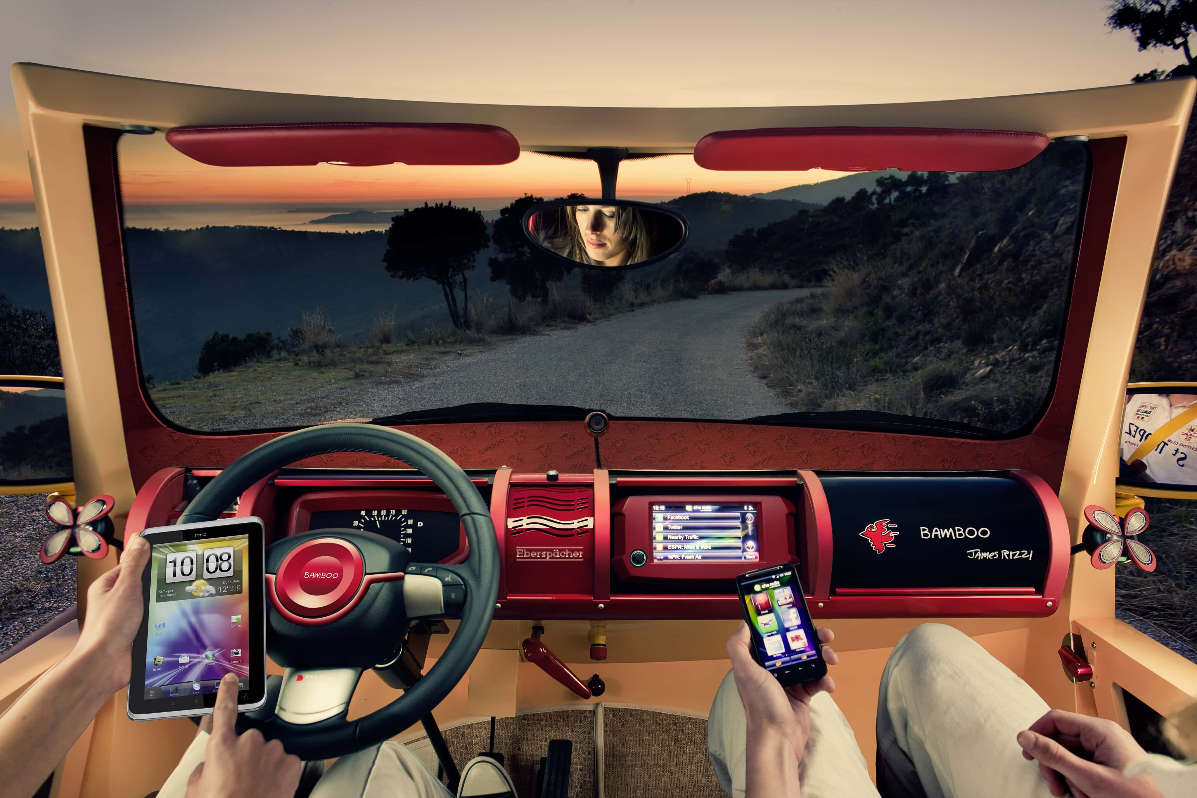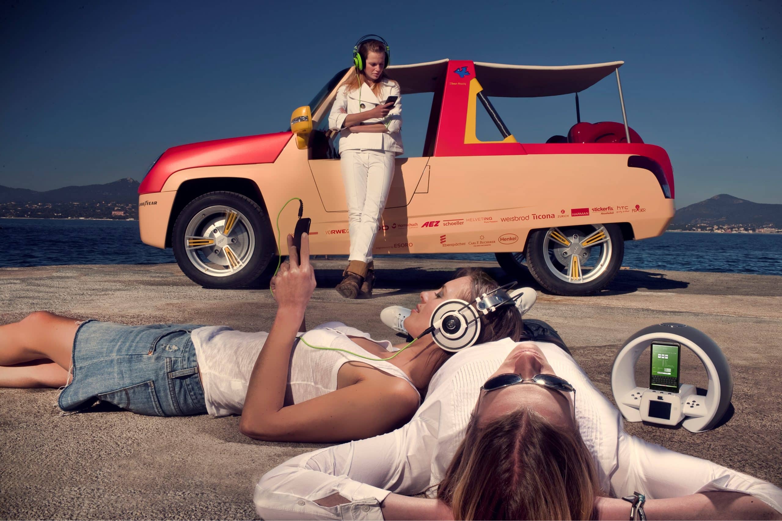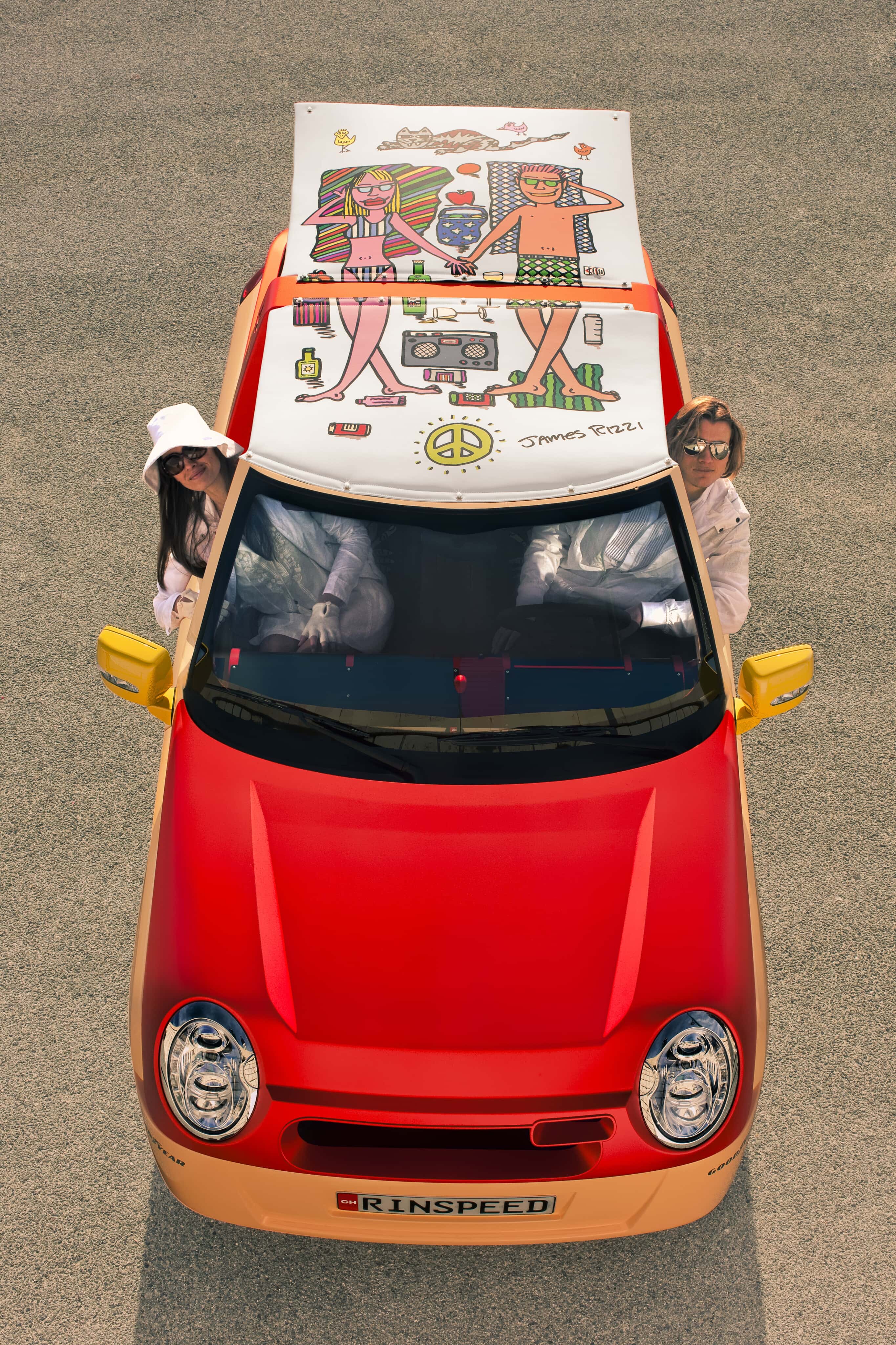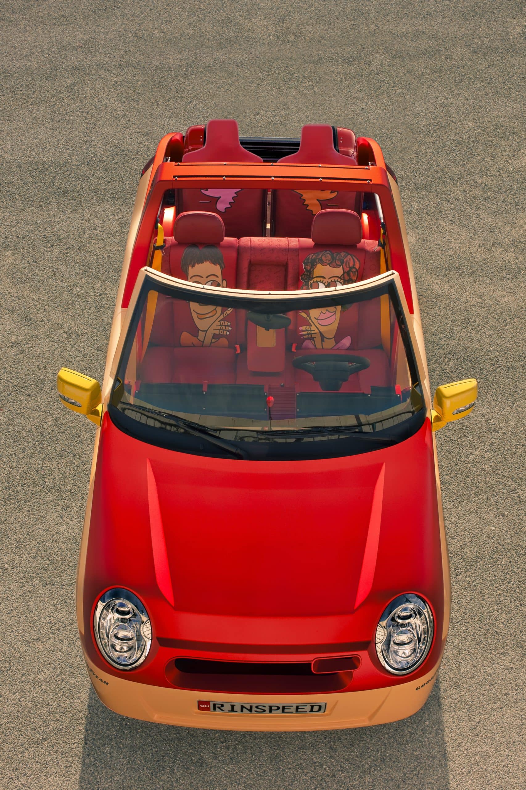 Bénéficiant d’une décoration du plus pur genre “pop” signée par l’artiste new-yorkais James Rizzi, fortement inspiré des années ’70…, la Rinspeed Bamboo suggérait l’image de… Brigitte Bardot et de son ex-playboy Gunther Sachs débarquant (au grand plaisir des paparazzi) à St-Tropez…