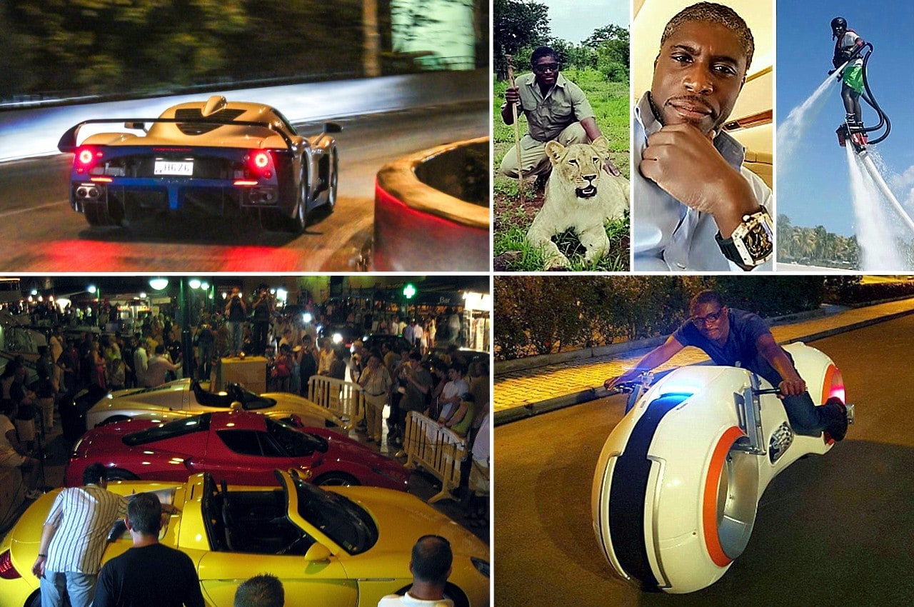 Sa préférée était une Bugatti Veyron bleue, une voiture qui peut atteindre plus de 400 km/heure et qui, neuve, vaut environ 2 millions de dollars…, un soir, Teodorin gara son jouet près de l’entrée de L’Ermitage, un endroit où il aimait prendre un verre…, quand il vit les badauds qui s’arrêtaient pour l’admirer, il renvoya Giacalone à Malibu en taxi pour qu’il revienne avec sa deuxième Bugatti et la gare à côté.