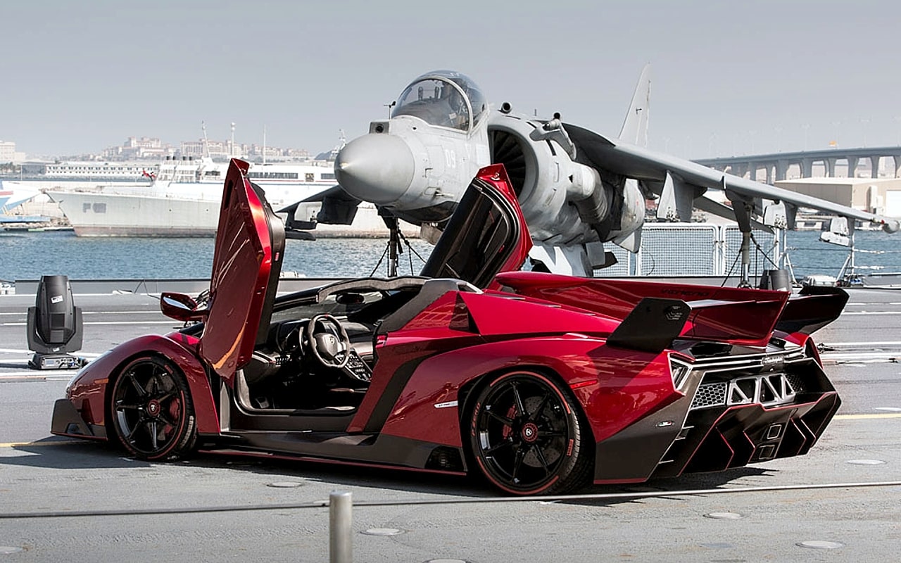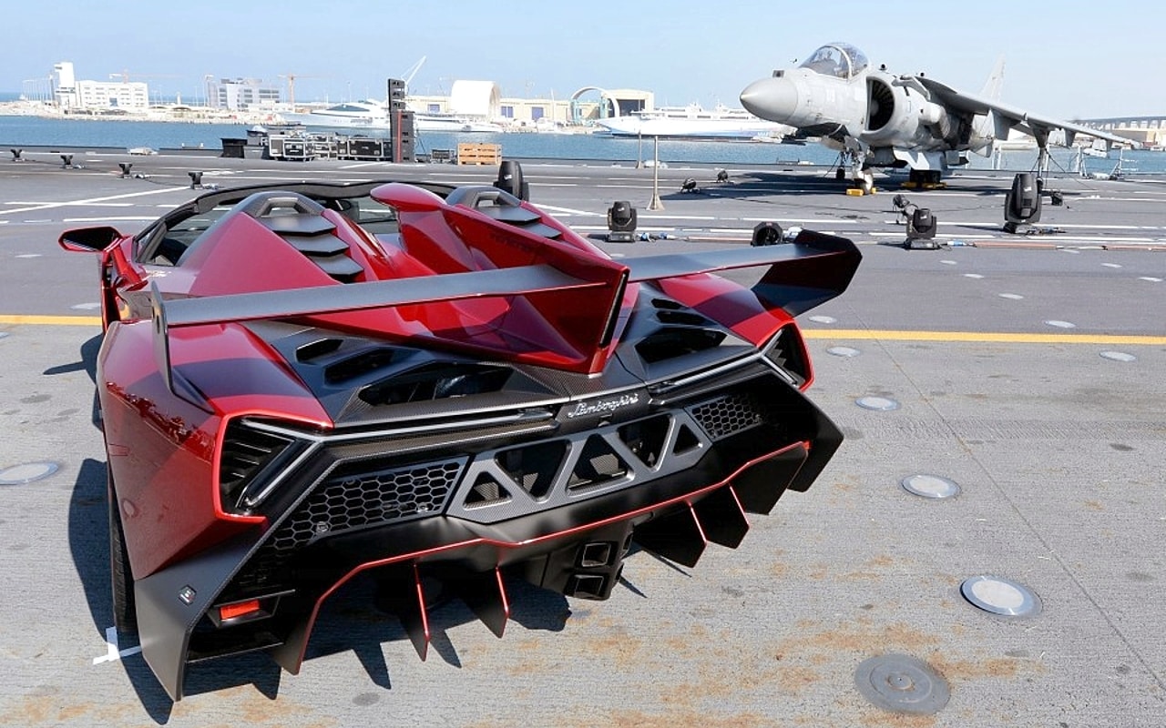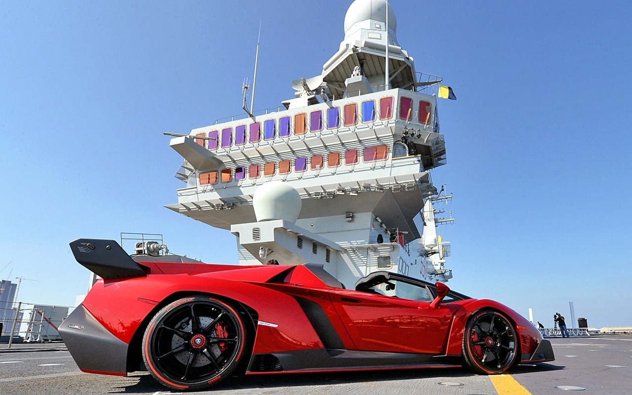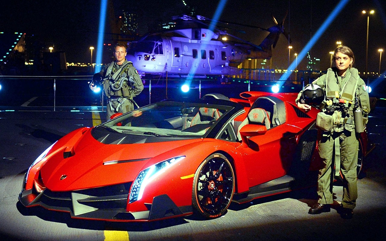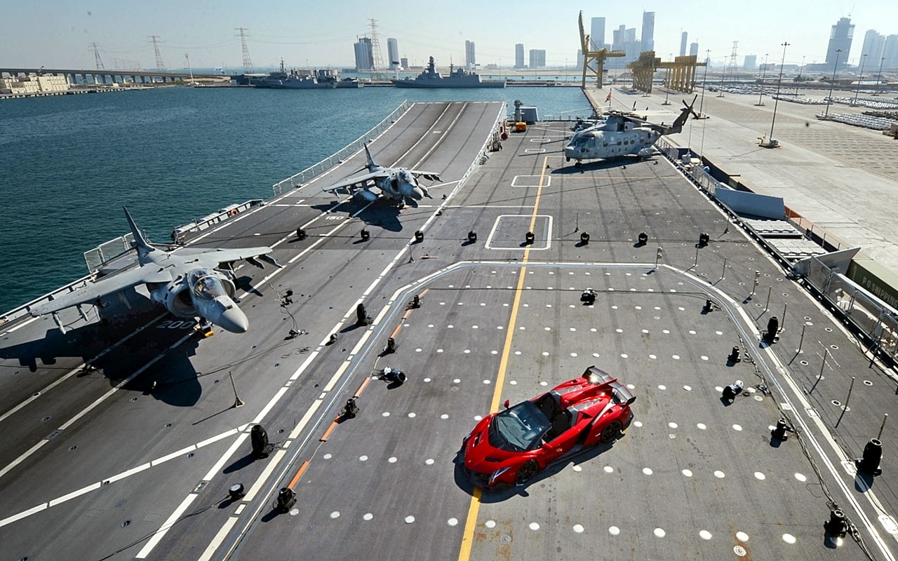 La Veneno Roadster exposée sur le pont d’envol, y avait été présentée à des invités triés sur le volet dont plusieurs dignitaires parmi lesquels se trouvaient Giorgio Starace, l’ambassadeur d’Italie aux Etats-Arabes-Unis et Paolo Treu, amiral des forces navales en haute mer de la marine italienne (qui avait assuré que grâce à lui, la Vénéno ne ferait pas naufrage)…, tout cela faisant peur, car tant de personnalités du gouvernement et de la marine militaire de l’Italie affectés à cette mission surréaliste uniquement destinée à vendre une Veneno “Bling-Bling” de 3,5 millions, laissait à penser quantité de “choses” négatives…
