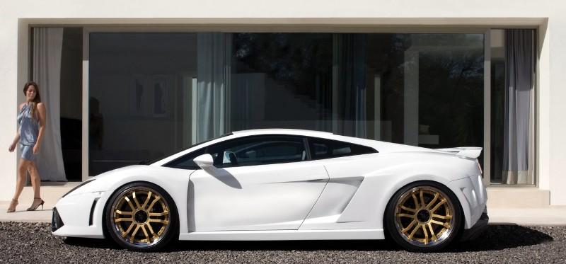 La Gallardo reçoit un kit carrosserie très imposant avec des passages de roues élargis et équipés d’ouies, le spoiler avant est plus massif encore et la poupe est carrément munie d’un gros diffuseur en fibre de carbone en plus d’un aileron.