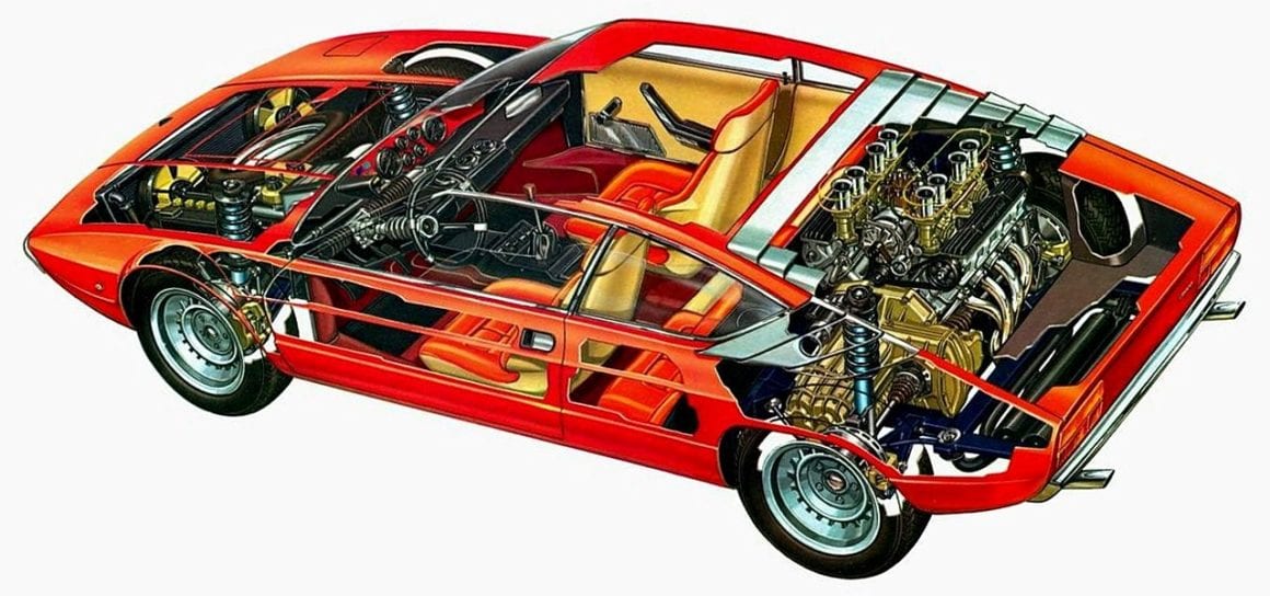 Paolo Stanzani dessina donc un nouveau V8, ouvert à 90° comme les bras ouverts d’un homme pieux à la prière du divin, de surcroit il était plus facile à construire et moins coûteux…, l’Urraco devant être une 2 + 2 à moteur central transversal, ce groupe devait être particulièrement compact (sa largeur n’excédera pas les 70 centimètres fatidiques par ailleurs indiqués dans divers écrits saints)…, et, contrairement à la Miura, la boîte de vitesses Lamborghini à cinq rapports fut ici placée dans le prolongement du moteur.