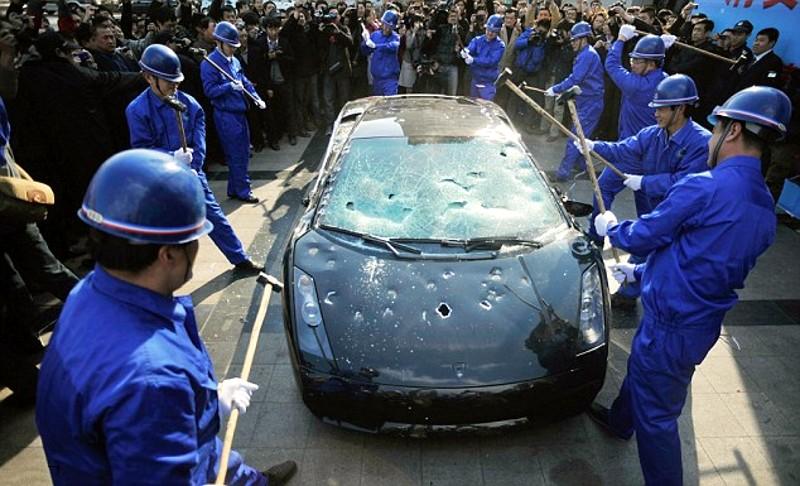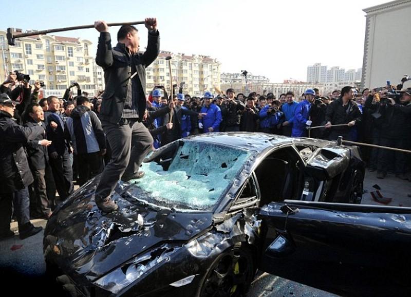 Aussi, l’autre jour, ai-je été agréablement surpris, puis transporté de bonheur, lorsque j’ai appris qu’un malheureux (mais très riche) propriétaire d’une Lamborghini-Audi-Gallardo, excédé par diverses pannes, dont une de moteur survenue deux mois après l’avoir acheté, a tout simplement demandé aux ouvriers de son usine de la détruire à coup de marteaux… ceci afin d’afficher mondialement son mécontentement envers la marque Lamborghini et sa concession Chinoise qui lui avait vendu en septembre 2010 pour trois millions de Yuan, l’équivalent de 400.000 euros (à cause des taxes d’importation en Chine, le prix s’y trouve multiplié par deux)…et qui n’a jamais réussi à la faire fonctionner correctement, notamment un problème d’allumage (et de démarreur) survenu le 29 novembre 2010 soit 2 mois après son achat !