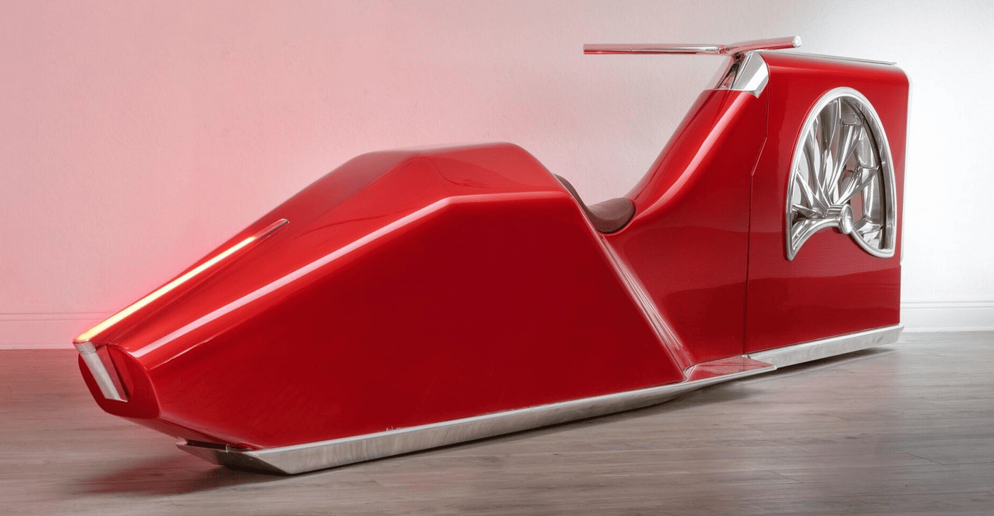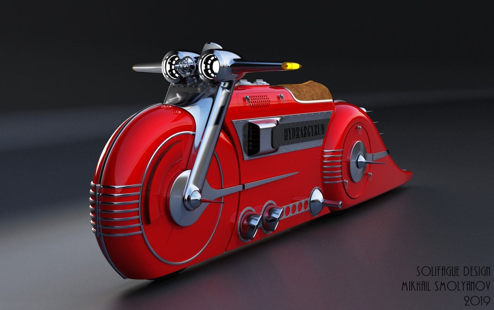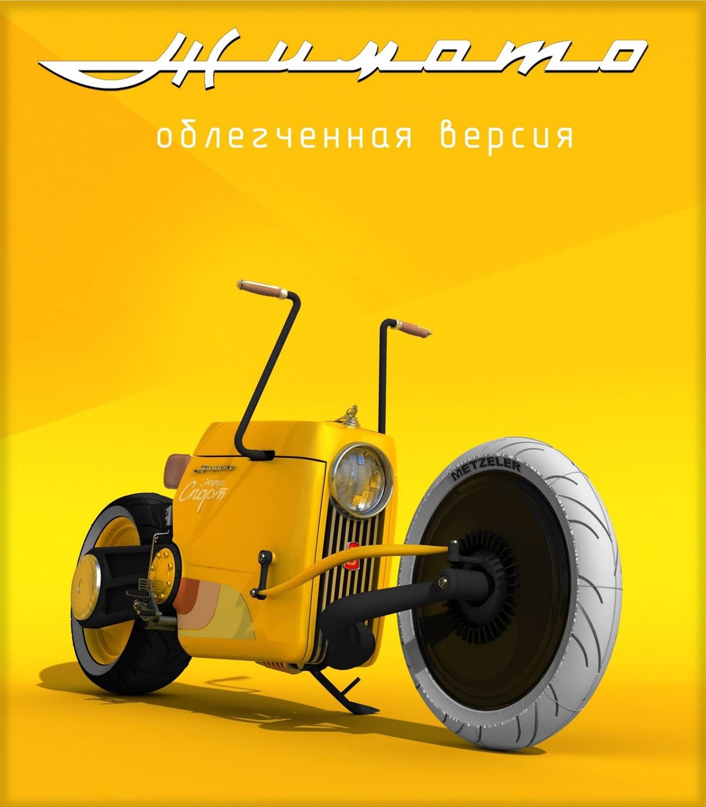 L’URSS a été dissoute l’année suivant la réalisation de la fresque de Dmitri Vrubel, mais l’influence de son imagerie, teintée de propagande et d’utopie, elle, s’est avérée pérenne. Je termine avec le designer russe Mikhail Smolyanov, ces Hot-Rods à moteurs Volga et ses motos électriques dont la roue avant est beaucoup plus grande et plus large que la roue arrière, son créateur voulant offrir la sensation de manipuler une manette dans un jeu vidéo. Les phares, comme les roues, ont également des tailles différentes et Smolyanov joue avec les couleurs comme éléments différenciateurs…