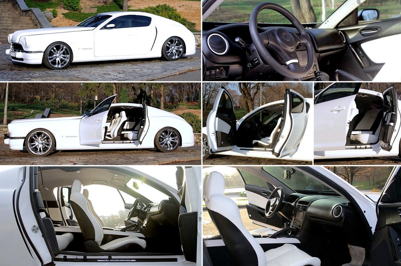 Vladimir Pochensko- De l’arrière elle rappelle la Bugatti Galibier, de l’avant elle s’inspire d’une Cadillac imaginaire…, en fait, ce n’est ni l’une, ni l’autre car elle est basée sur une Toyota Mark II de 2000 , la partie médiane est reconnaissable aux portes antagonistes provenant d’une Mazda RX-8…, les ailes et le couvercle de coffre… ont été entièrement réalisés à la main en métal. L’empattement est beaucoup plus grand que celui de la Toyota…, c’est pourquoi j’ai pu placer deux véritables fauteuils VIP à l’arrière.