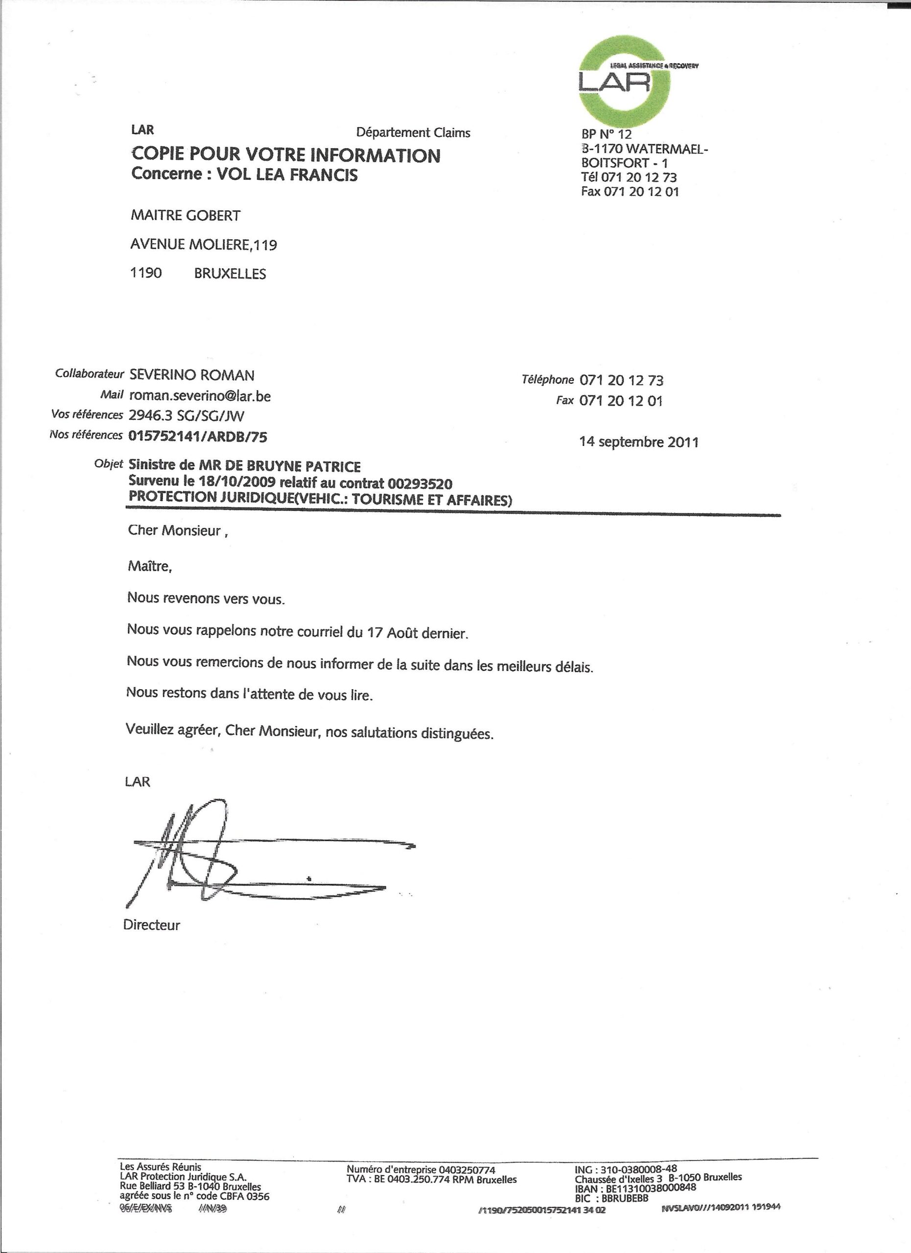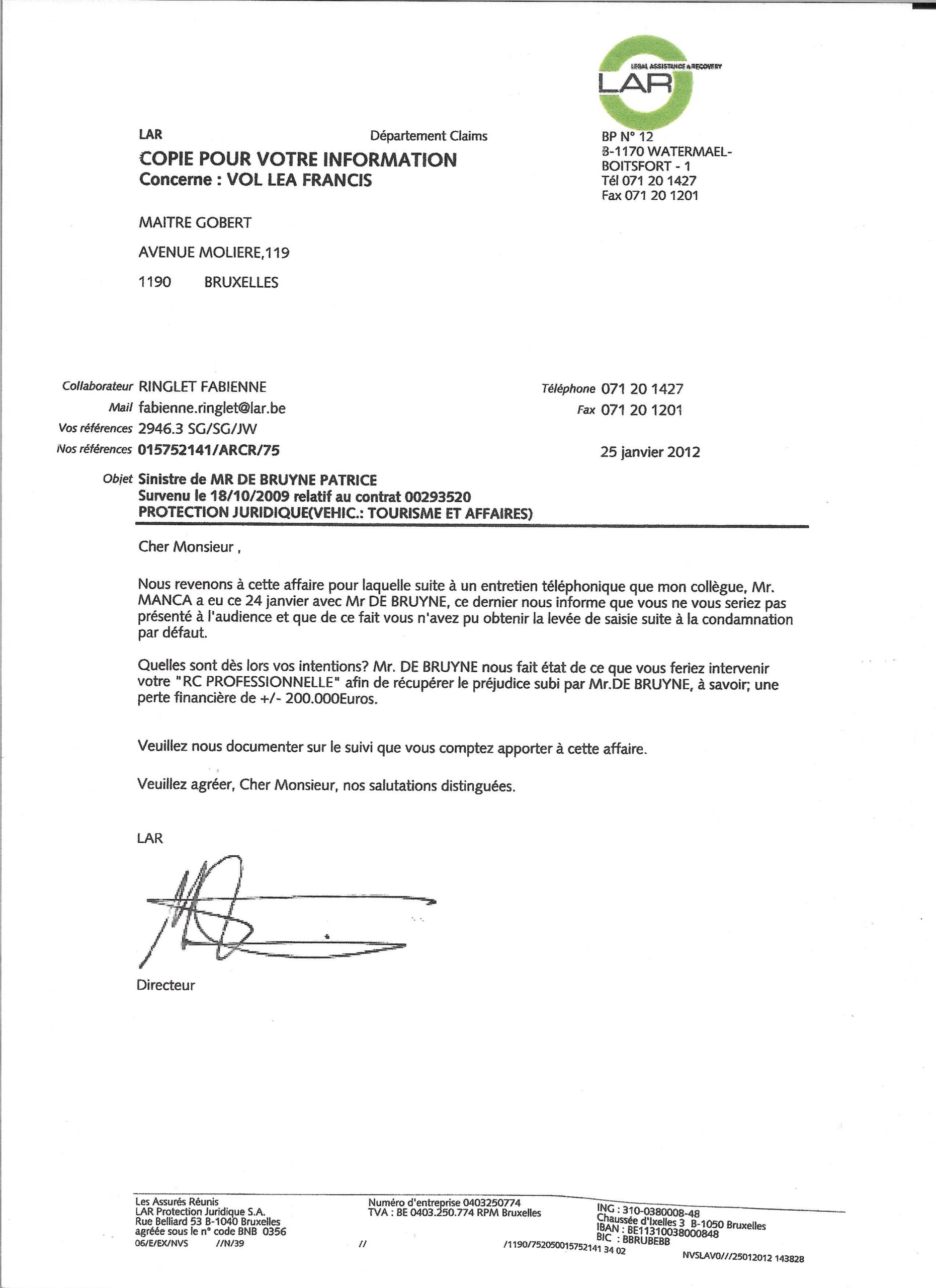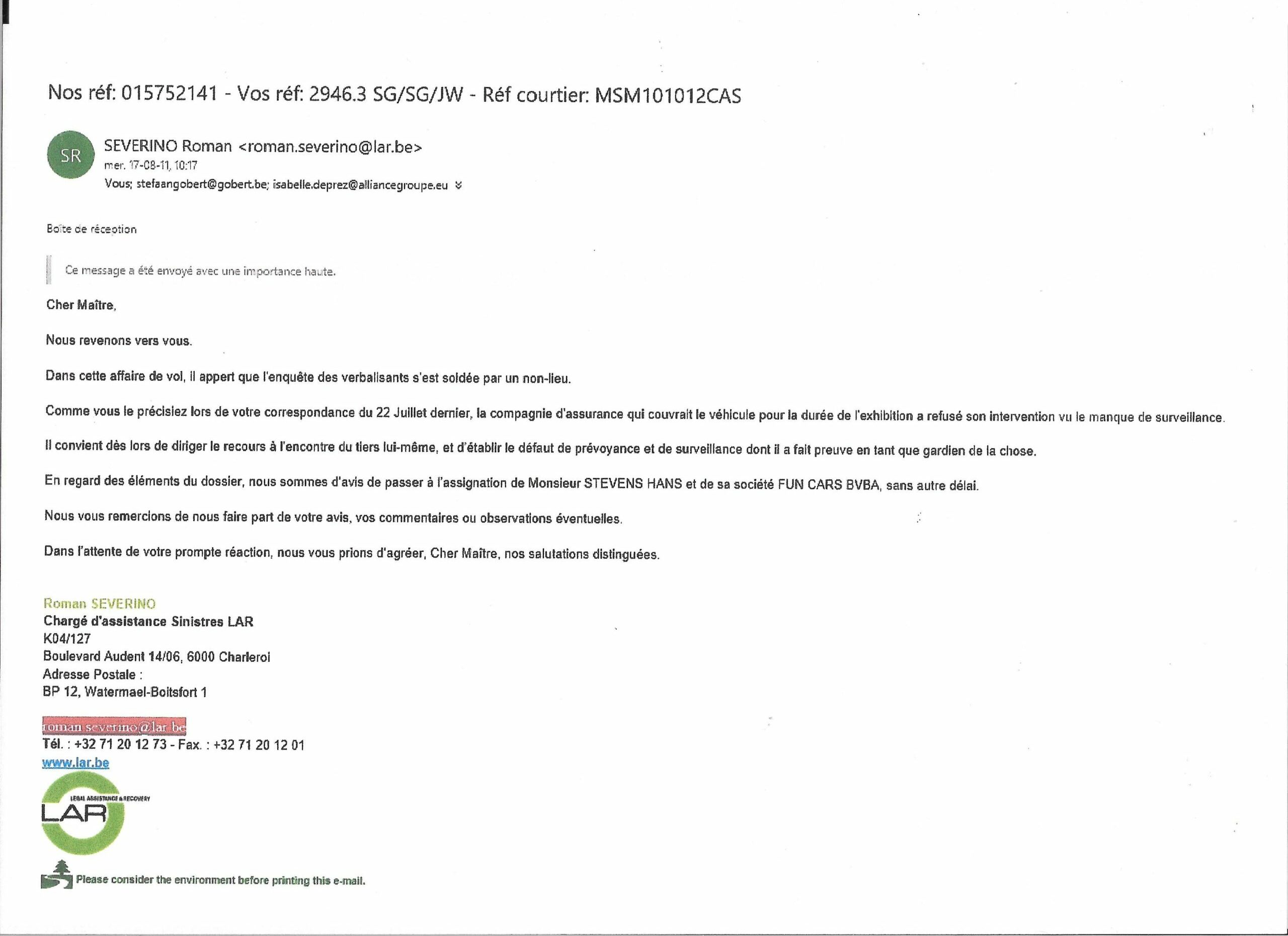 En finale de l’enquête de deux années qui a suivi le vol, la conclusion a été qu’aucun des éléments ne m’incriminaient. Ma compagnie d’assurance Défense en Justice AXA/LAR a donc demandé que j’assigne les revendiquants-organisateurs de l’exposition en responsabilité civile en tant que gardiens du véhicule qu’ils m’avaient demandé que je leur confie pour un montant conventionnel issu d’une convention entre-parties, étant précisé que selon leurs relation avec AXA, c’est AXA ART Versicherung AG qui était leur assureur en Responsabilité Civile. Mon avocat d’alors a assigné AU CIVIL devant le Tribunal de première instance néerlandophone de Bruxelles en 2010 resp. 2012, le numéro du rôle étant 2011/927/A (pièce 7 de la procédure au fond)