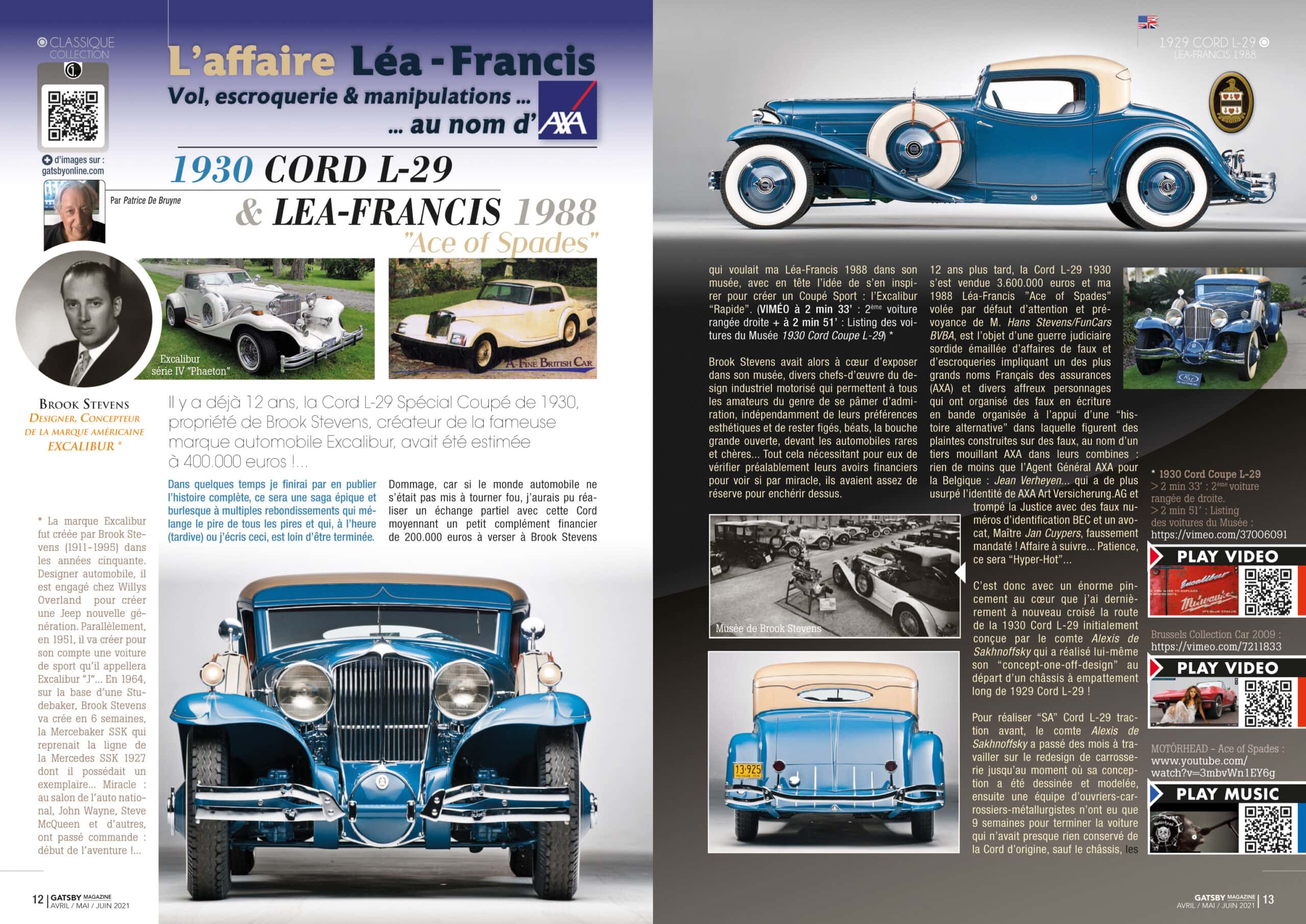 C’est son estimation d’il y a 12 ans de 400.000 euros qui m’avait attiré vers un deal potentiel entre cette Cord L-29 Spécial Coupé 1930 (alors propriété de Brook Stevens, designer, concepteur et constructeur des fameuses Excalibur) et ma Léa Francis Ace Of Spades 1988, avant que Mr. Hans STEVENS, l’organisateur du show d’automobiles FunCars BVBA (situé en Belgique) organise son vol !