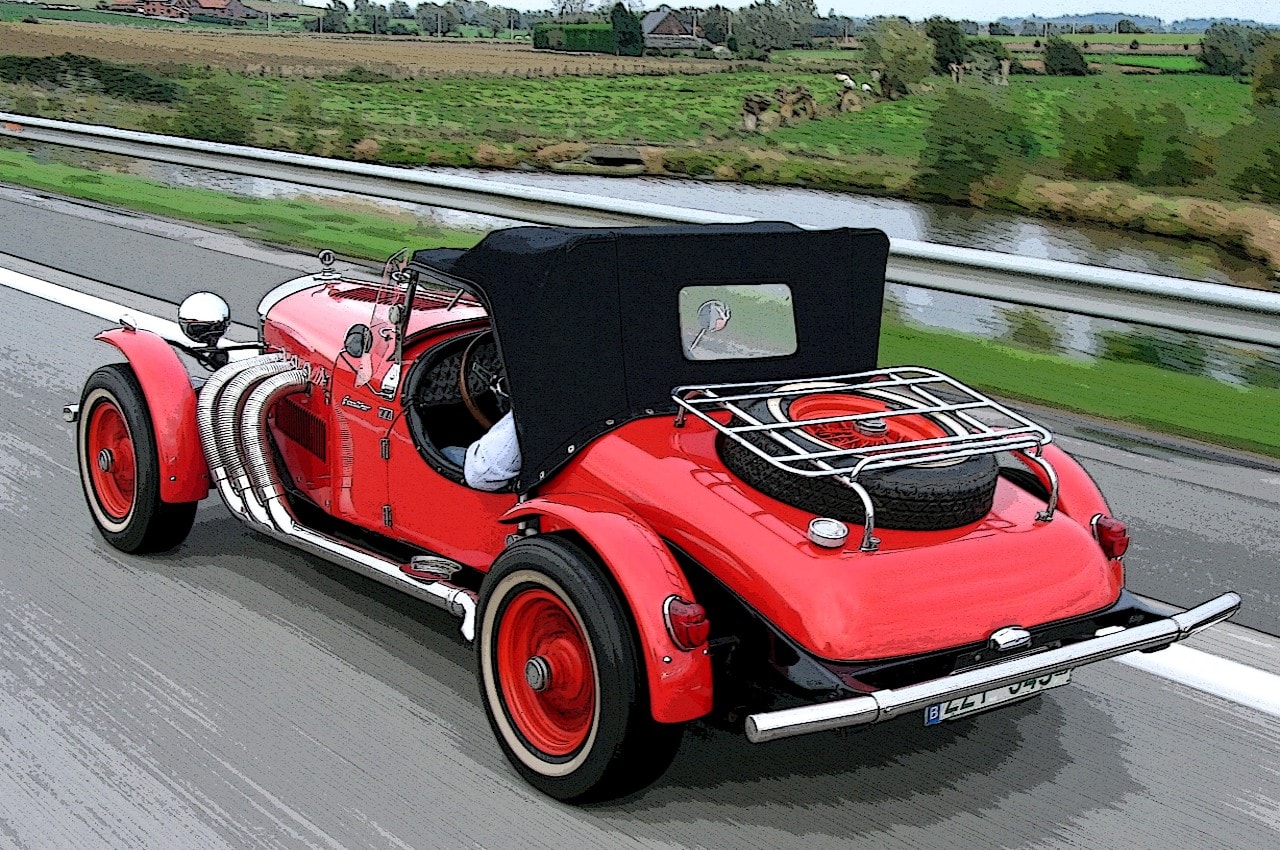 Inspirée vaguement de la Bugatti type 35, celle-ci était construite chez et par Michelotti à Turin… avec les trains roulants et le moteur 6cylindres de l’Opel Commodore.