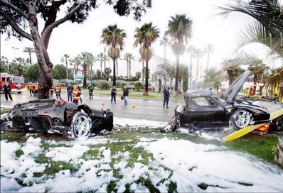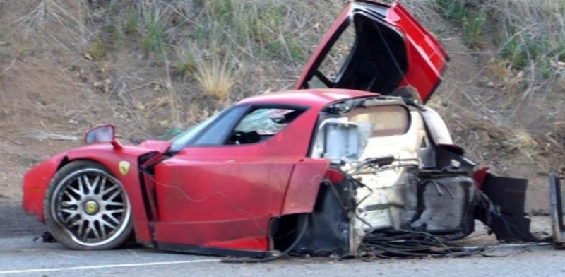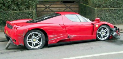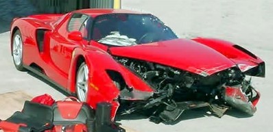 Au besoin, les sous-minorités groupusculaires d’ultra orthodoxes qui roulent en Fiat jugeant les changements trop radicaux, purent encore rêver à des jours meilleurs, en dépit de la contribution zélée de l’Enzo à une insécurité routière quasi chronique, puisque tout observateur, même non qualifié, se sera rendu compte que toutes les Enzo Ferrarire se brisaient en deux parties, toutes exactement au même endroit, à la séparation de l’habitacle et du compartiment moteur…, vous le voyez en regardant la photo de l’Enzo accidentée à l’avant (et qui a aussi été sectionnée derrière l’habitacle).