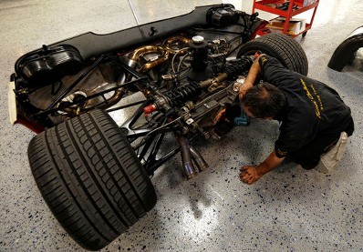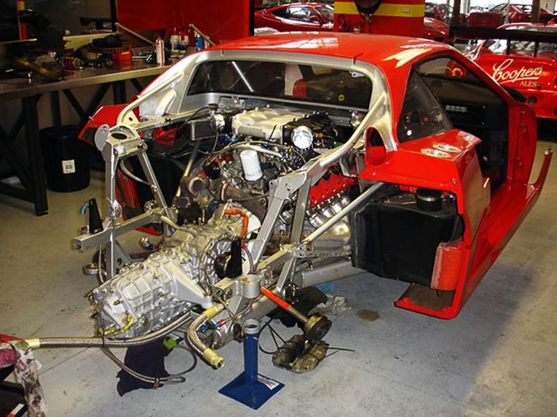 Sans rentrer dans des détails sordides, sachez que les Enzo n’ont plus de châssis en tubes de ferrailleries, mais une simple structure en plastique habillé de carbone qui se termine derrière l’habitacle, là ou vient se boulonner le faux-châssis arrière sur lequel sont fixés : le moteur, la boîte et le train roulant AR avec ses suspensions, ainsi que le capot…